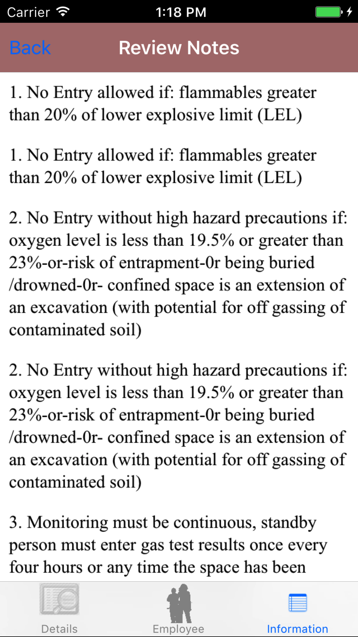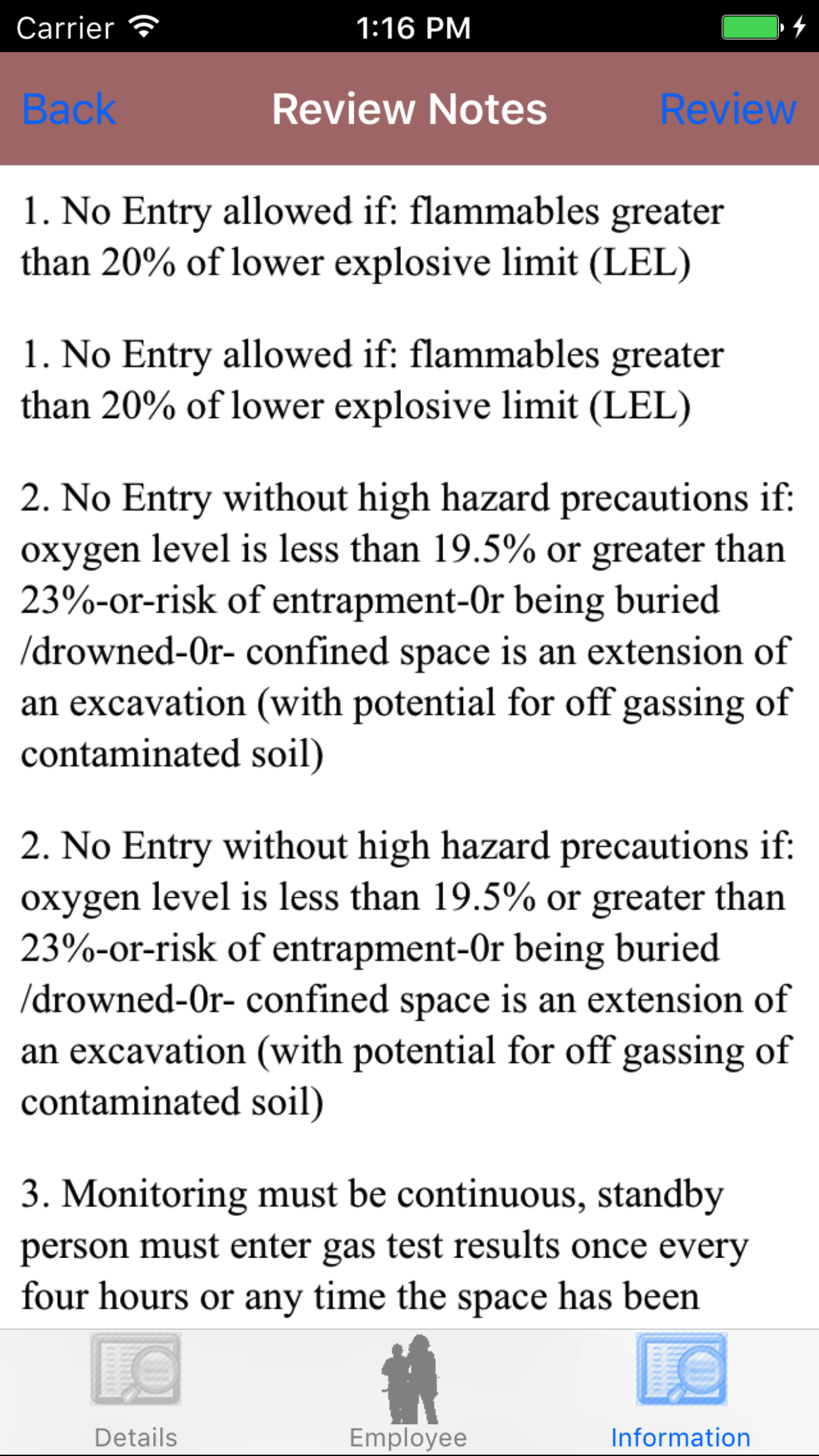 Companies create their own confined space review notes, which staff must review every time they perform a confined space entry. The notes will load on this view