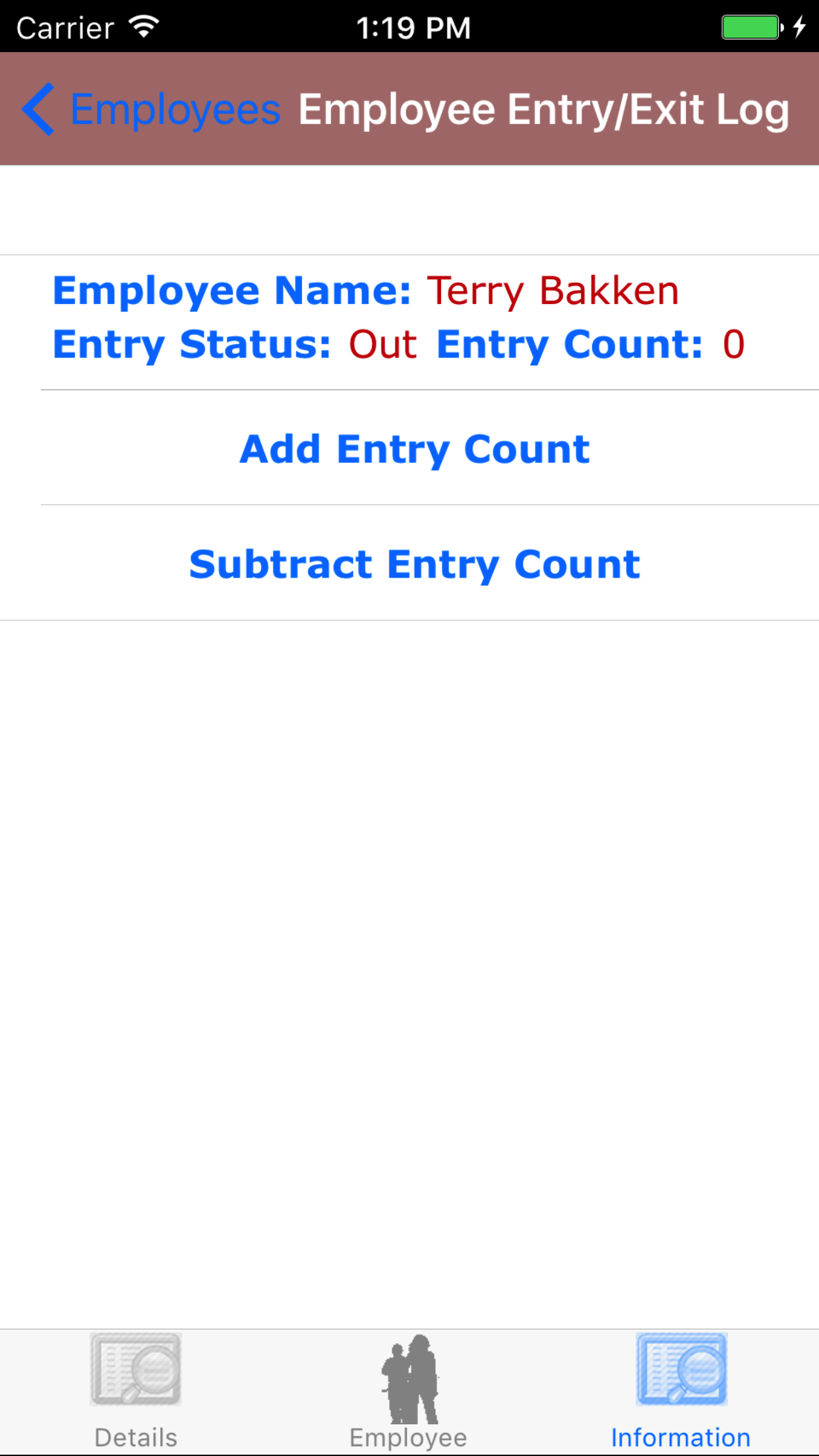 - Tap the Subtract Entry Count button, to changed the status of the employee. Tapping the subtract entry count will decrease the count.