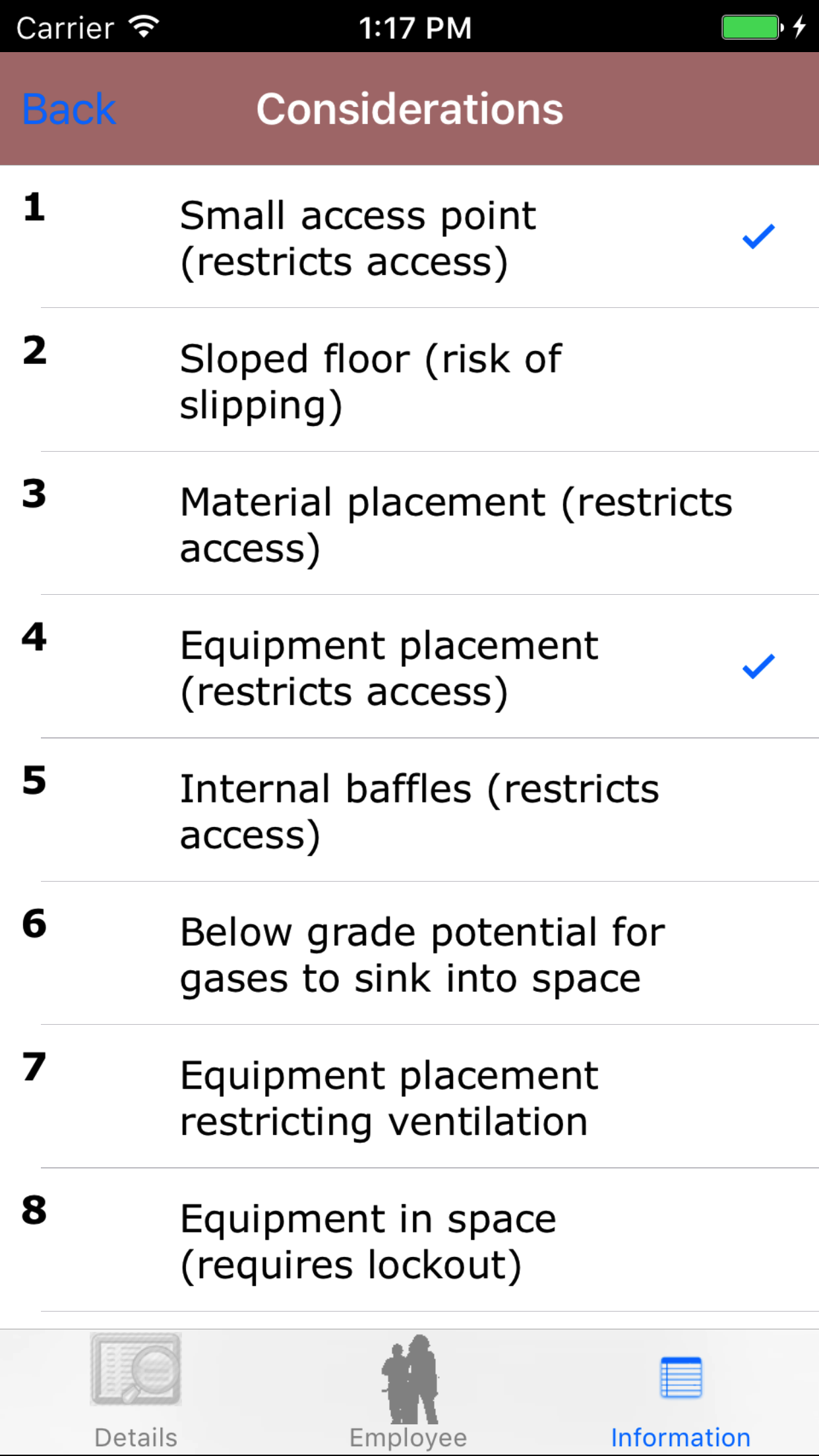 can add to the list. In the Considerations section users will check off considerations which will apply to this confined space entry.