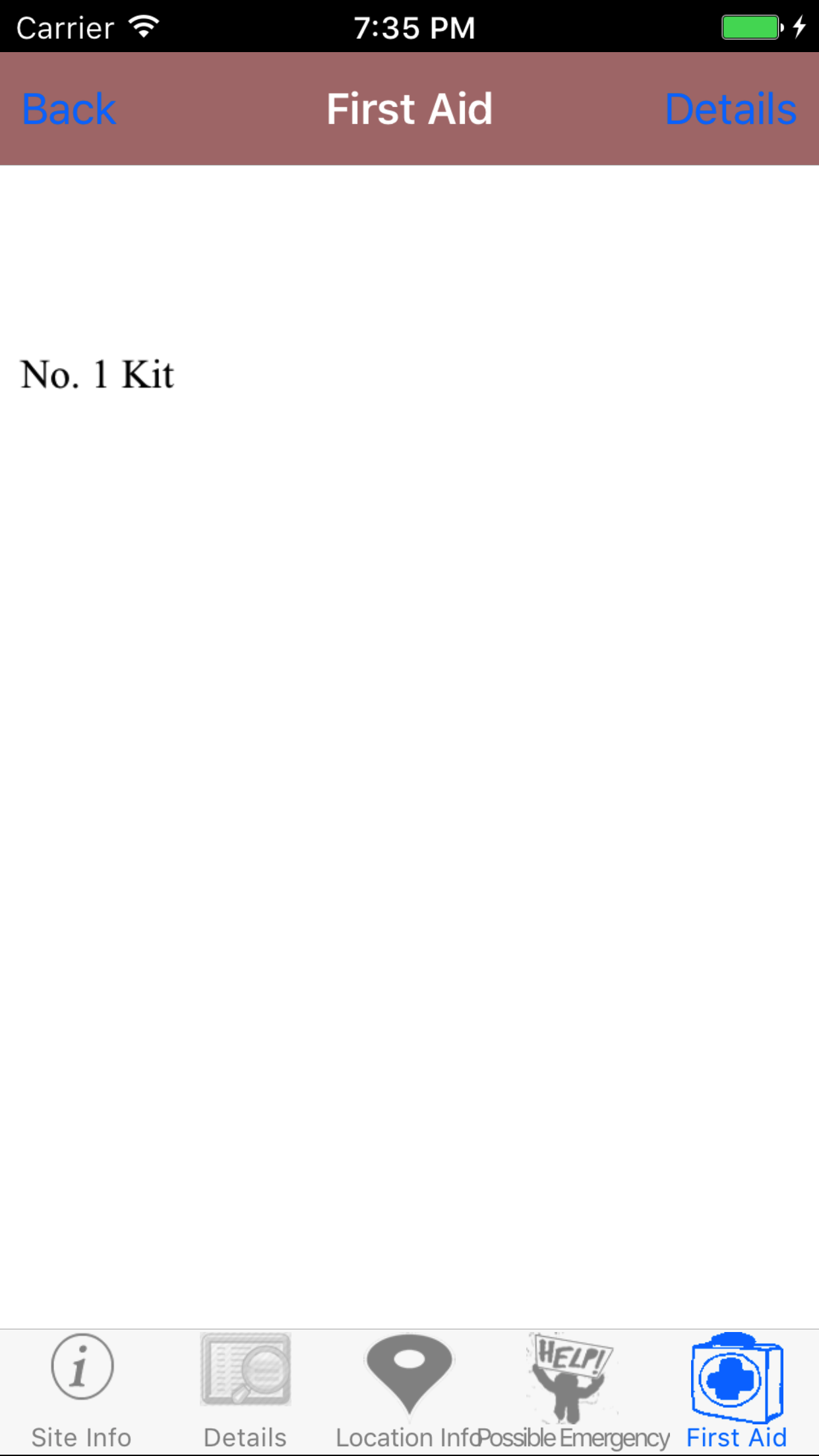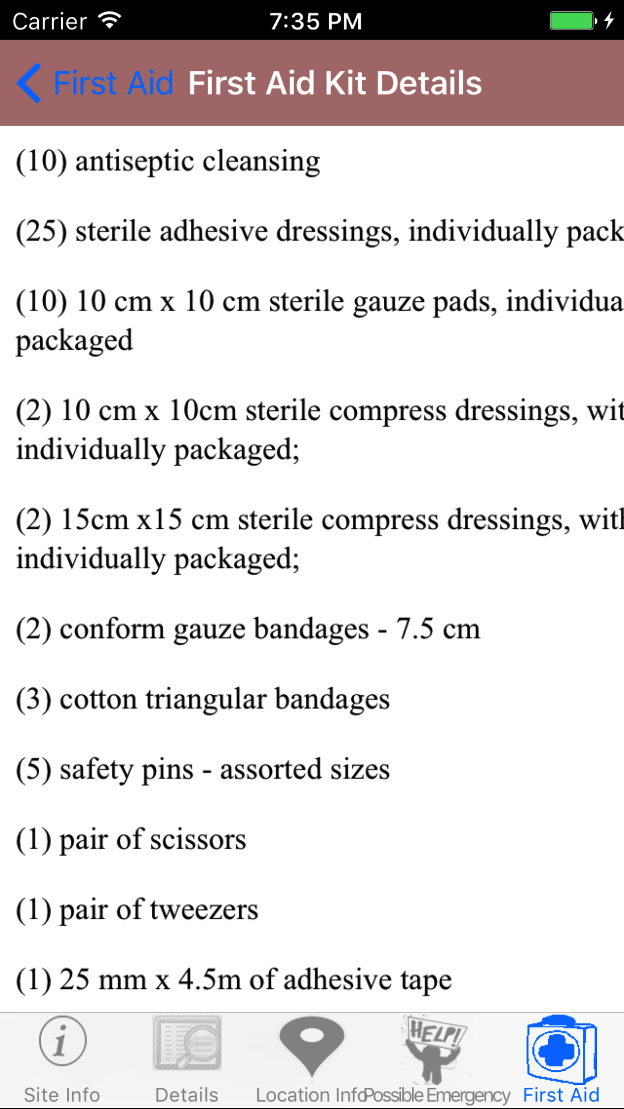 - Tap on the Details button in the top right corner, this loads the next screen with first aid kit requirements.