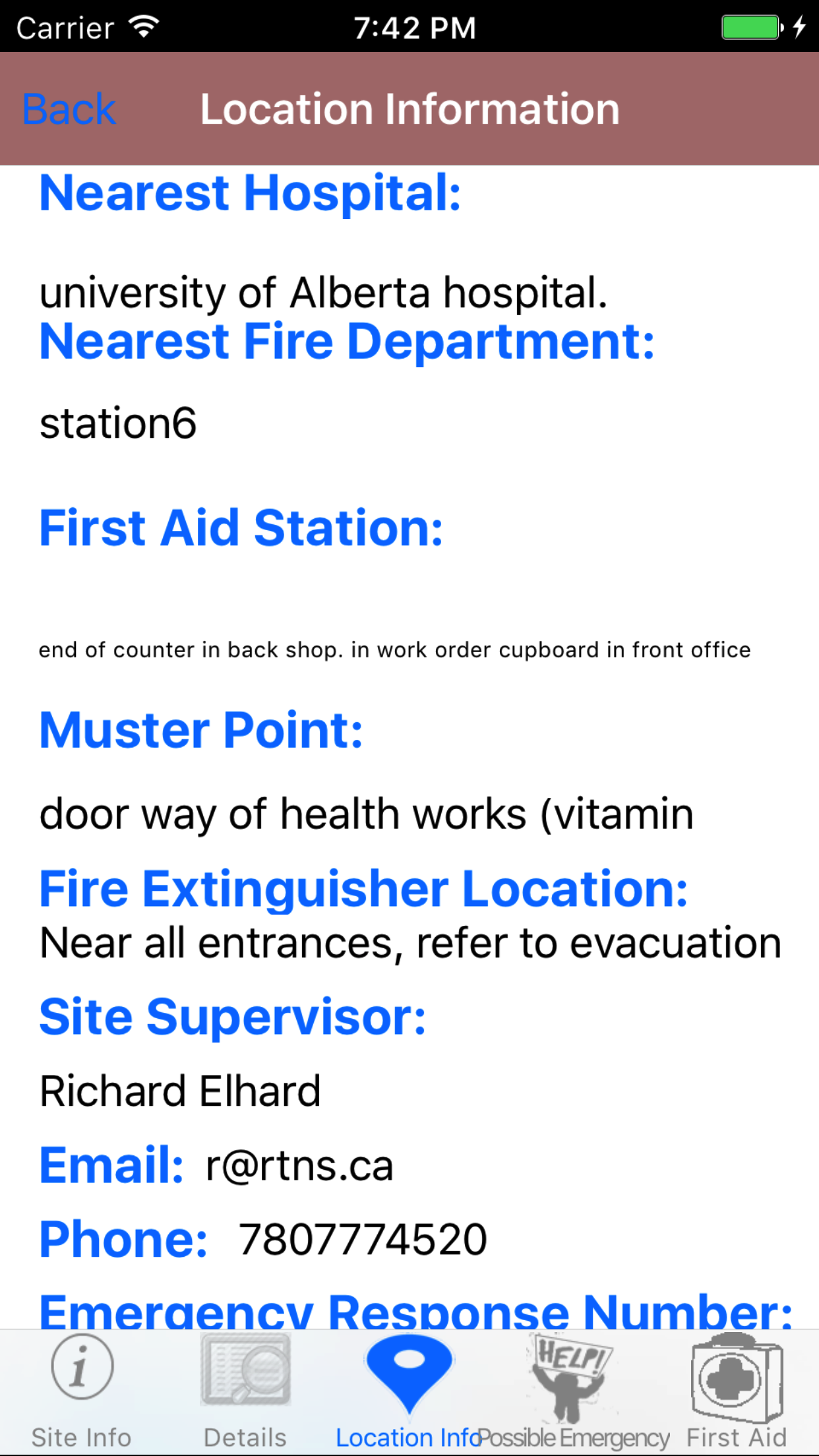 - Tap the third tab, the location tab of the History view. This loads with the location information of the Emergency Response Plan.