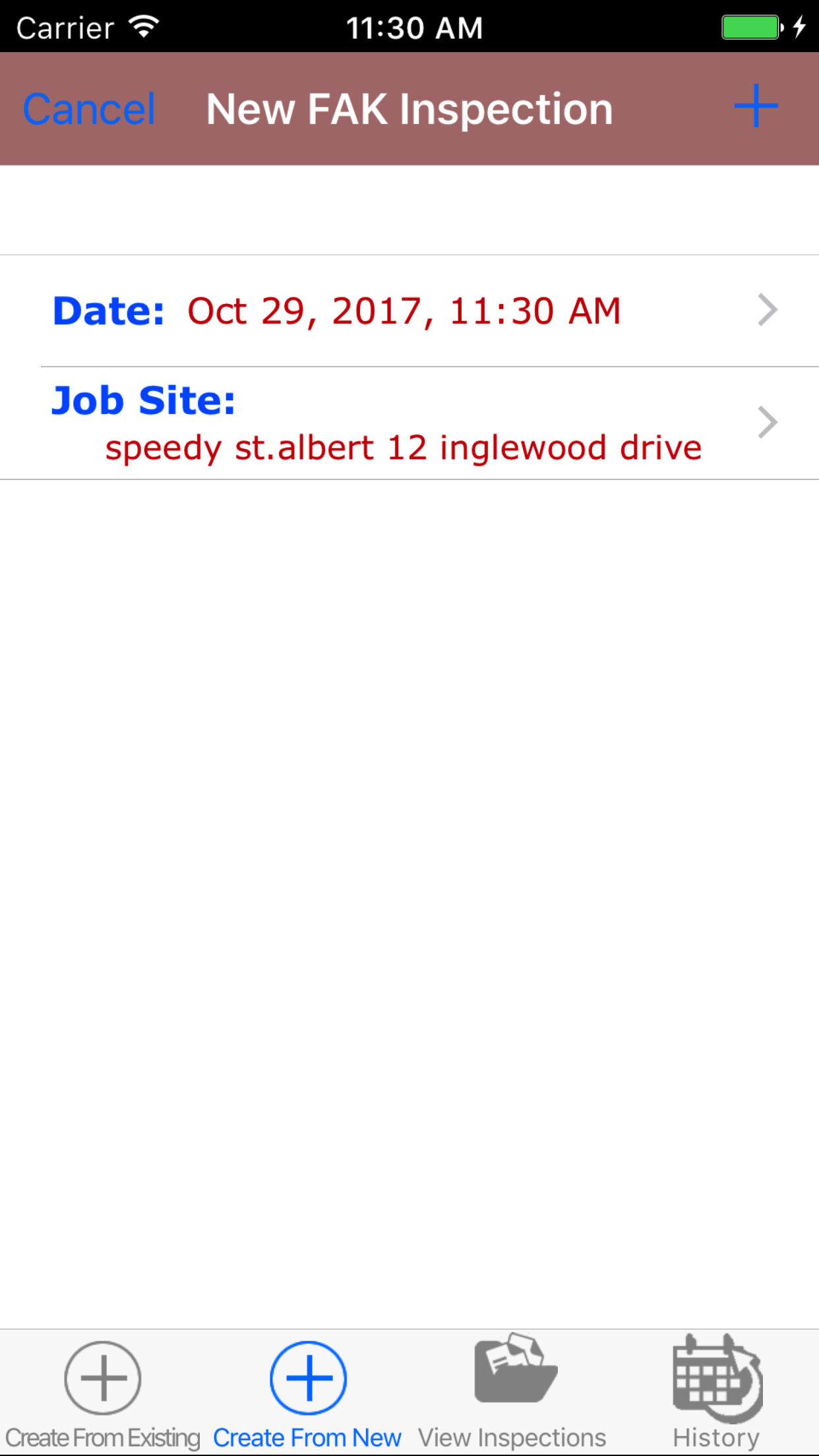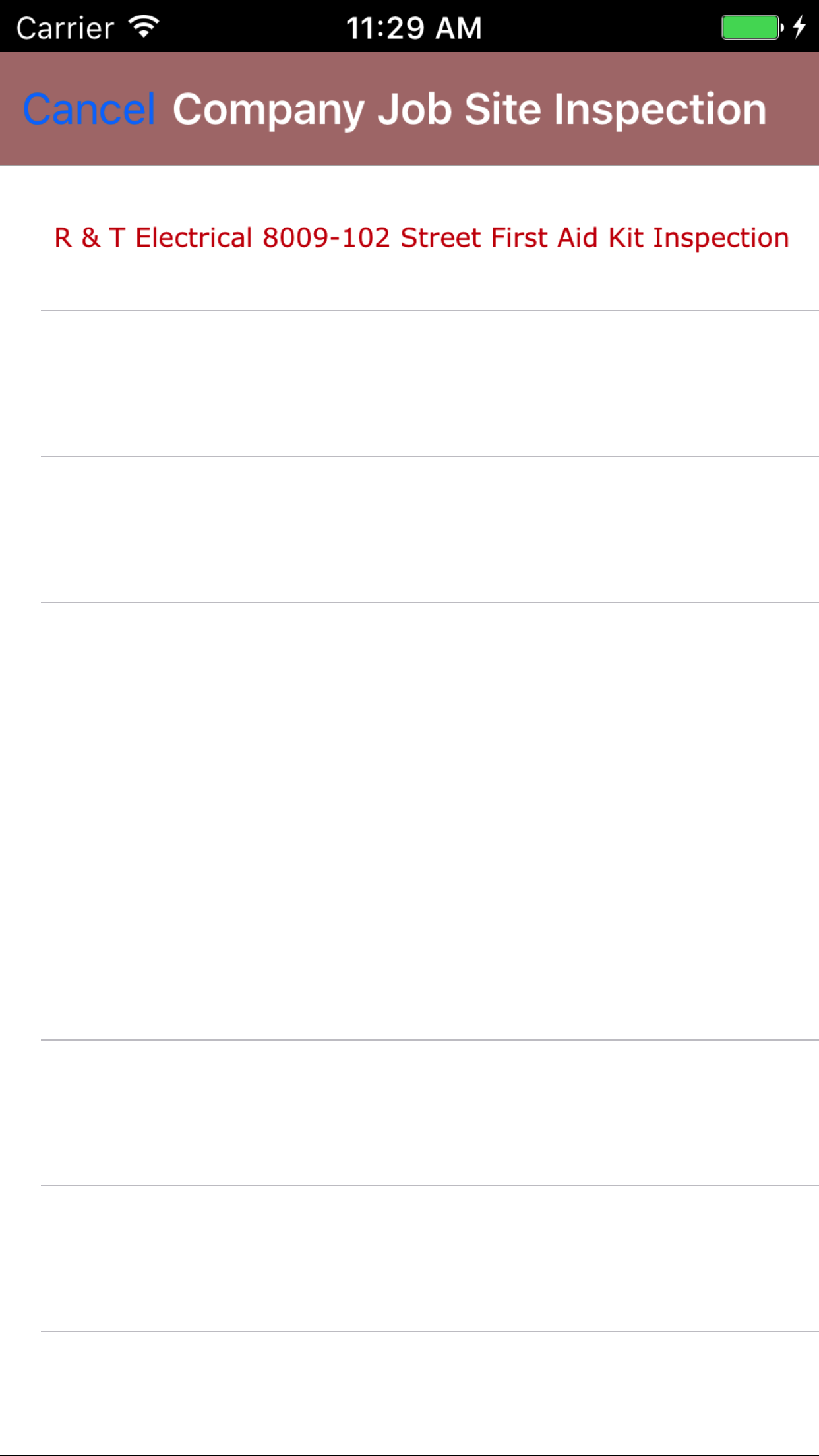 - Return to the Add First Aid Kit Inspection screen by either tapping the appropriate job site or tapping Cancel in the top left corner to leave the First Aid Kit Inspection field unchanged.