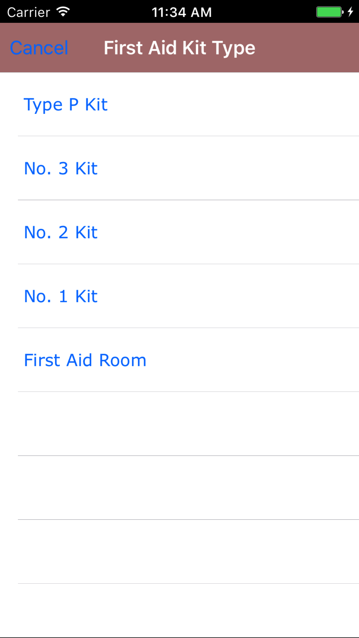 - Tap the First Aid Kit Type: field to open the First Aid Kit Type screen.