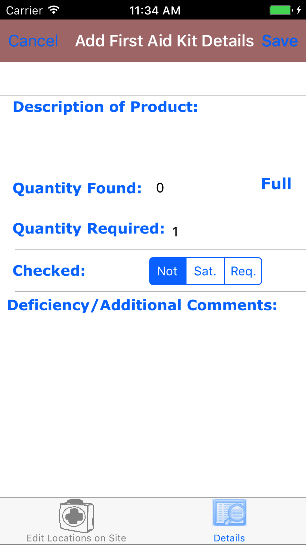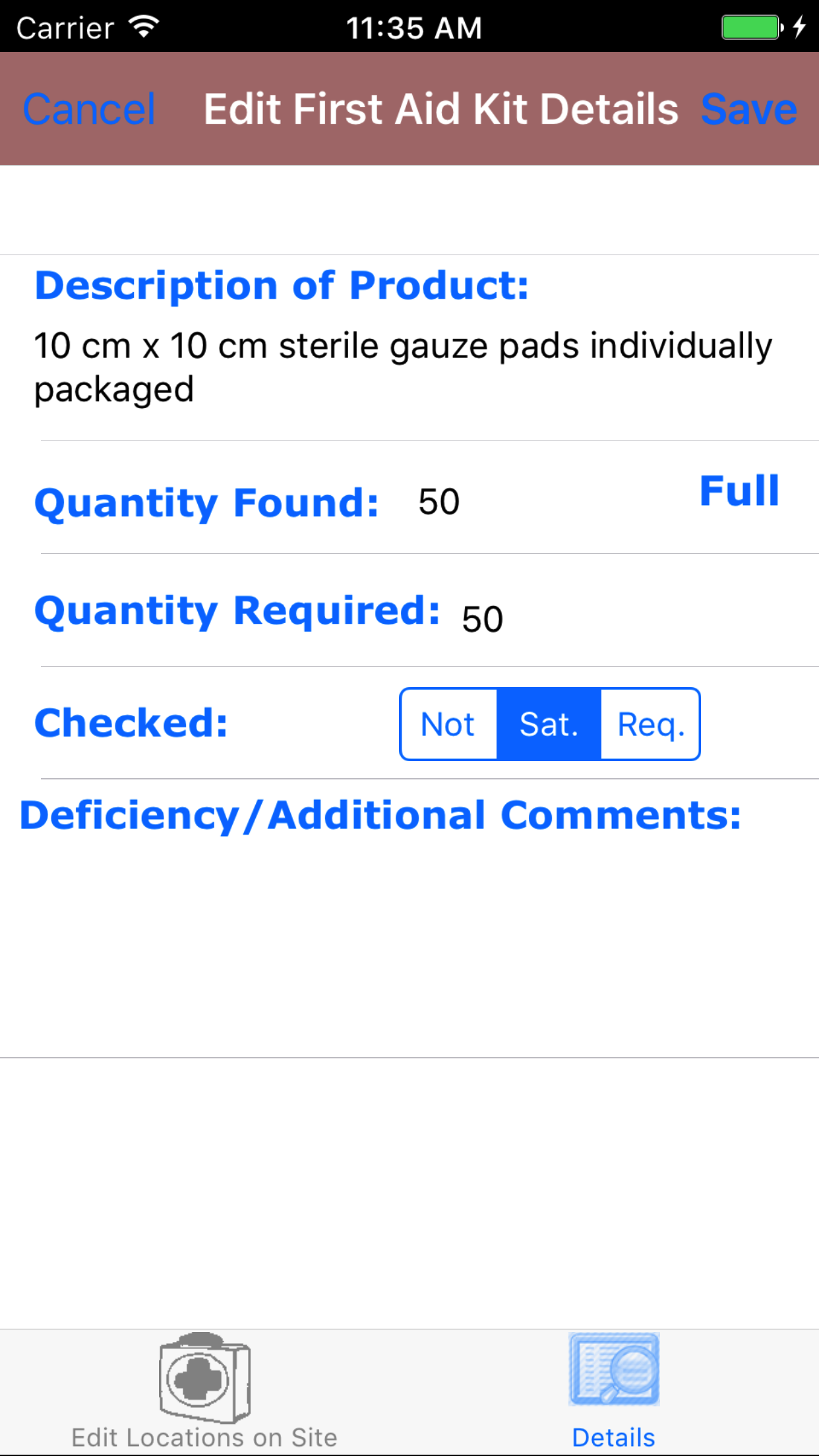 - Tap Sat. on the Not|Sat.|Req. segmented controller to indicate the checked status of the first aid kit detail.