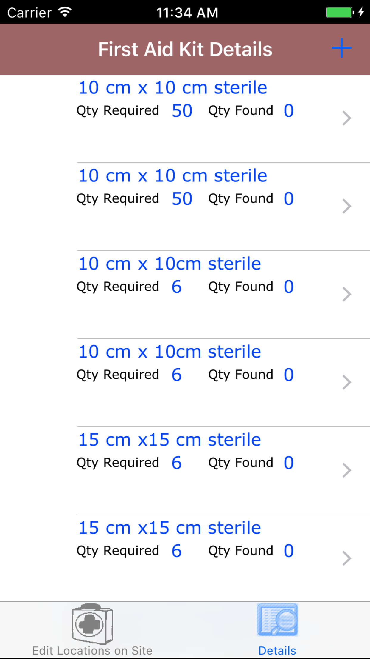 - Tap on the second tab, the First Aid Kit Details icon at the bottom of the screen to open the First Aid Kit Details screen. The screen loads