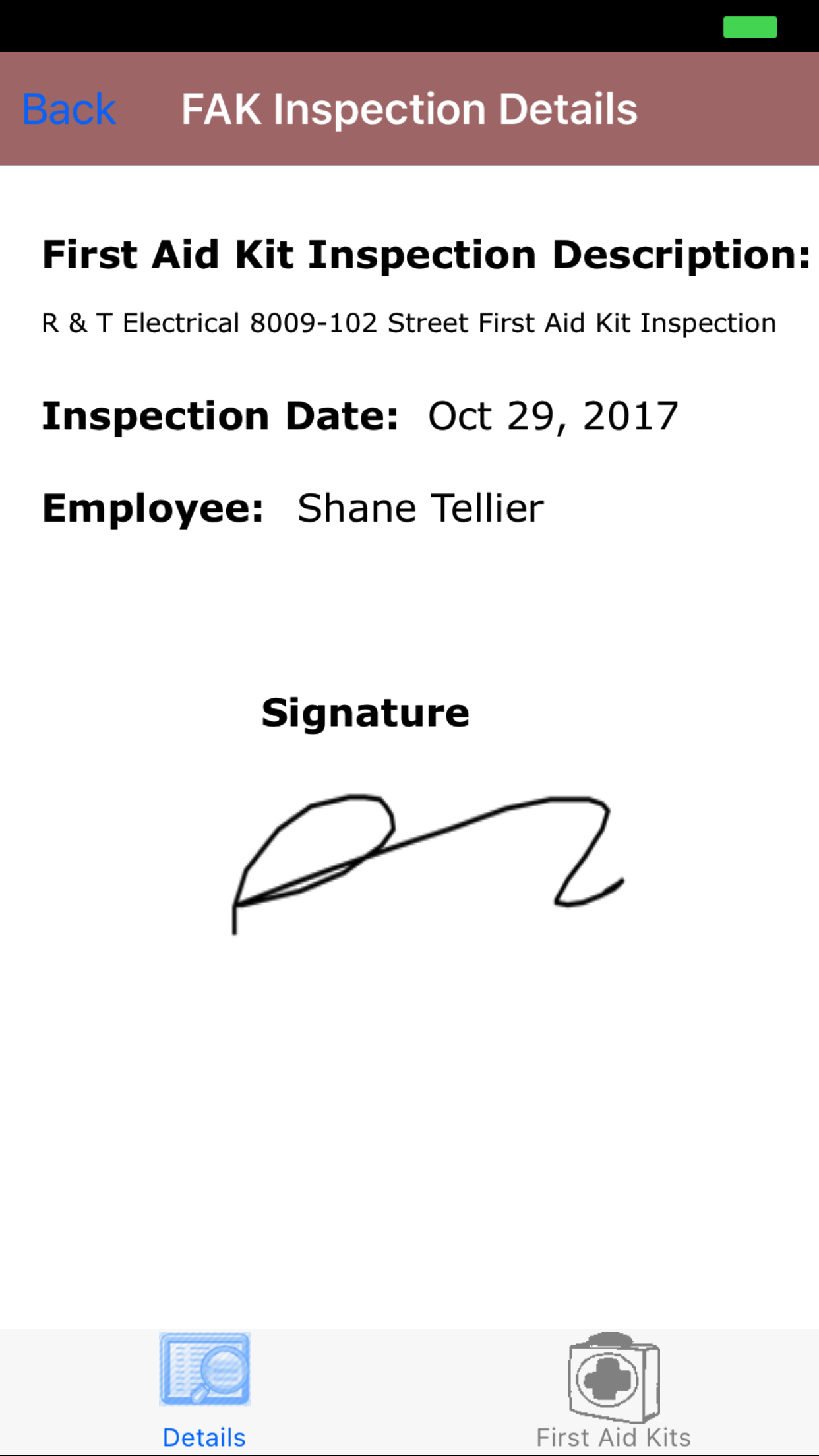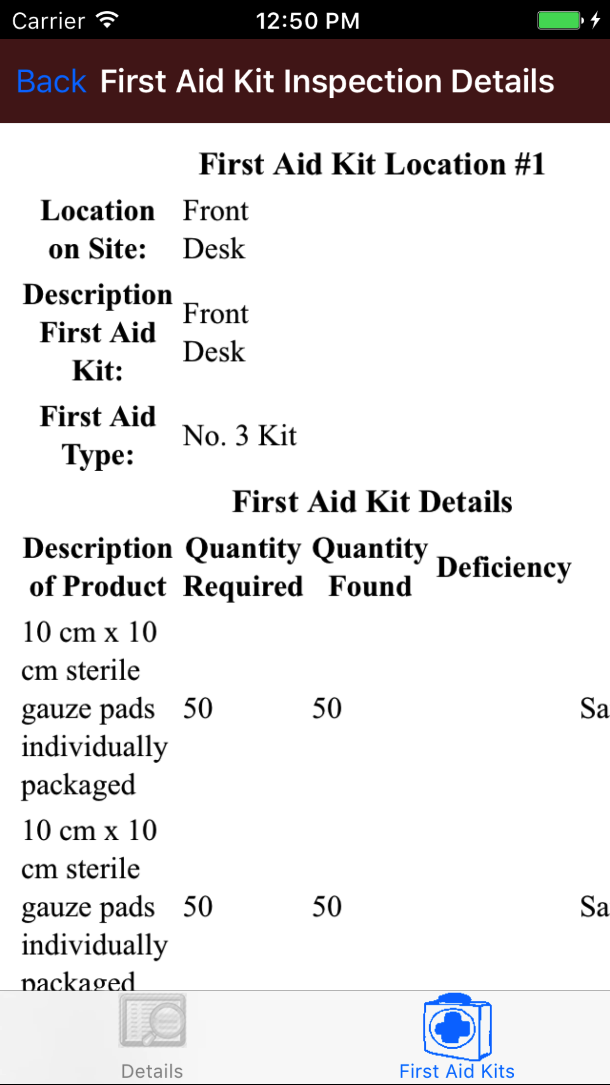 - Tap on the First Aid Kit Inspection you would like to view. This loads the first tab, the first aid kit inspection details, which loads with the first aid kit