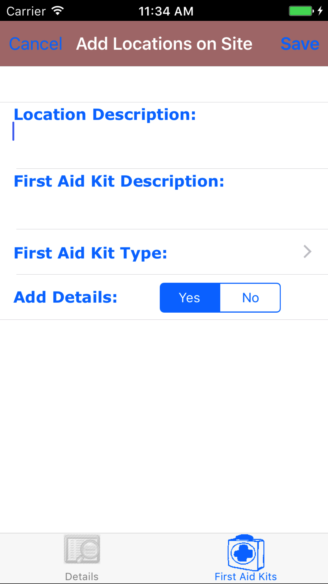 - Add Details: The Add Details field allows users to add first aid kit details based on the type of first aid kit being added to the location.