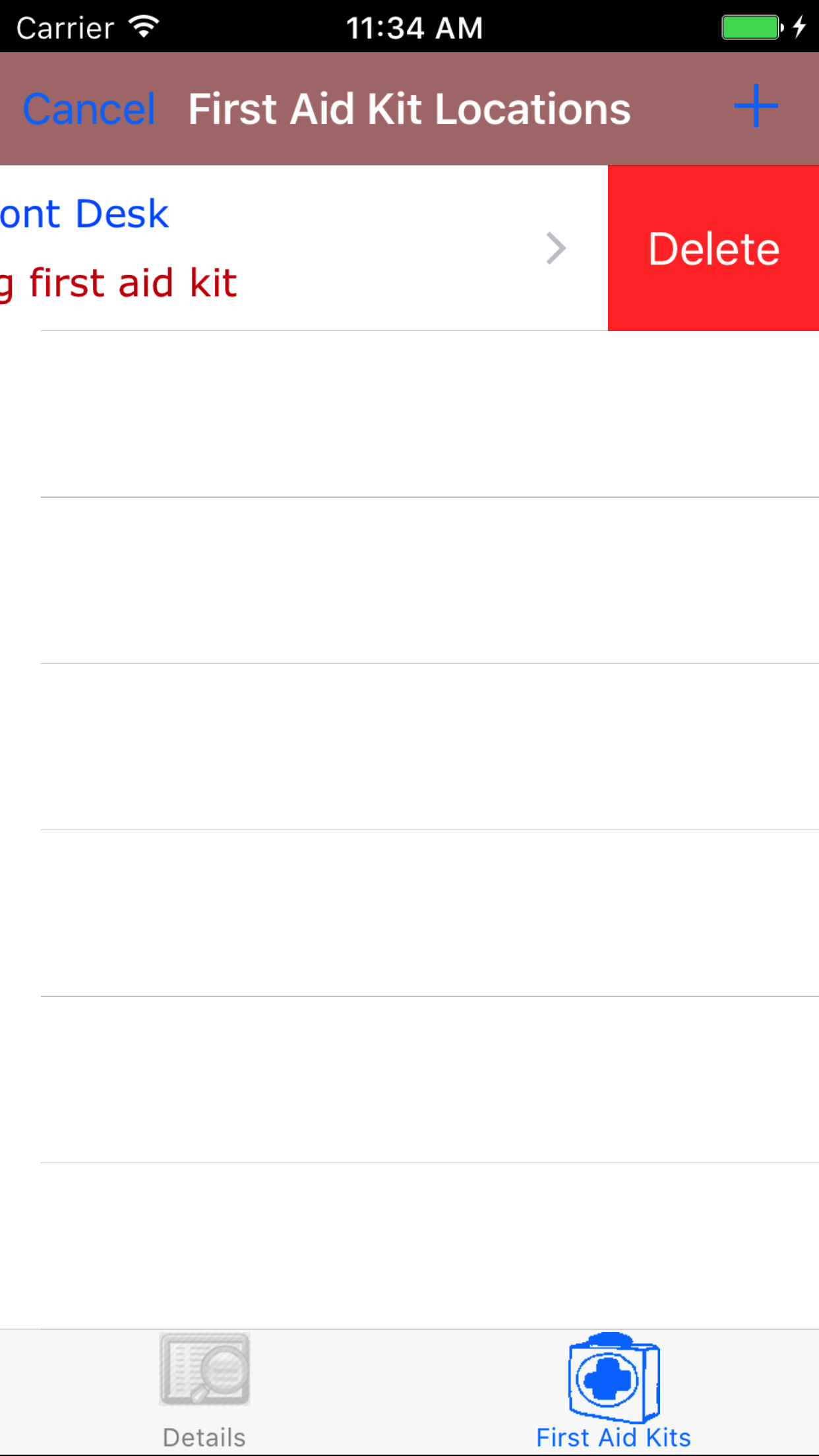 - Swipe from the right edge to the left to bring up the delete button for the first aid kit detail.
