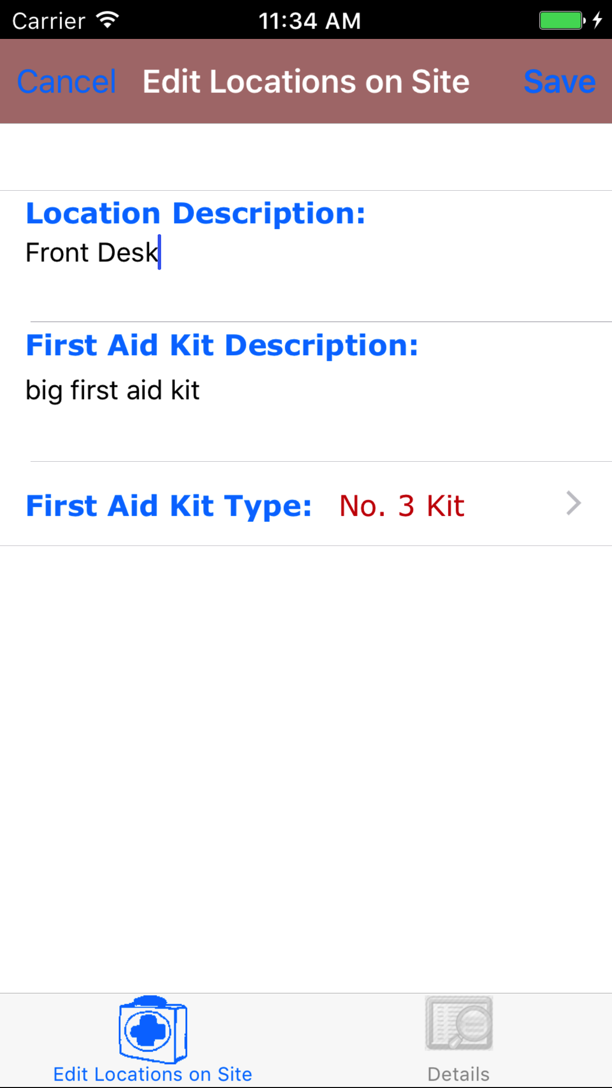 - Tap on the desired location. This loads the edit First Aid Kit Location screen.