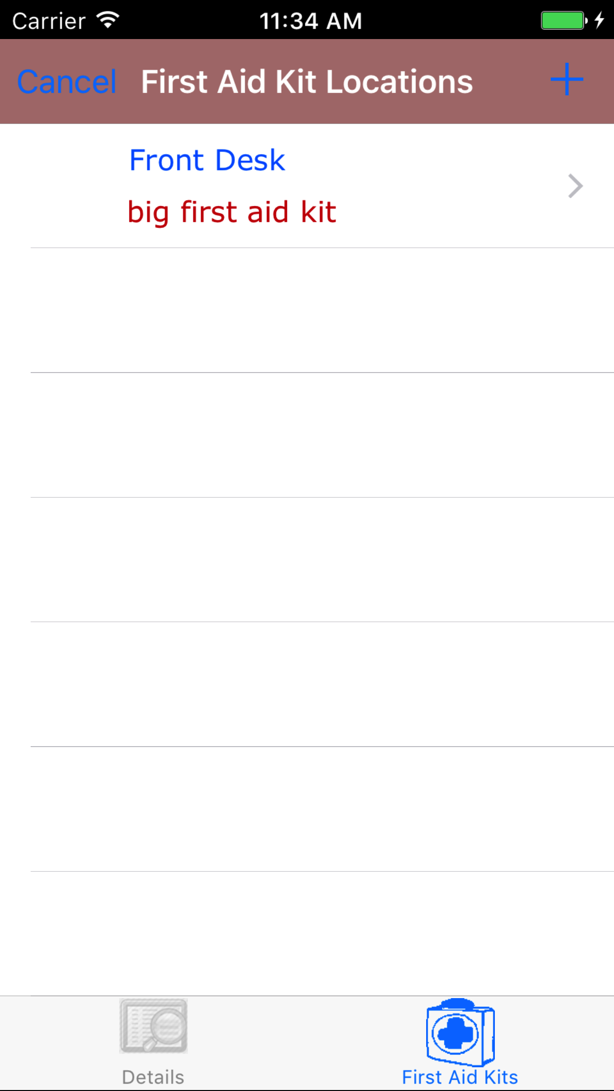 opens with a list of first aid kit locations with the location and description in