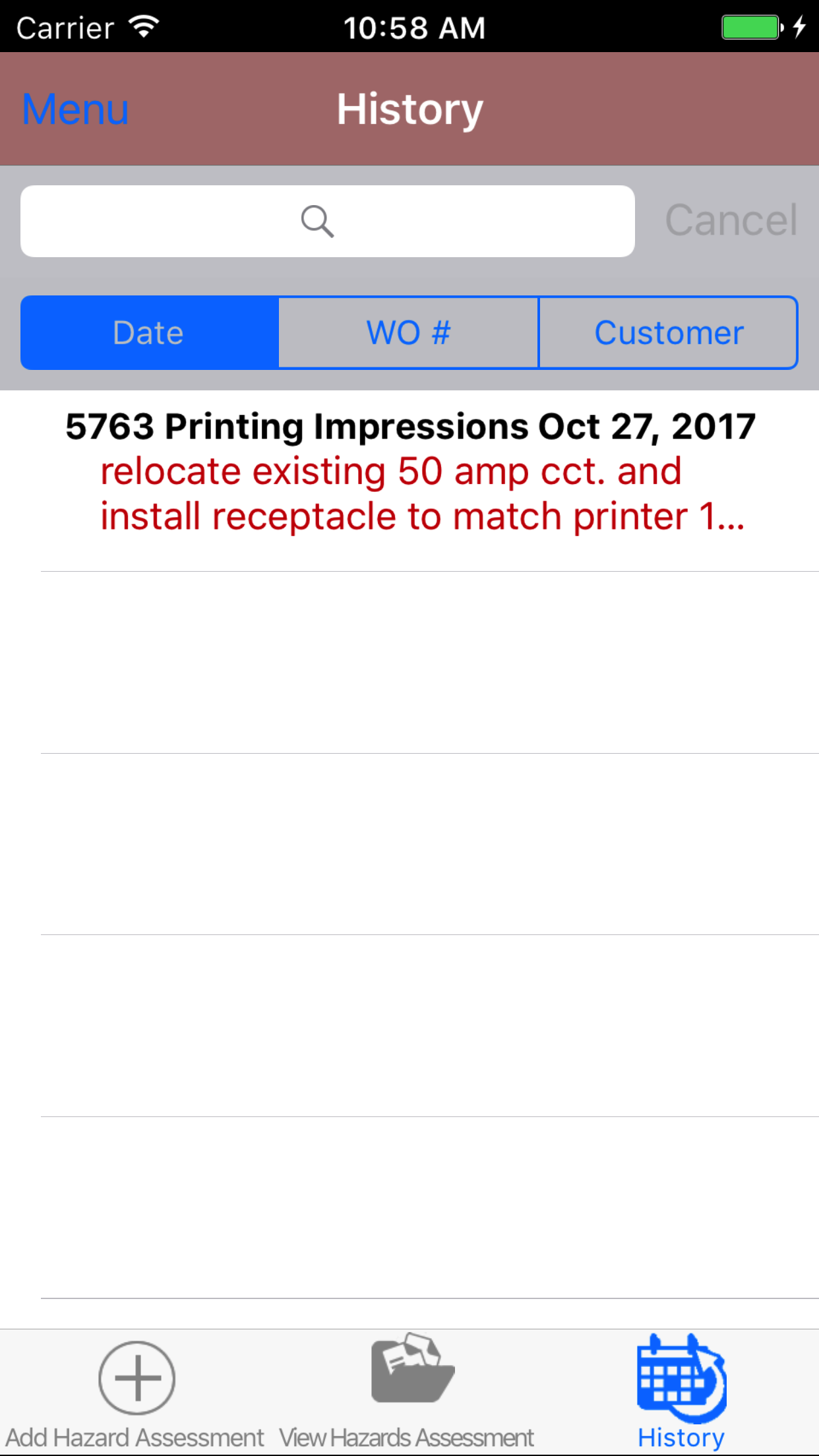 format YYYY-MM-DD. The other options for the Hazard Assessment search are by work order number and customer. Enter your search