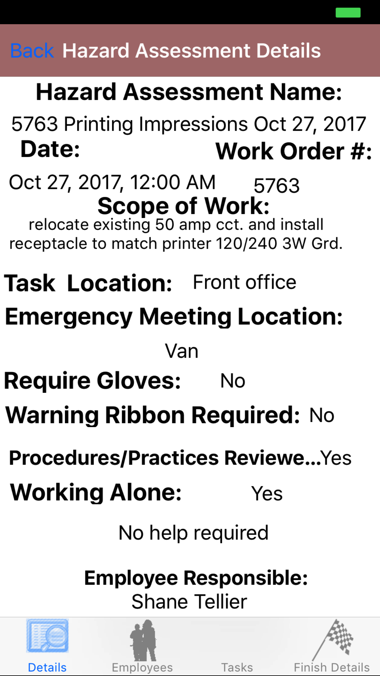 - Tab one loads with task hazard details, the details of the task hazard.