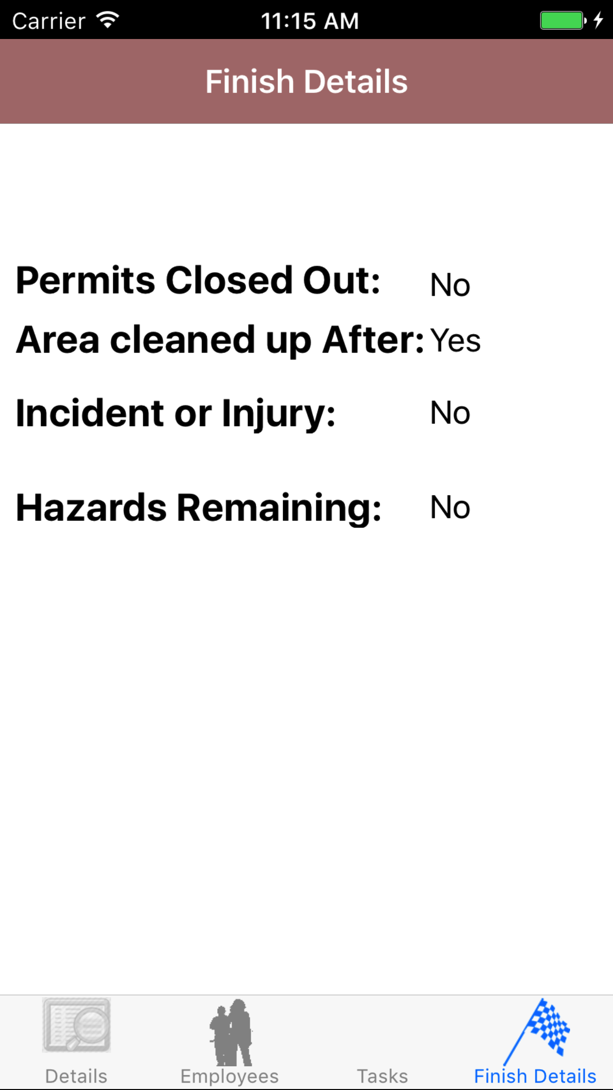 - Tap the fourth tab, the Final Details tab of the History view. This loads with the permits closed out, area cleaned up after, incident or injury description, hazards remaining description and the site contact email address.