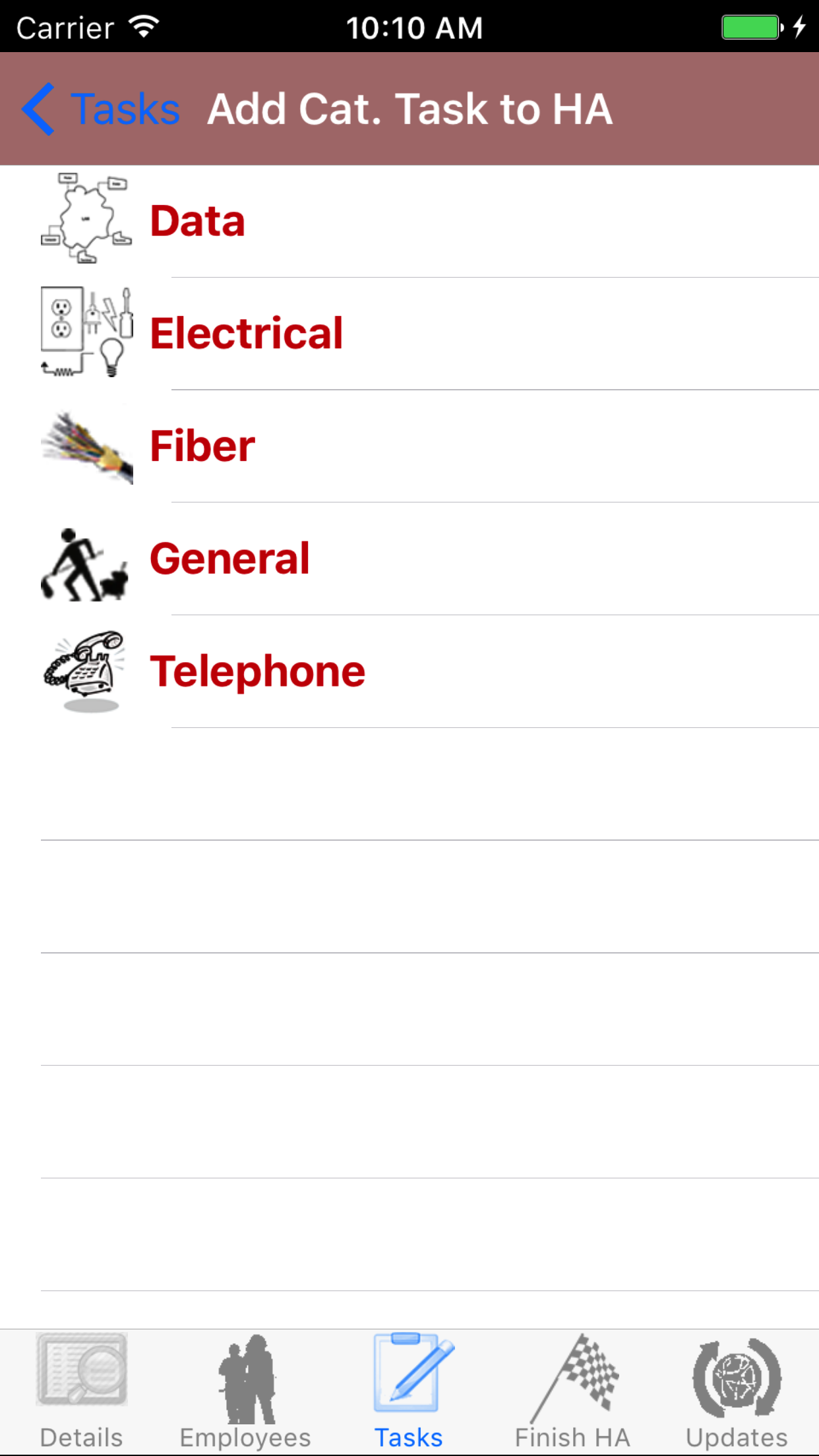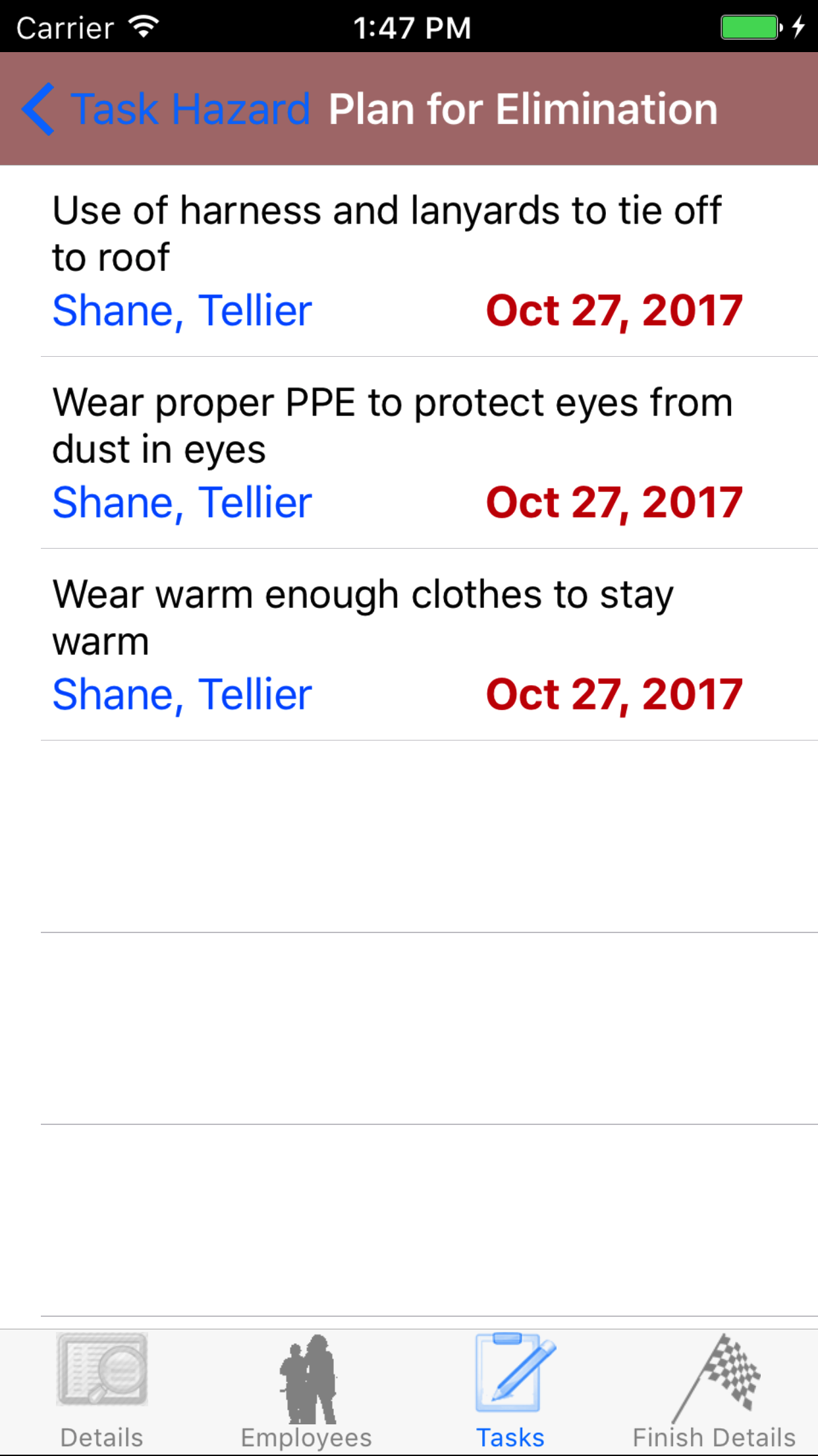 - Tap the third tab, the Tasks tab of the History view. This loads the list of the Tasks that were added for the Hazard Assessment,