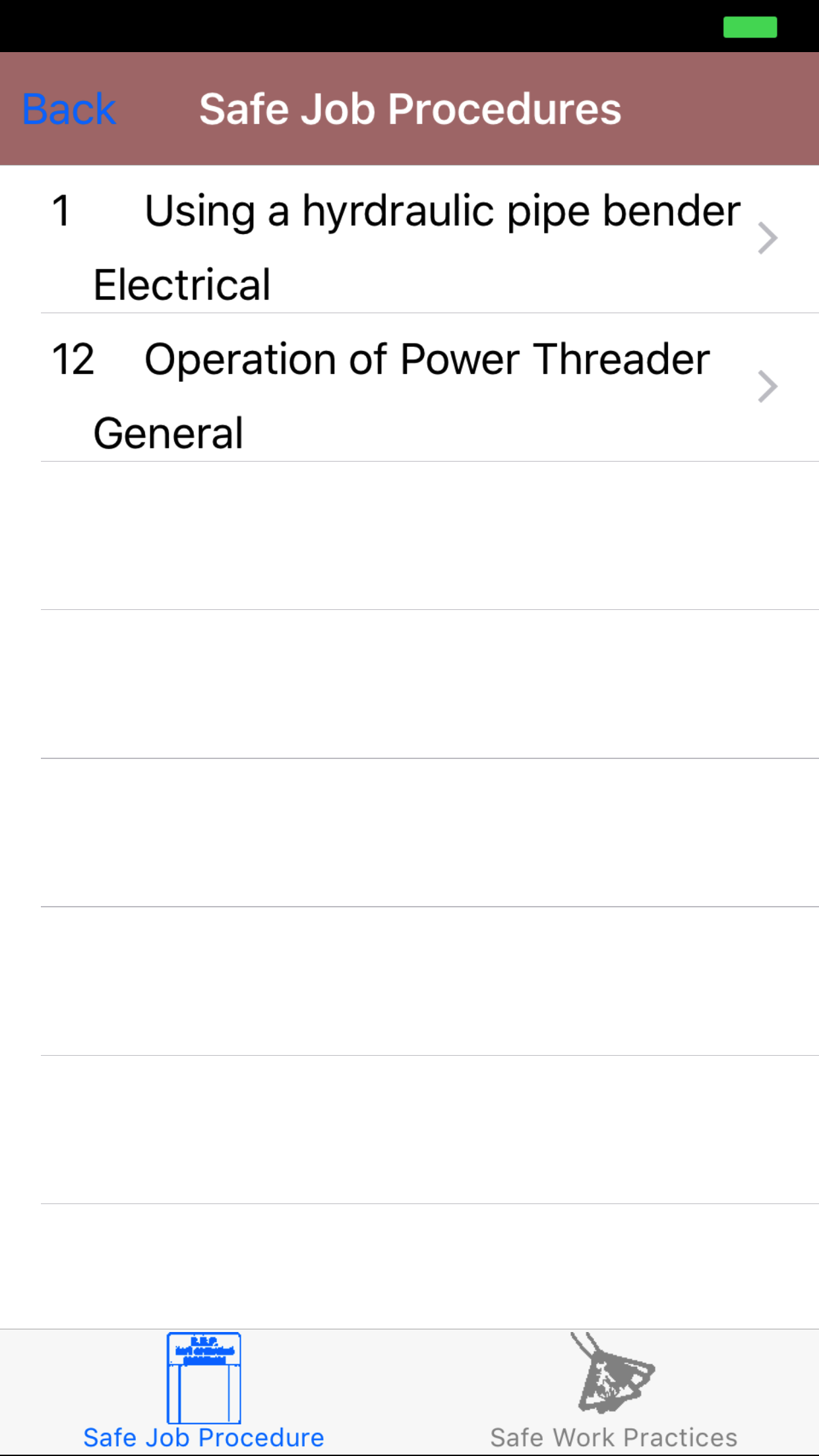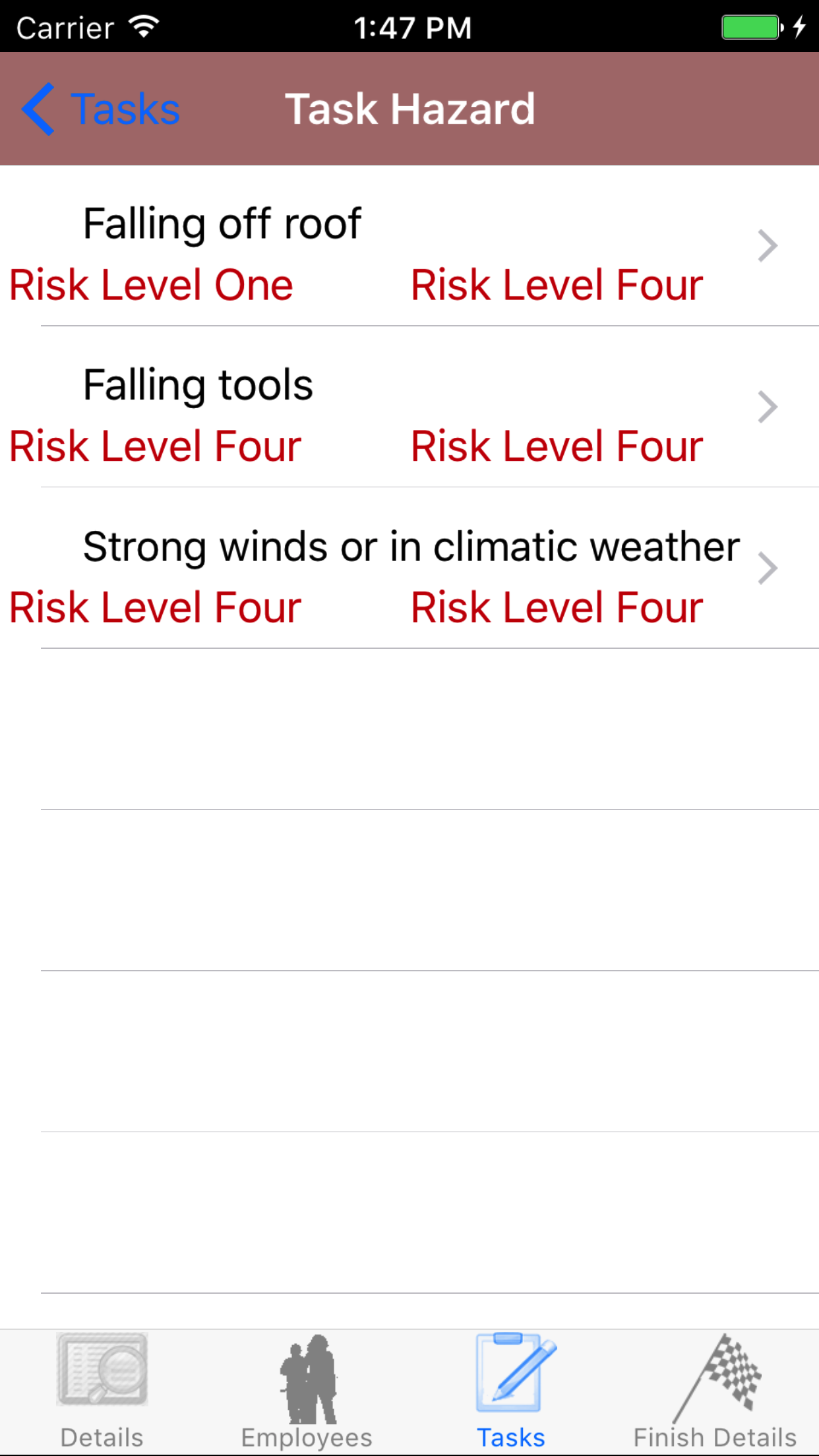 - Tap on a Task, to load the Task Hazard view. This loads the list of Task Hazards of a Task, displaying the hazard description, and the risk level of each task hazard.