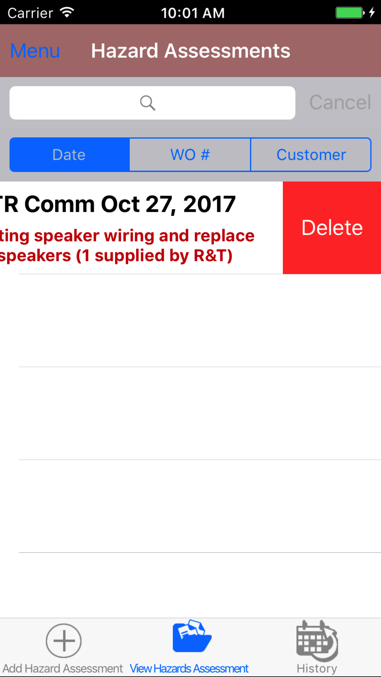 - Swipe from the right edge to the left to bring up the delete button for the hazard assessment.