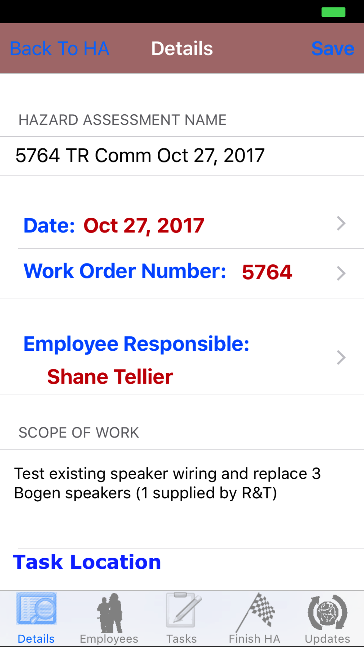 - Task Location: The Task Location field should be as specific as possible, as work orders may include tasks in a number of locations at a job site and the Hazard Assessment needs to identify the