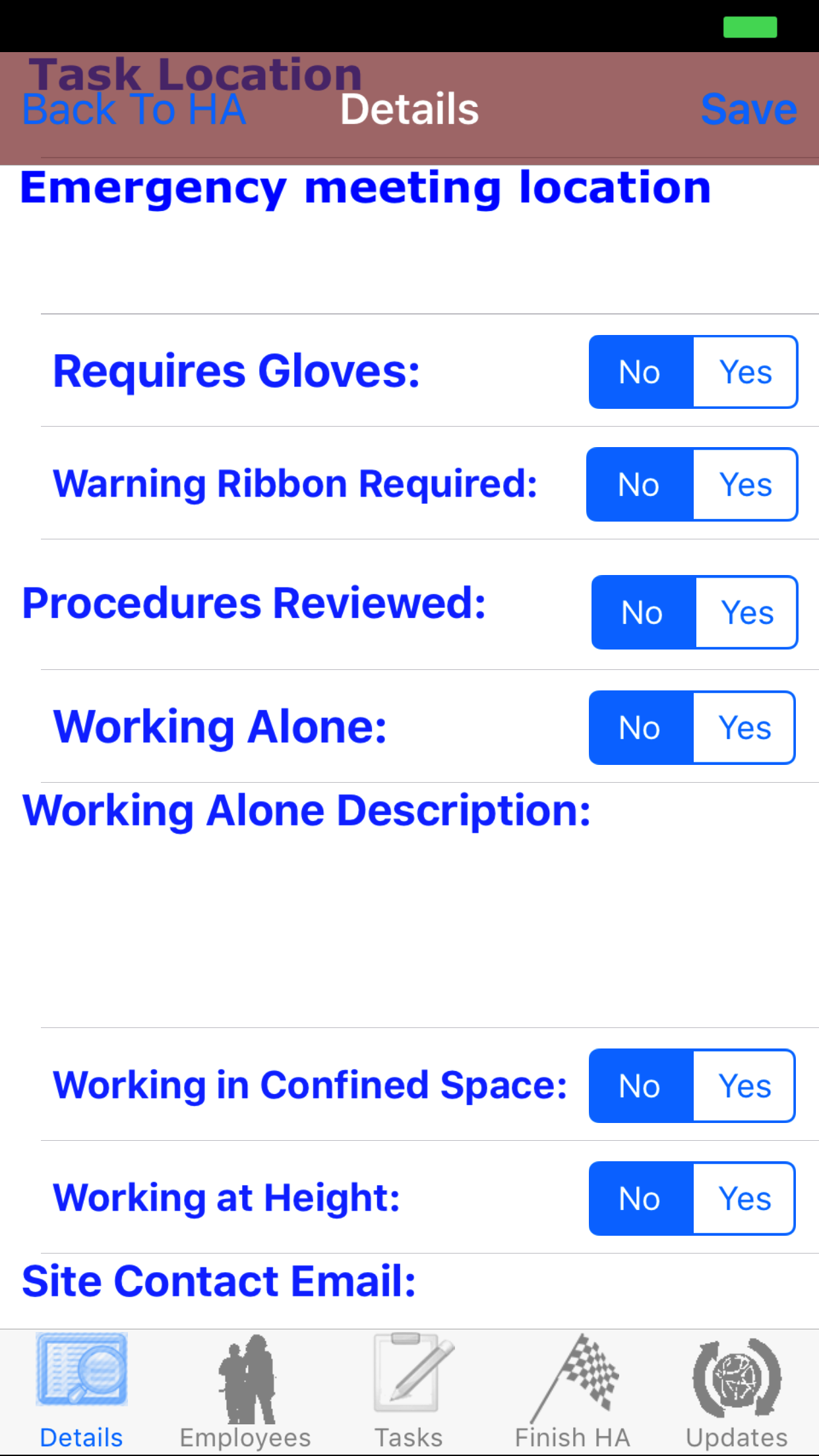- Tap Yes on the No|Yes selector to indicate that gloves are required to be worn while working on site.