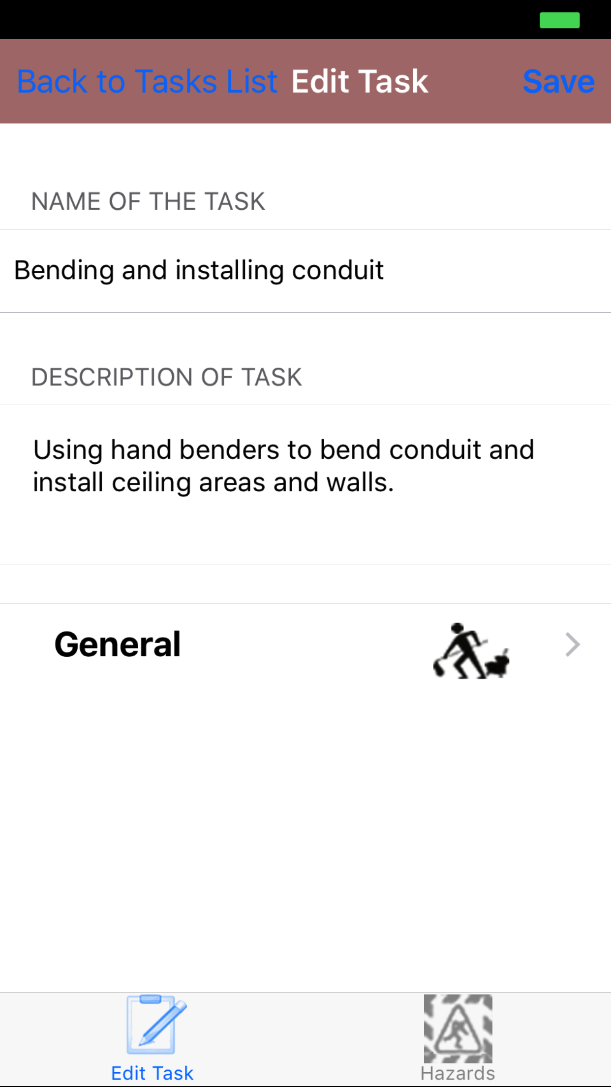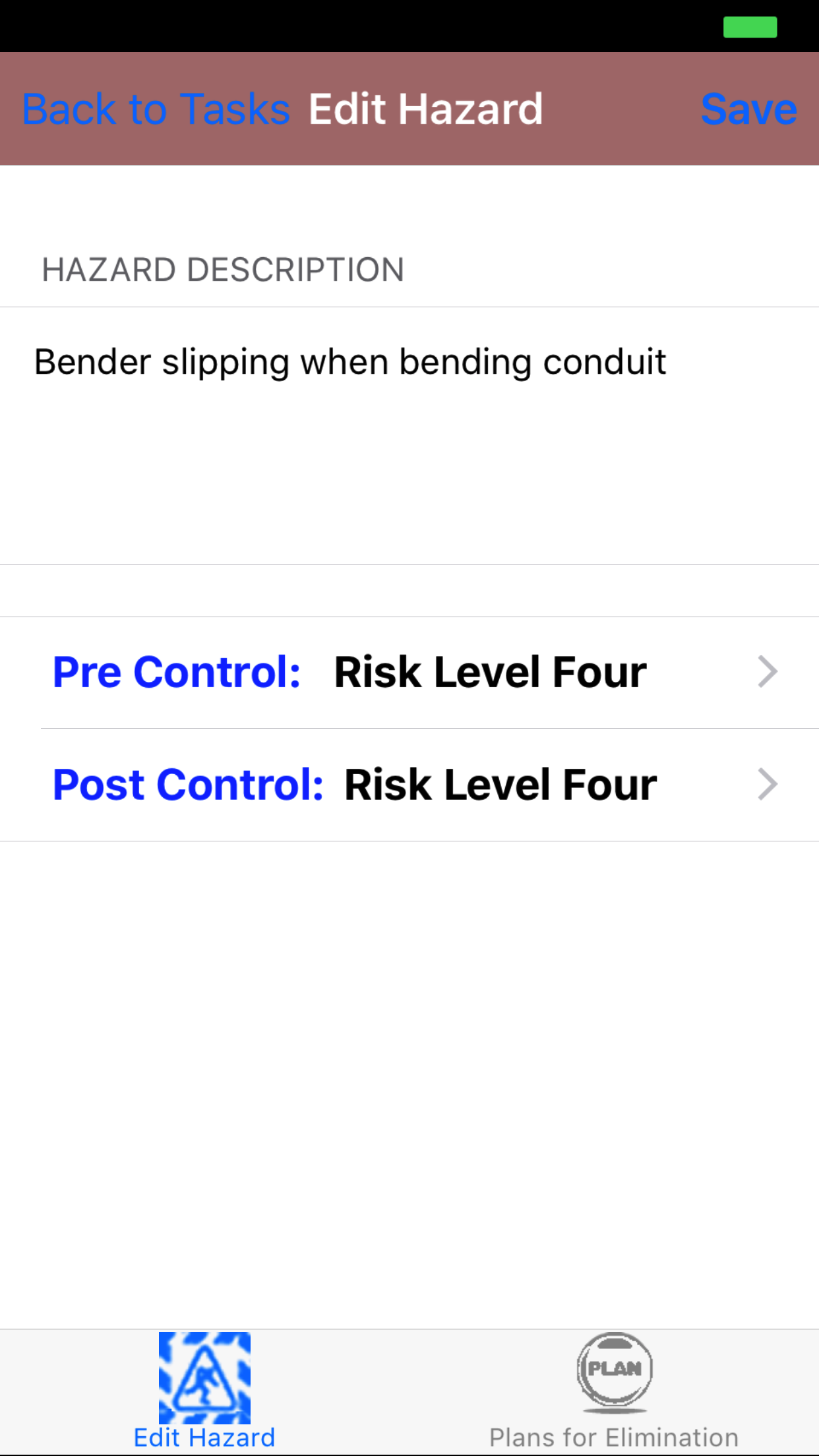 - Tap Save in the top right corner of the screen to edit the plan for elimination for the task hazard for the task.