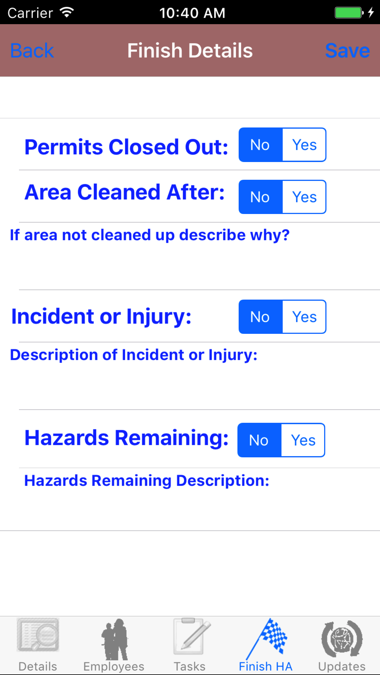 - Area Cleaned After: Select yes or no for Area Cleaned After by sliding the switch between yes or no. If you have cleaned up your work area after finishing for the day, set the switch to yes. If you have not you will