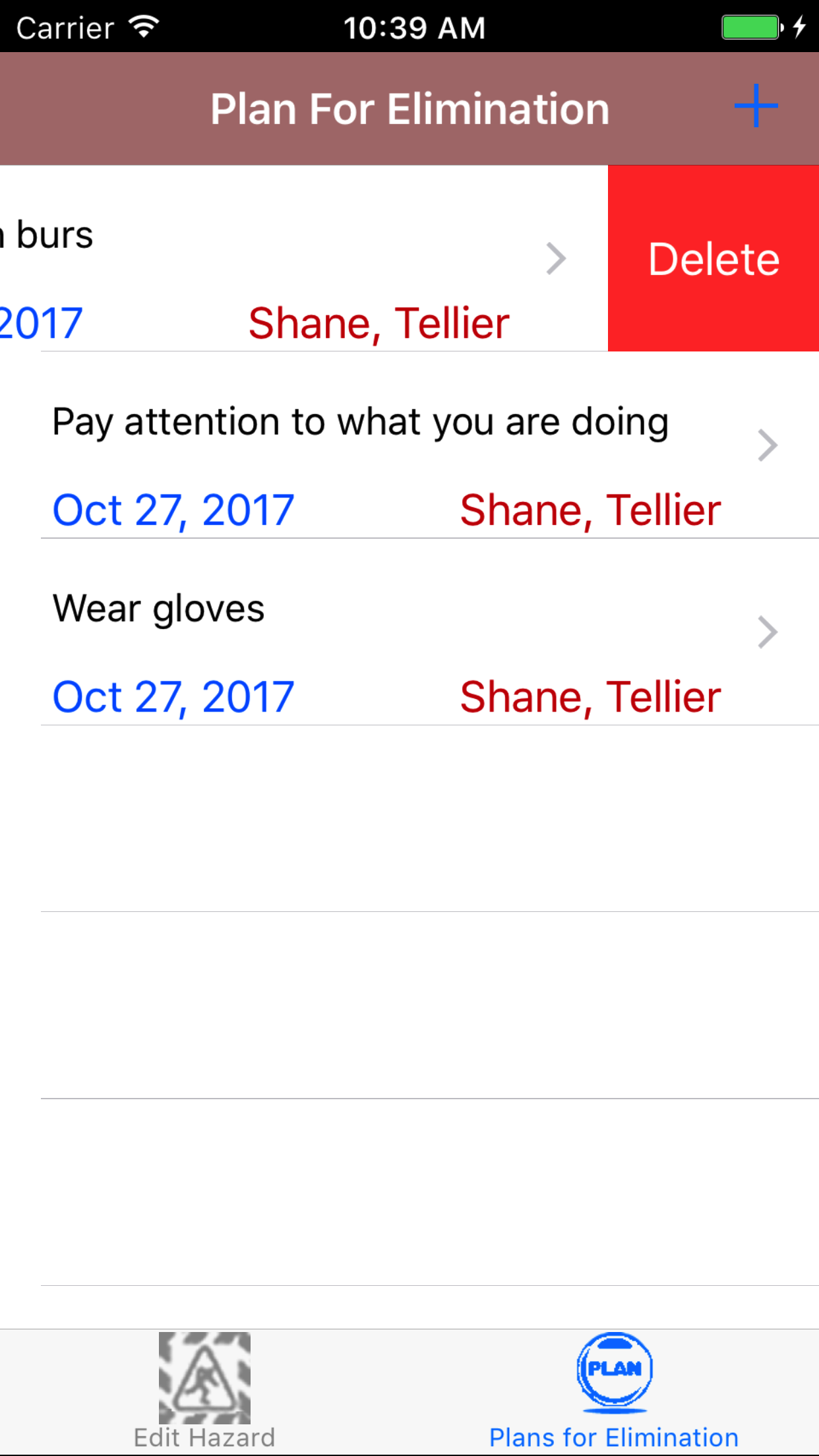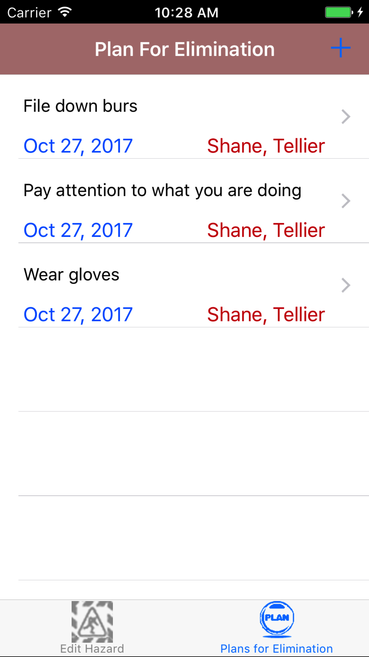 - Tap on a Task Hazard, to load the Plans for Elimination view. This loads the list of Plans for Elimination of a Task Hazard,which displays, the employee name of who is responsible for the plan, hazard control type name, and the date.
