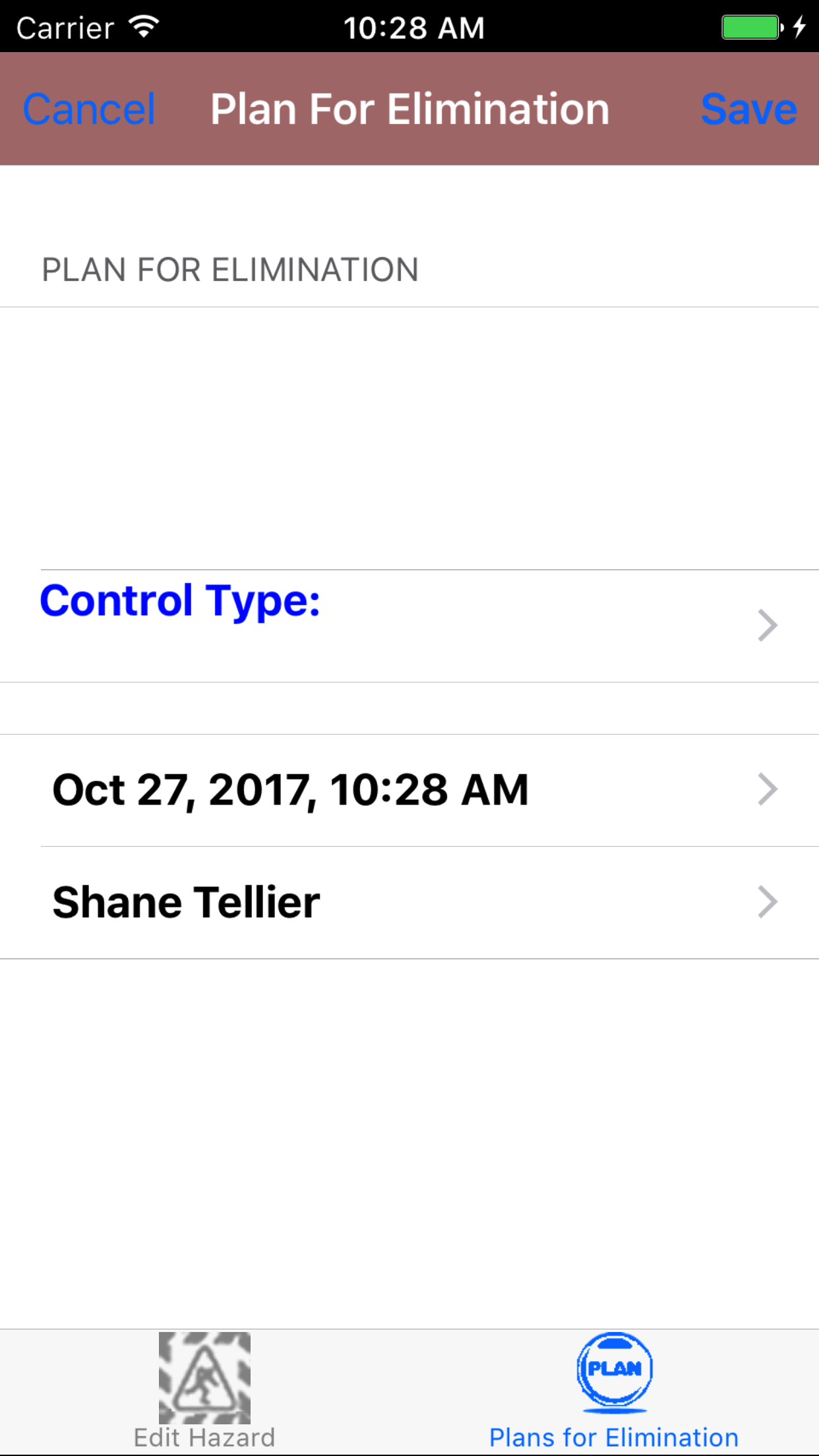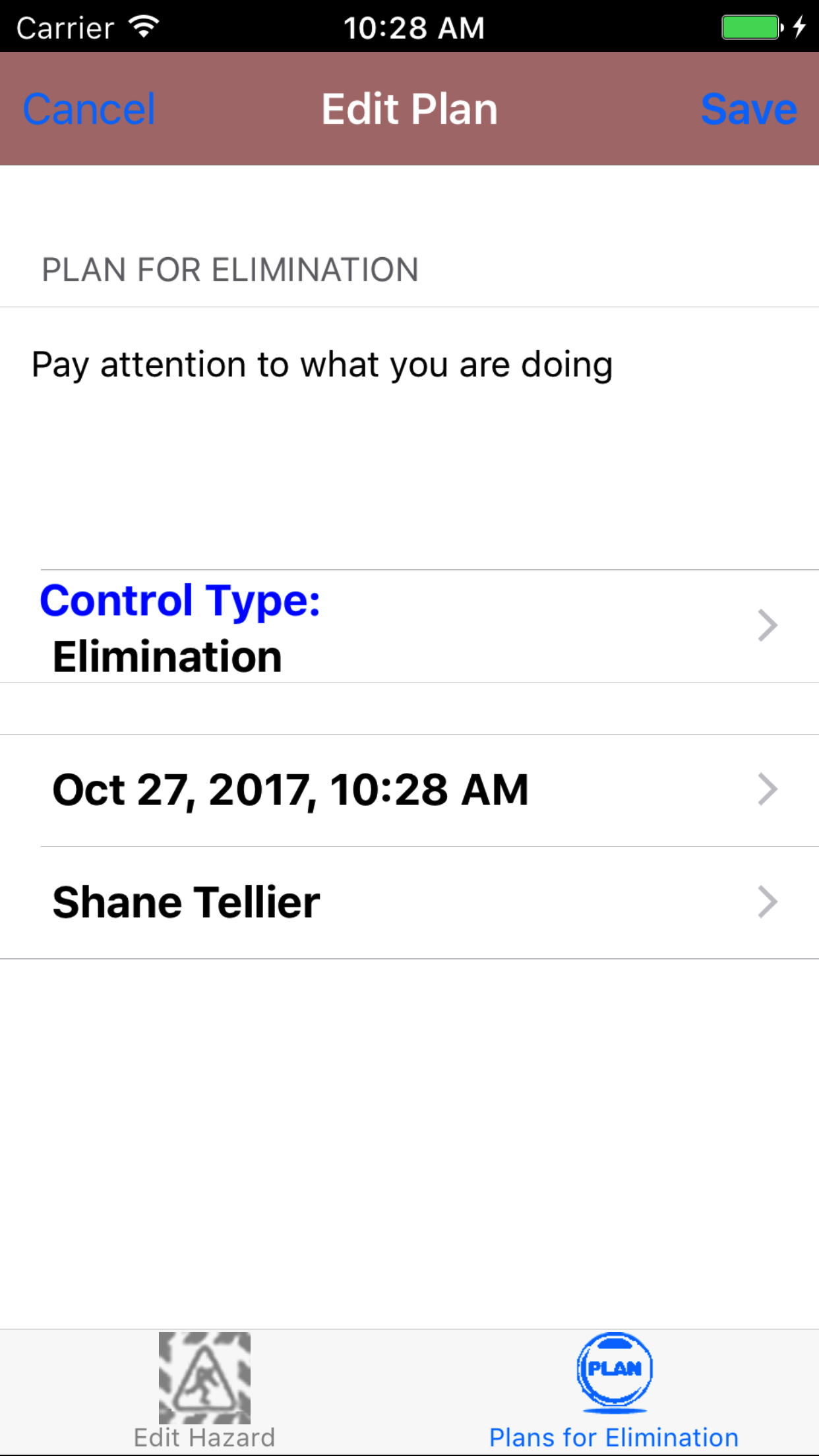 - Tap Add Save in the top right corner of the screen to edit the plan for elimination for the task hazard for the task.