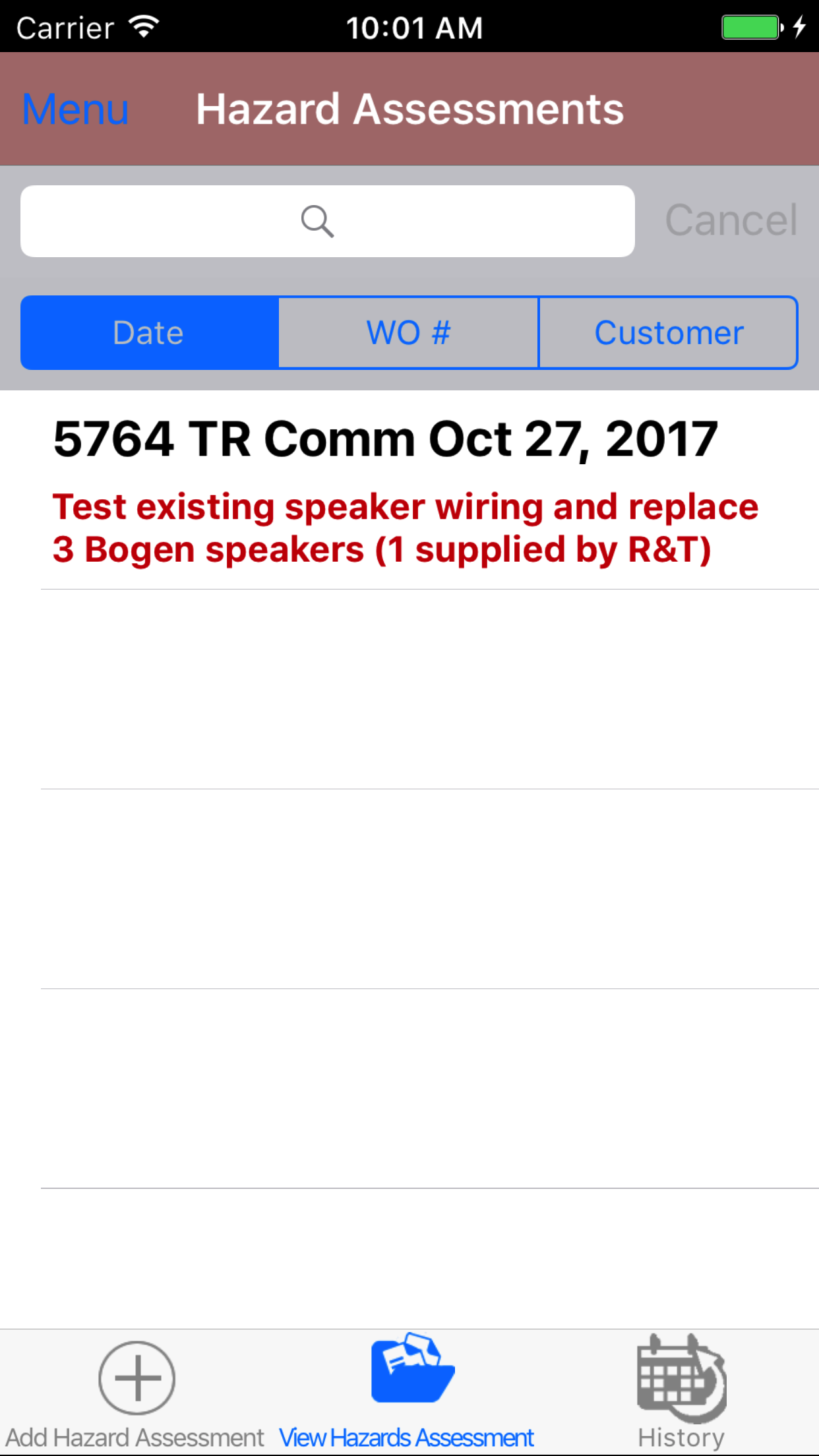 Assessments listing the the work order number, customer name, date of the Hazard Assessment in black and below that