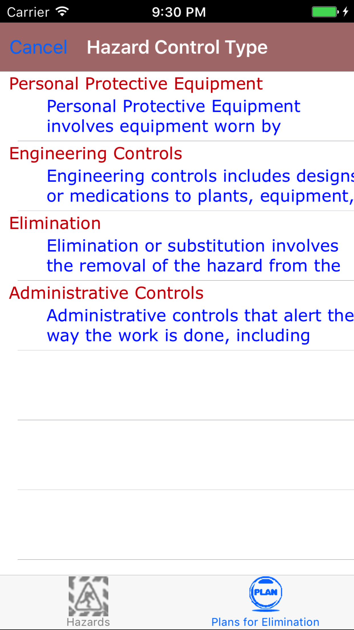 - Tap the desired hazard control type to select it or tap Back in the top left corner to leave the hazard control type field unchanged and return to the Add Plan for Elimination screen.