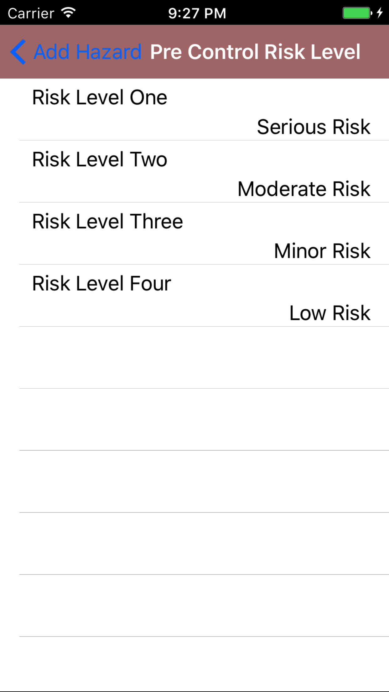 - Tap the desired risk level to select it or tap Back in the top left corner to leave the Risk Level field unchanged and return to the Add Task Hazard screen.