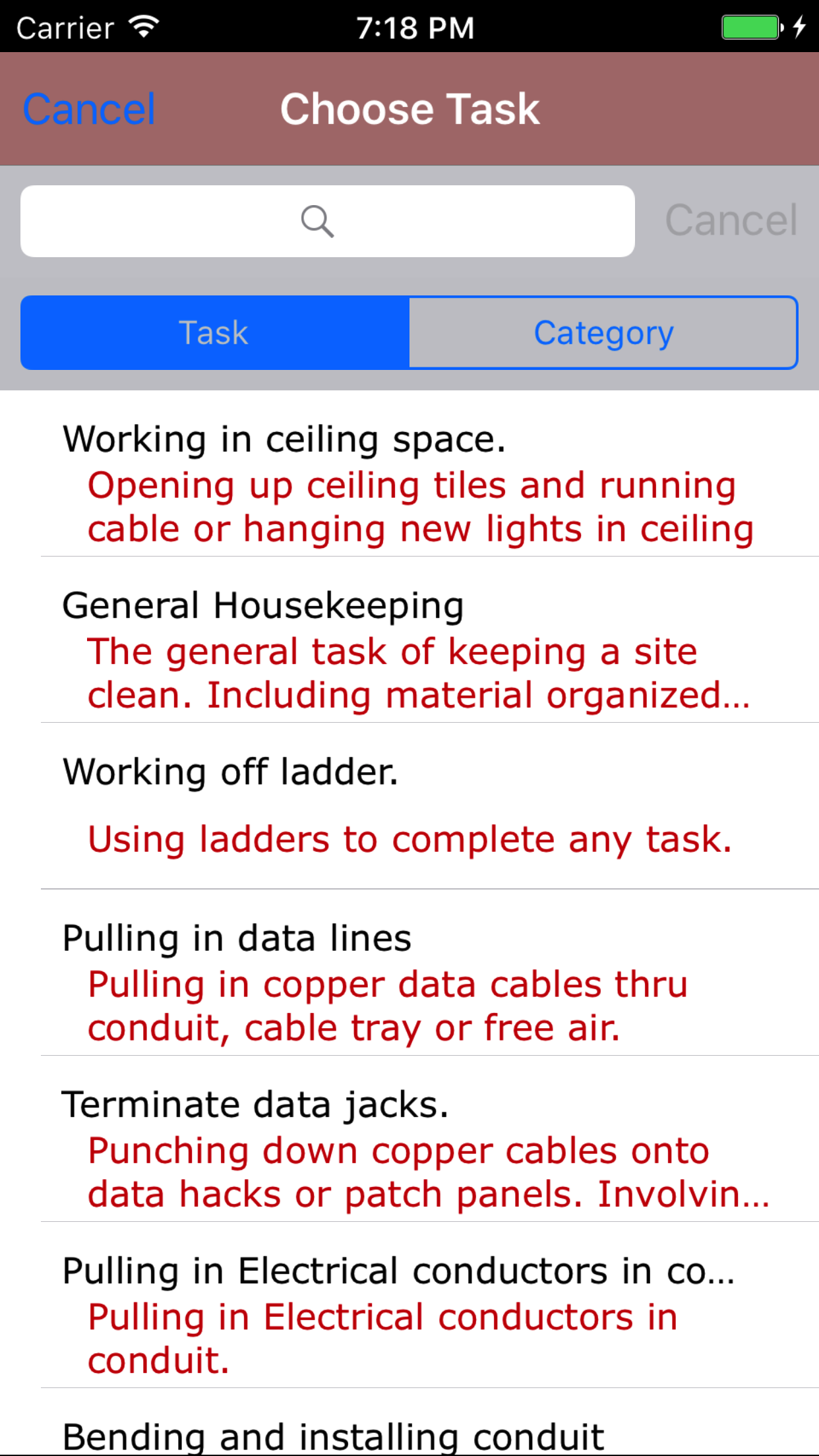 - Return to the Add Job Safety Analysis screen by either tapping Save in the top right corner to select the highlighted task category or tapping Cancel in the top left corner to leave the Task Category field unchanged.