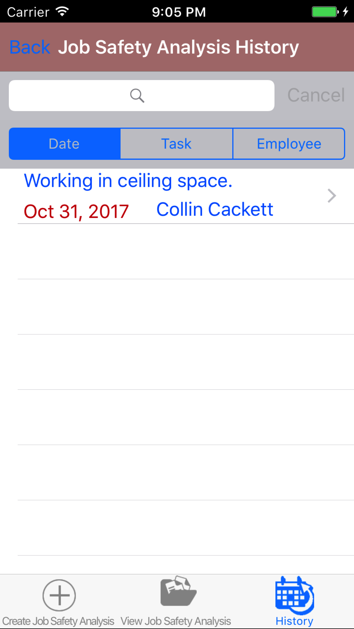 format YYYY-MM-DD. The other options for the Job Safety Analysis search are by task and employee last name. Enter your search