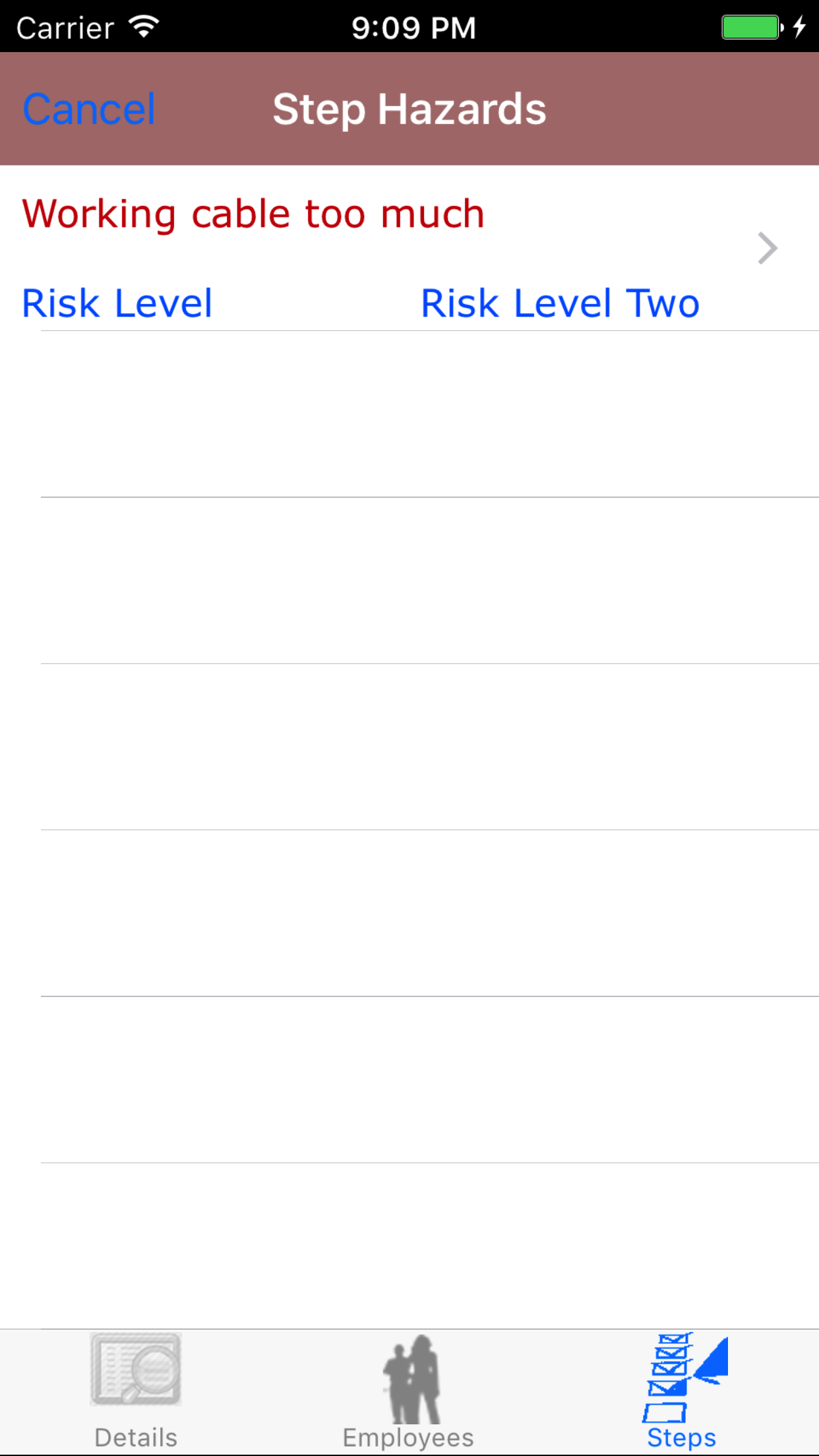 - Tap on a Steps, to load the Steps Hazard view. This loads the list of Step Hazards of a Step, displaying the hazard description, and the risk level of each task hazard.