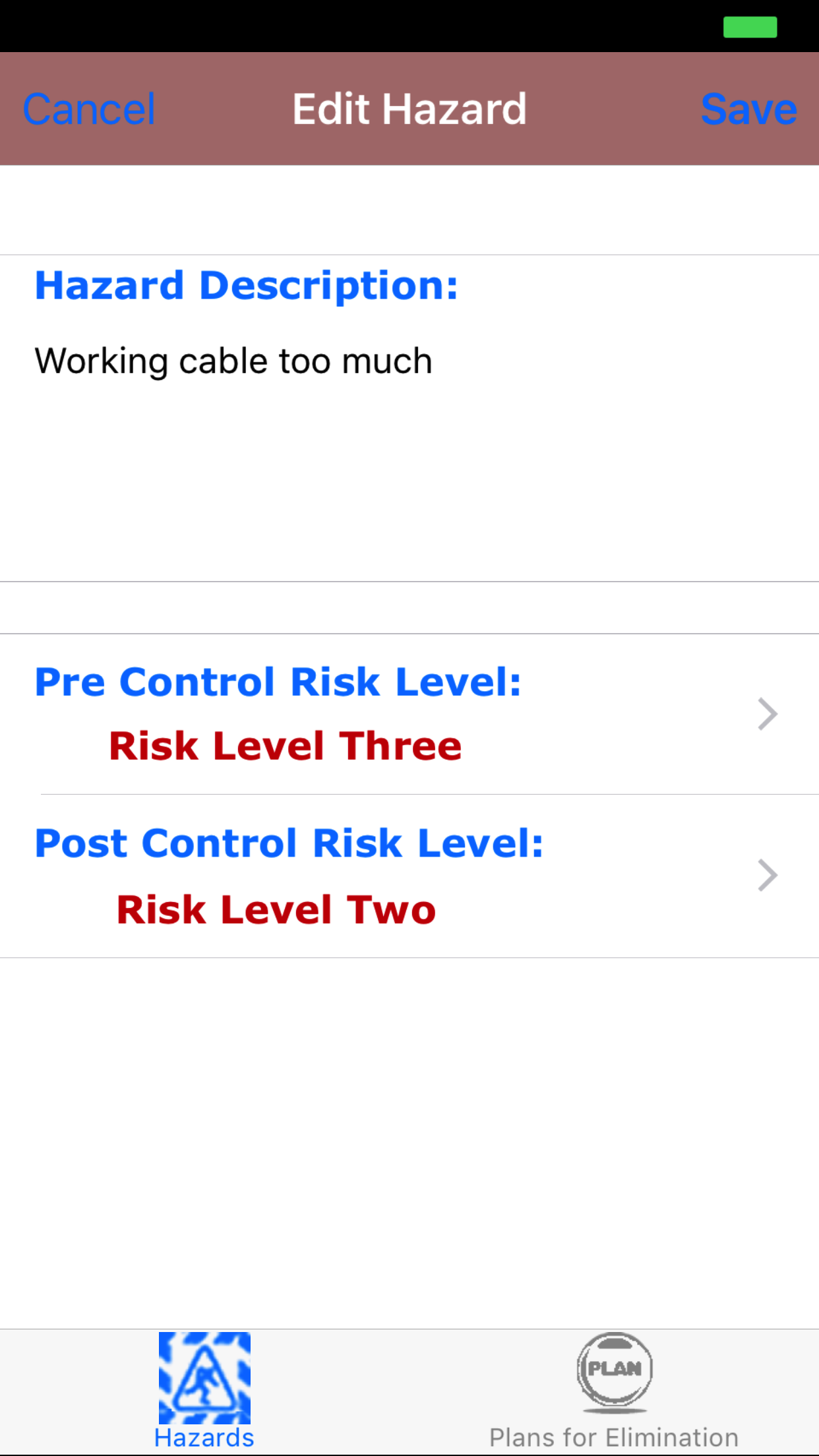 - Tap Save in the top right corner of the screen to add the plan for elimination for the task hazard for the task.