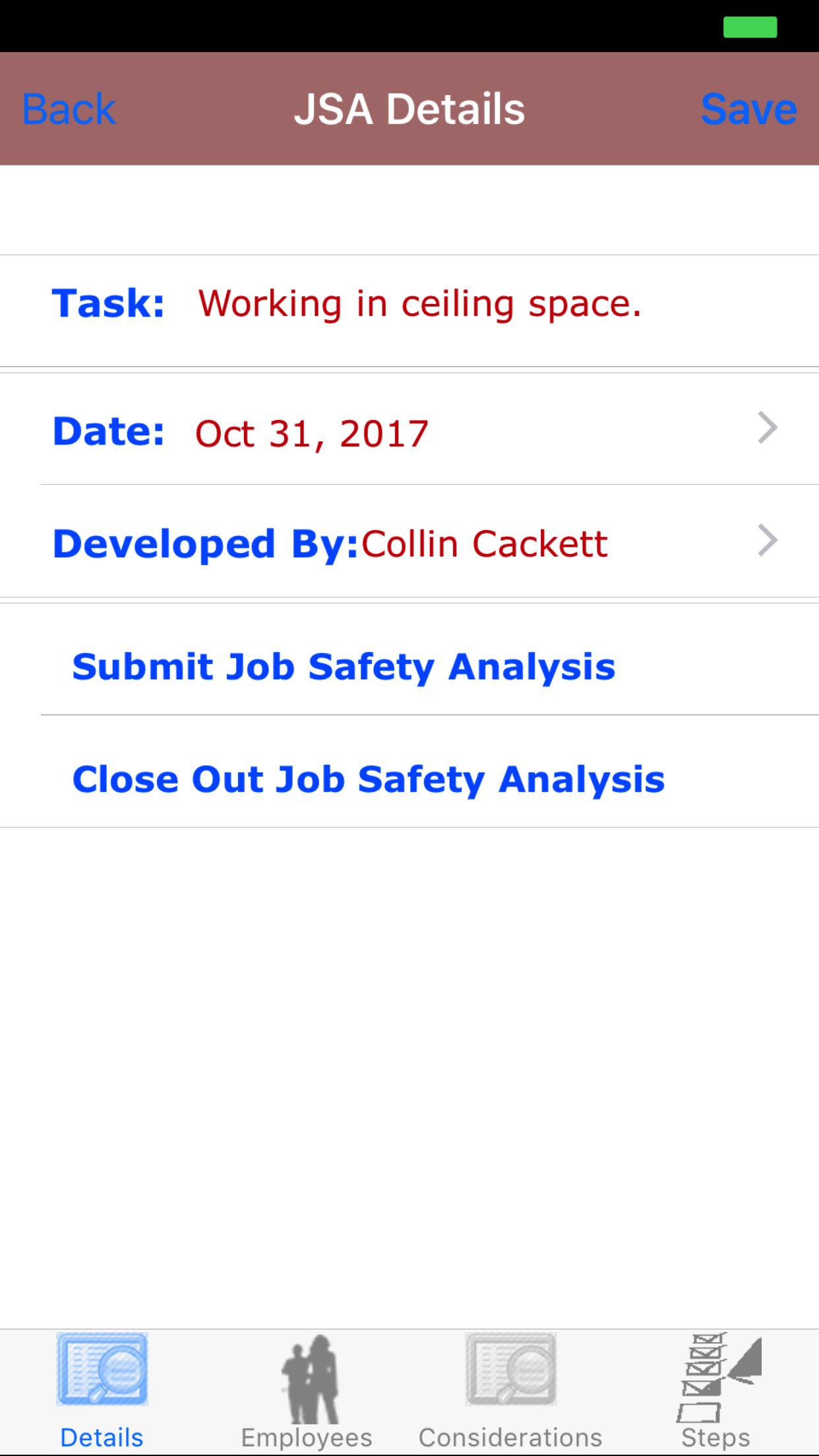 Once the Job Safety Analysis details have been entered, the employees added, the list of steps/ step hazards and plans for elimination edited to