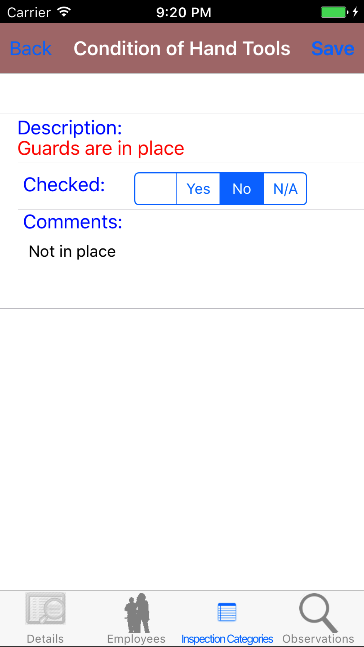 - Tap Save in the top right corner of the screen to save the condition of hand tools inspection task details