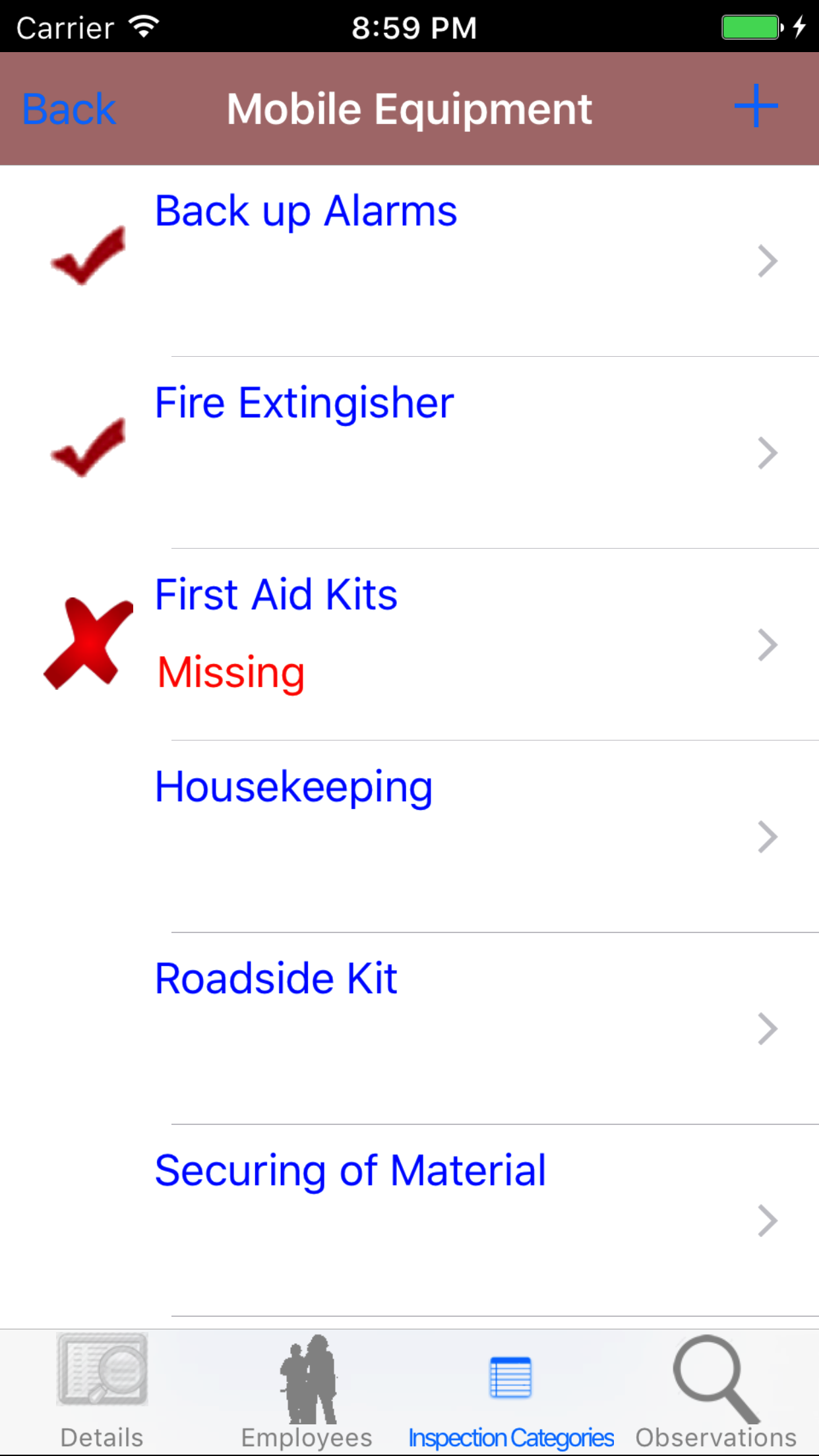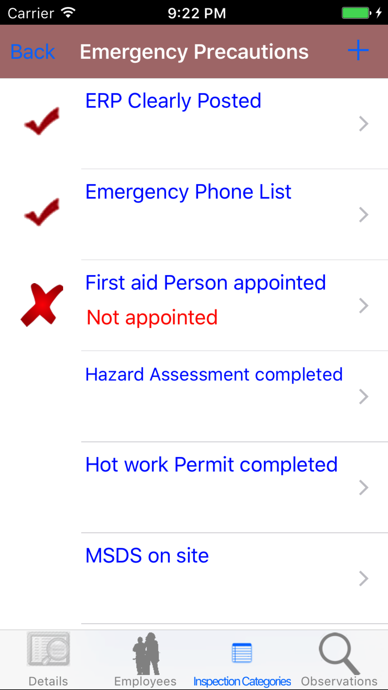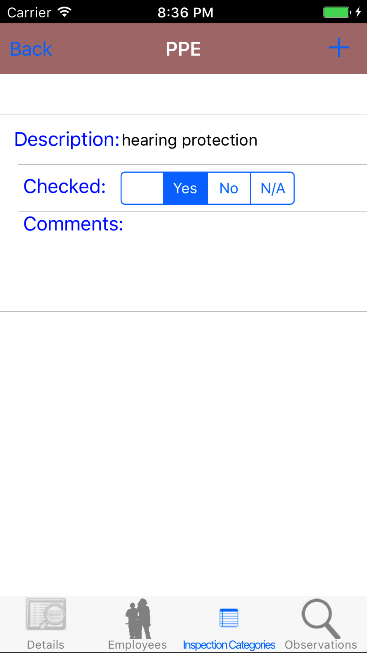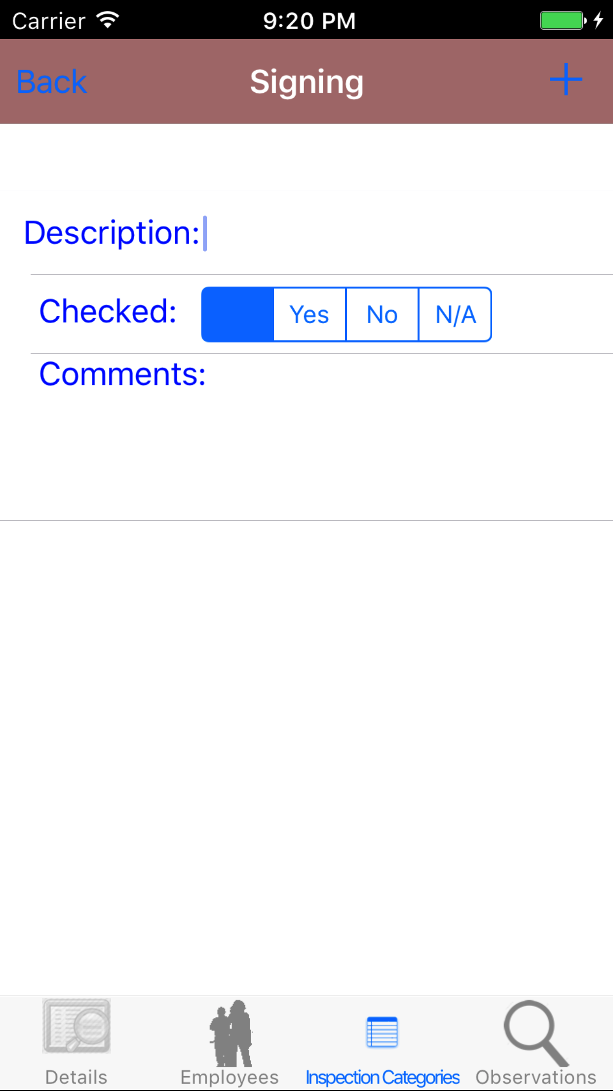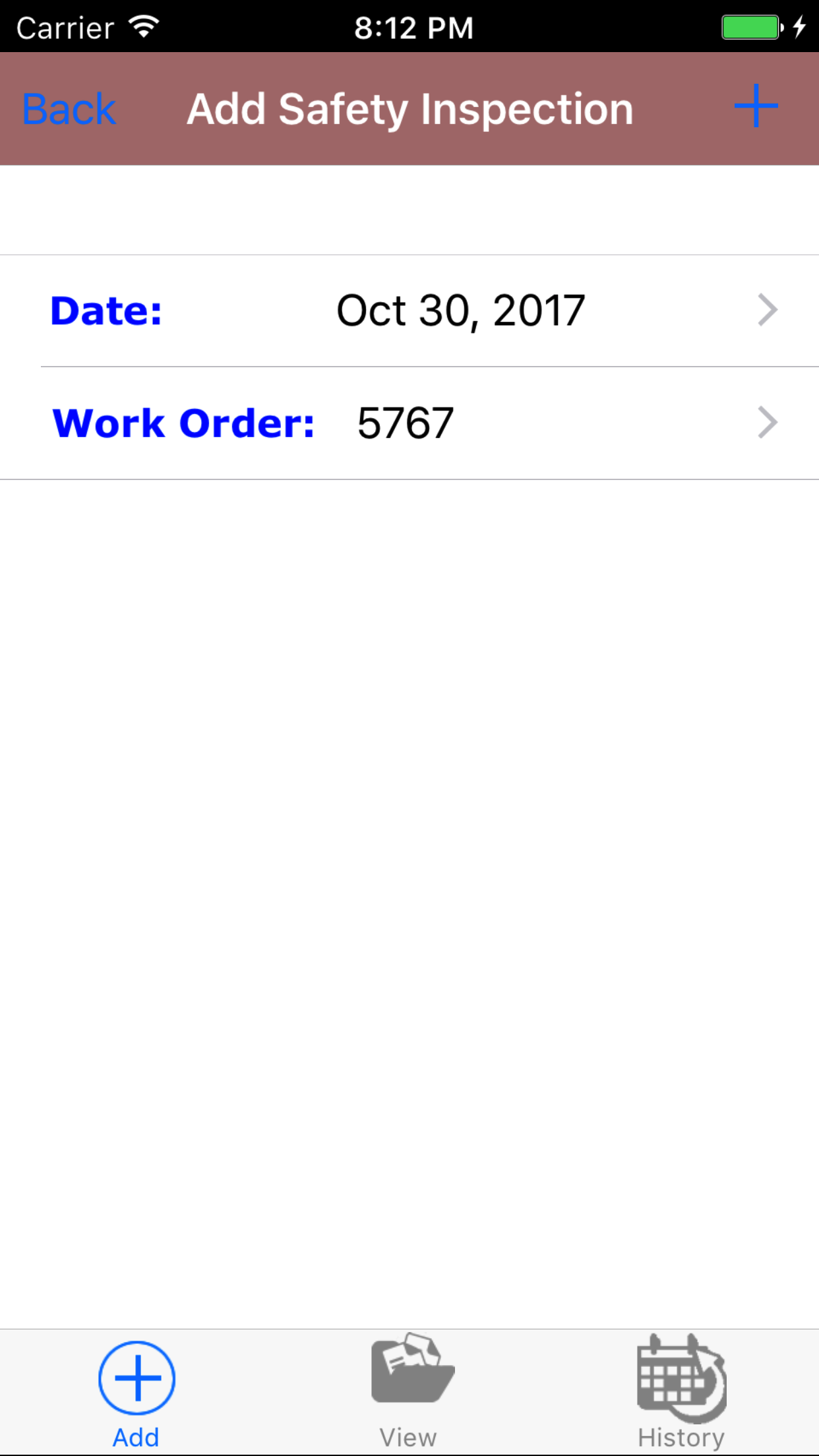 - Tap the + icon in the top right corner to add the Safety Inspection.