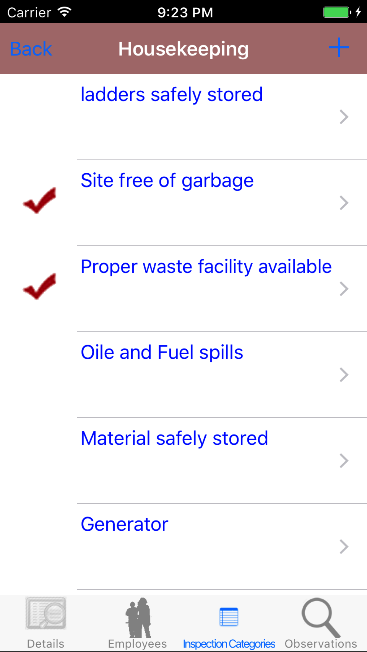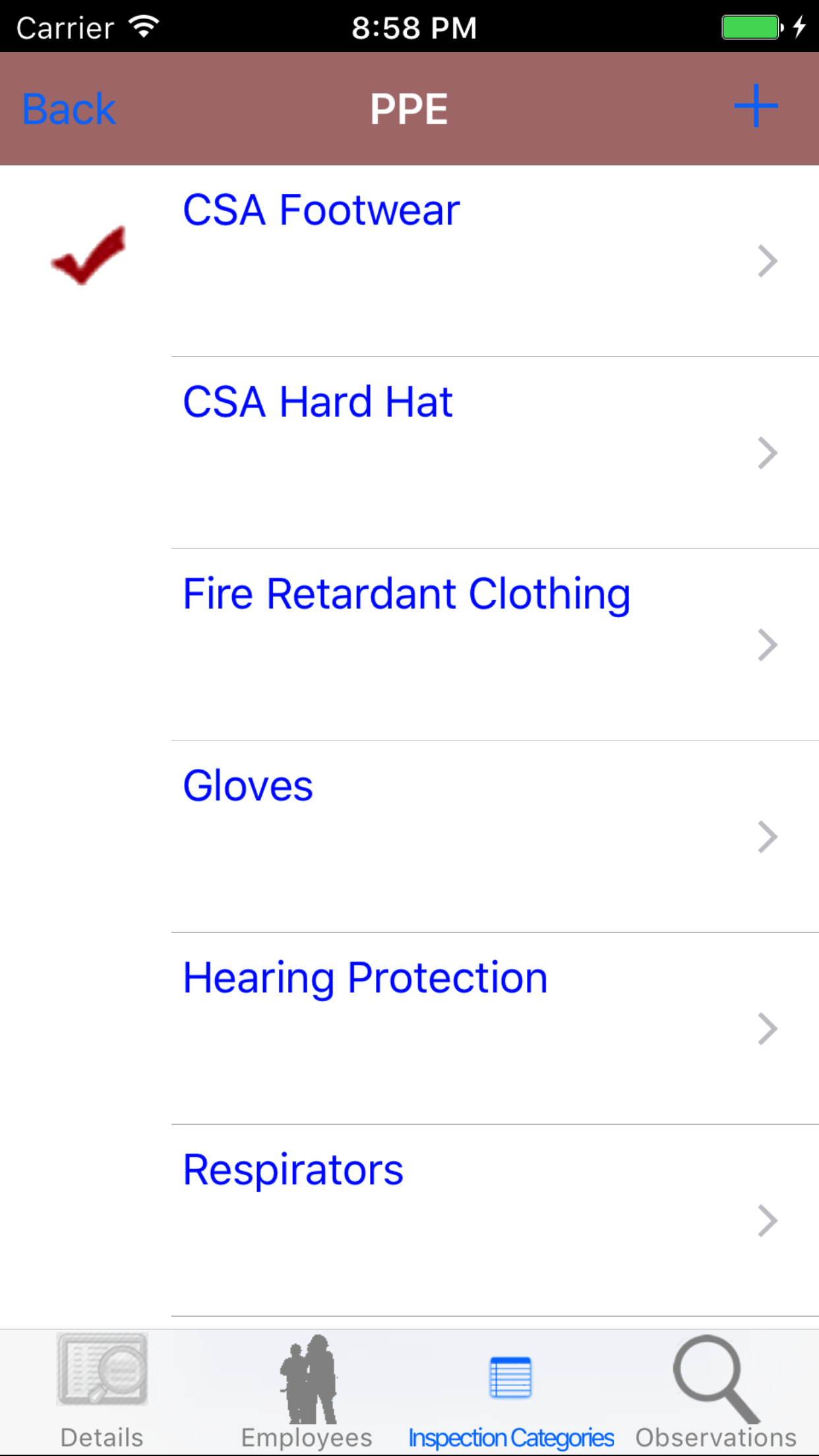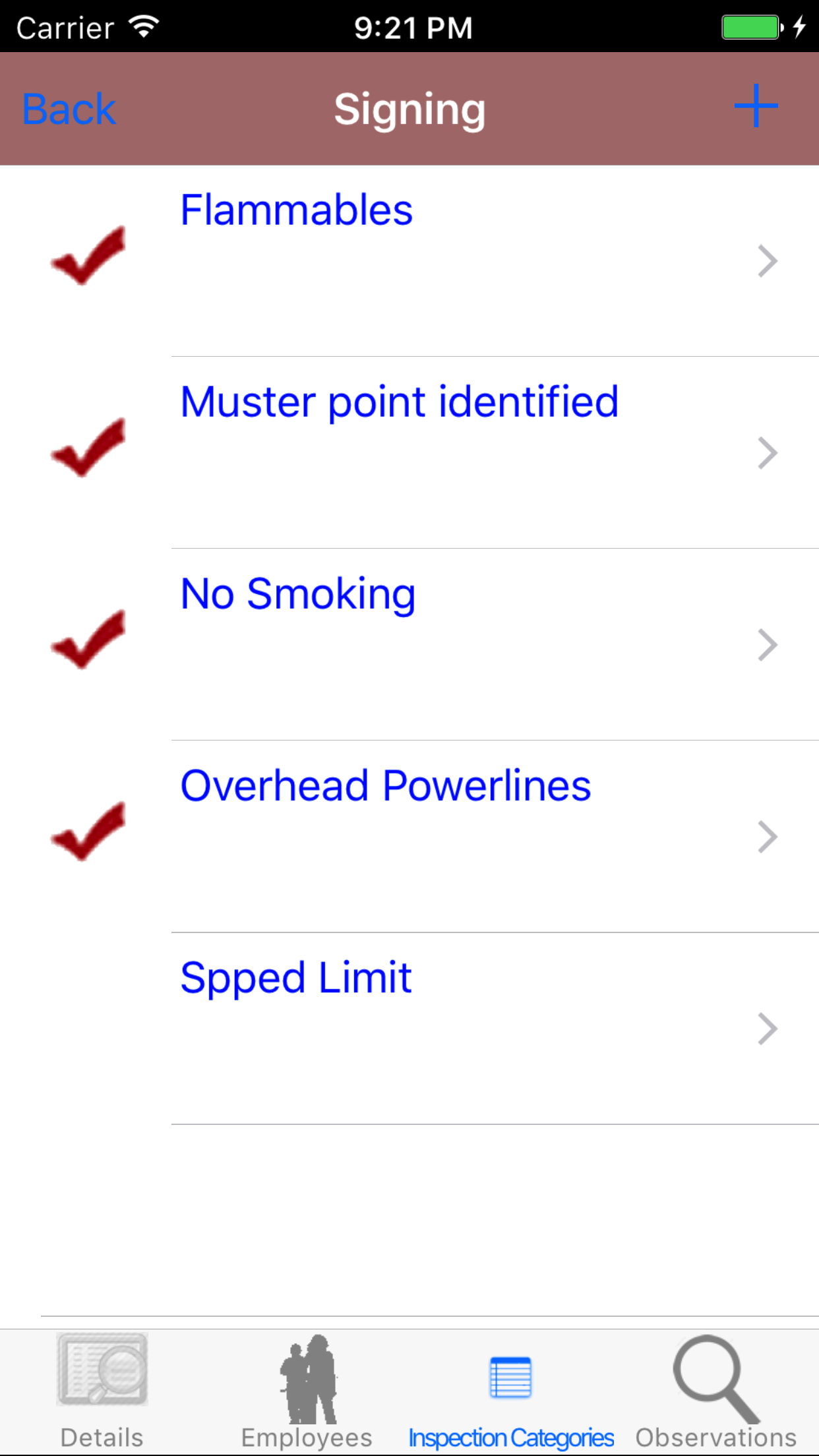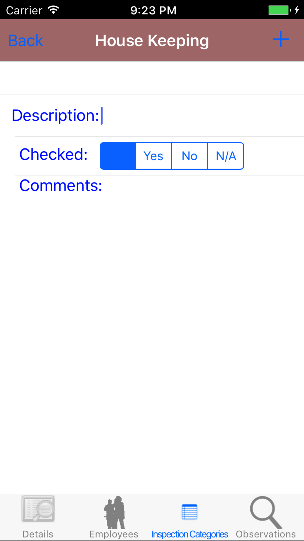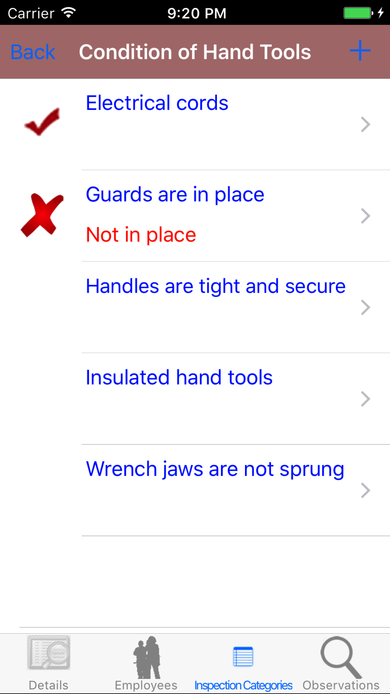 - Tap the + icon in the top right corner to add the Safety Inspection.