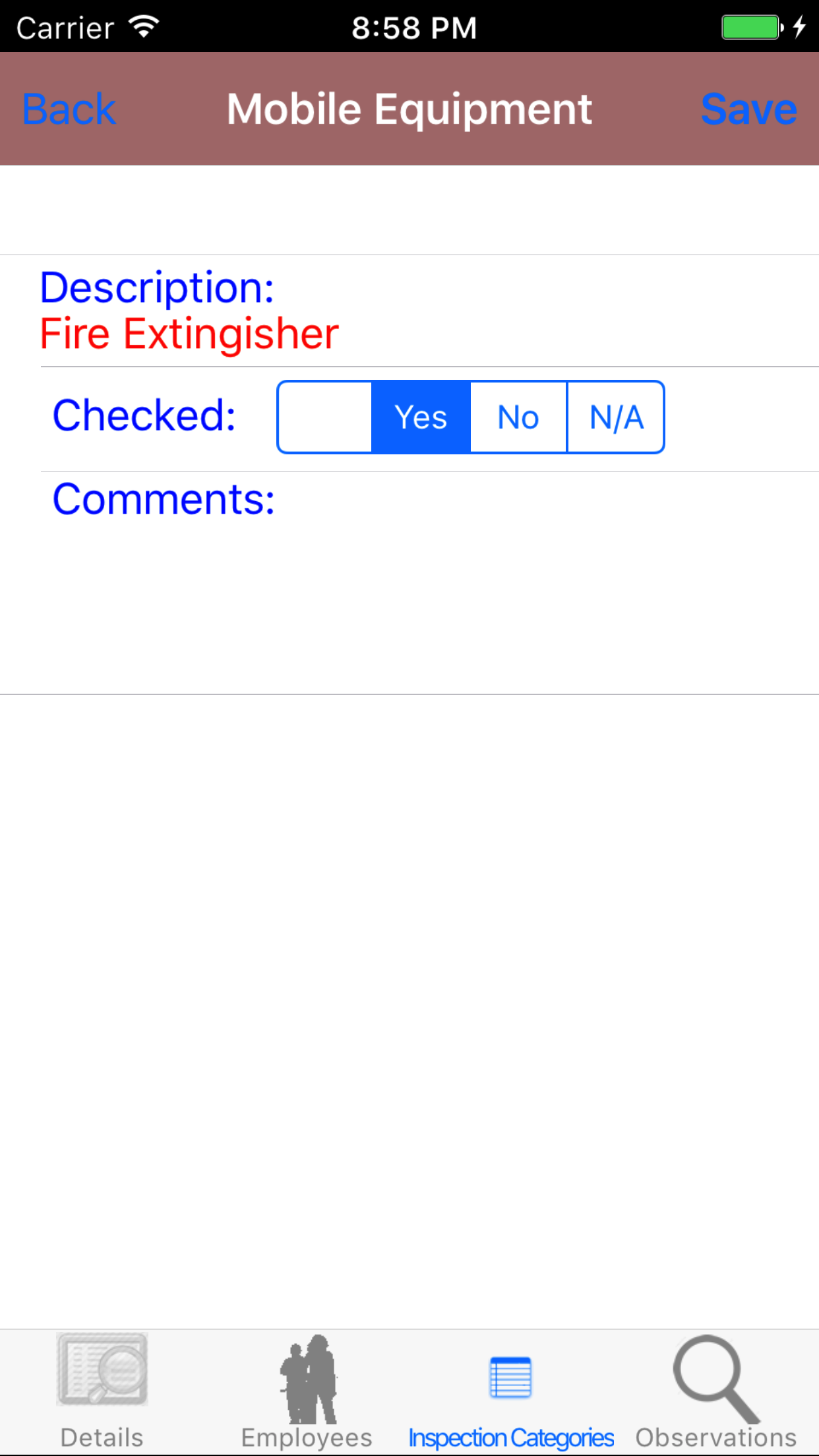 - Tap Save in the top right corner of the screen to save the mobile equipment inspection task details