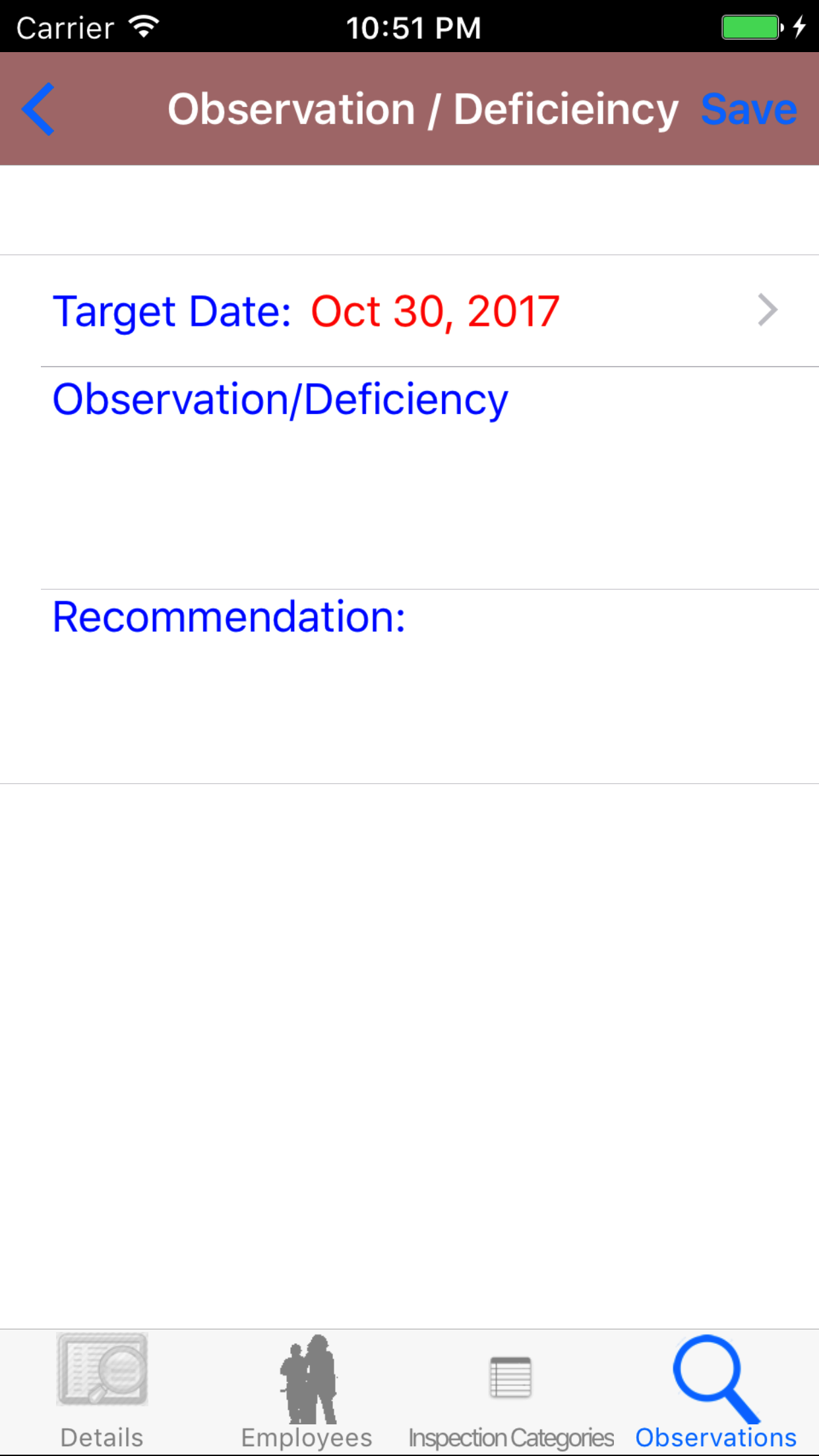 - Observation/Deficiency: The Observation/Deficiency field gives the user the ability to describe the issues found with the