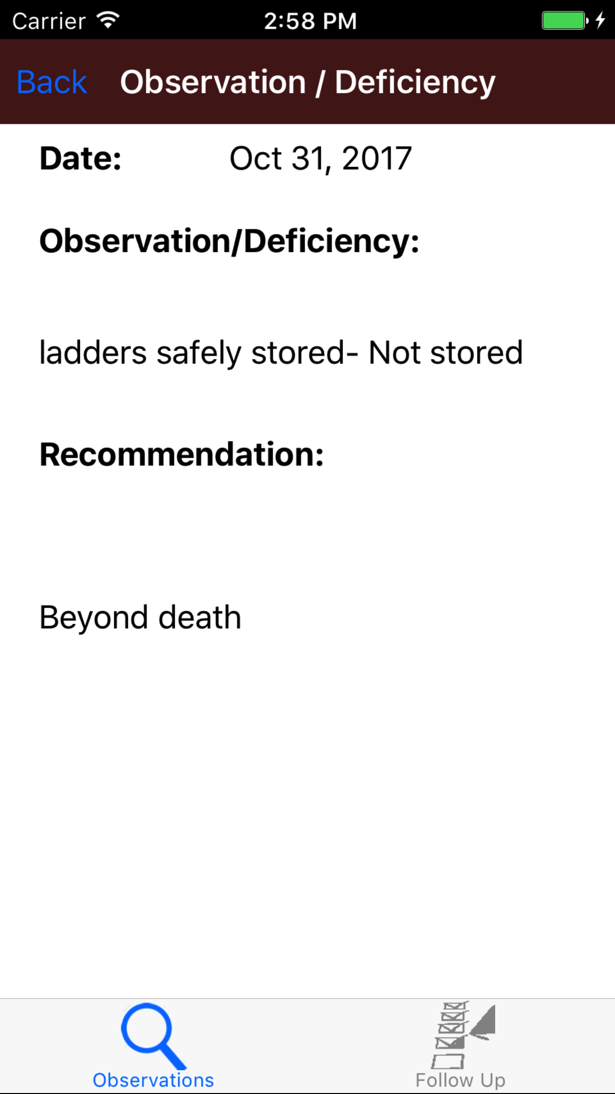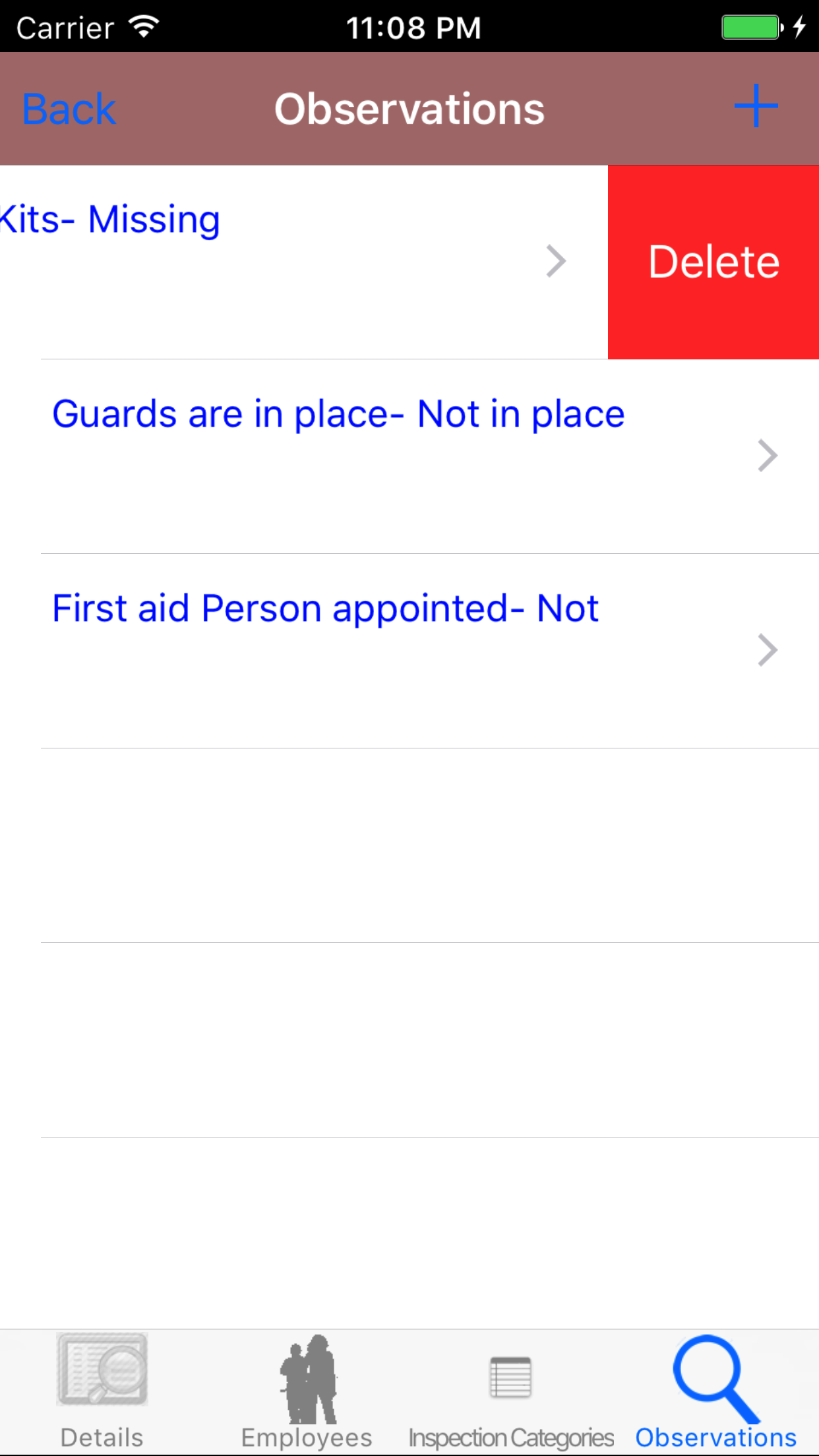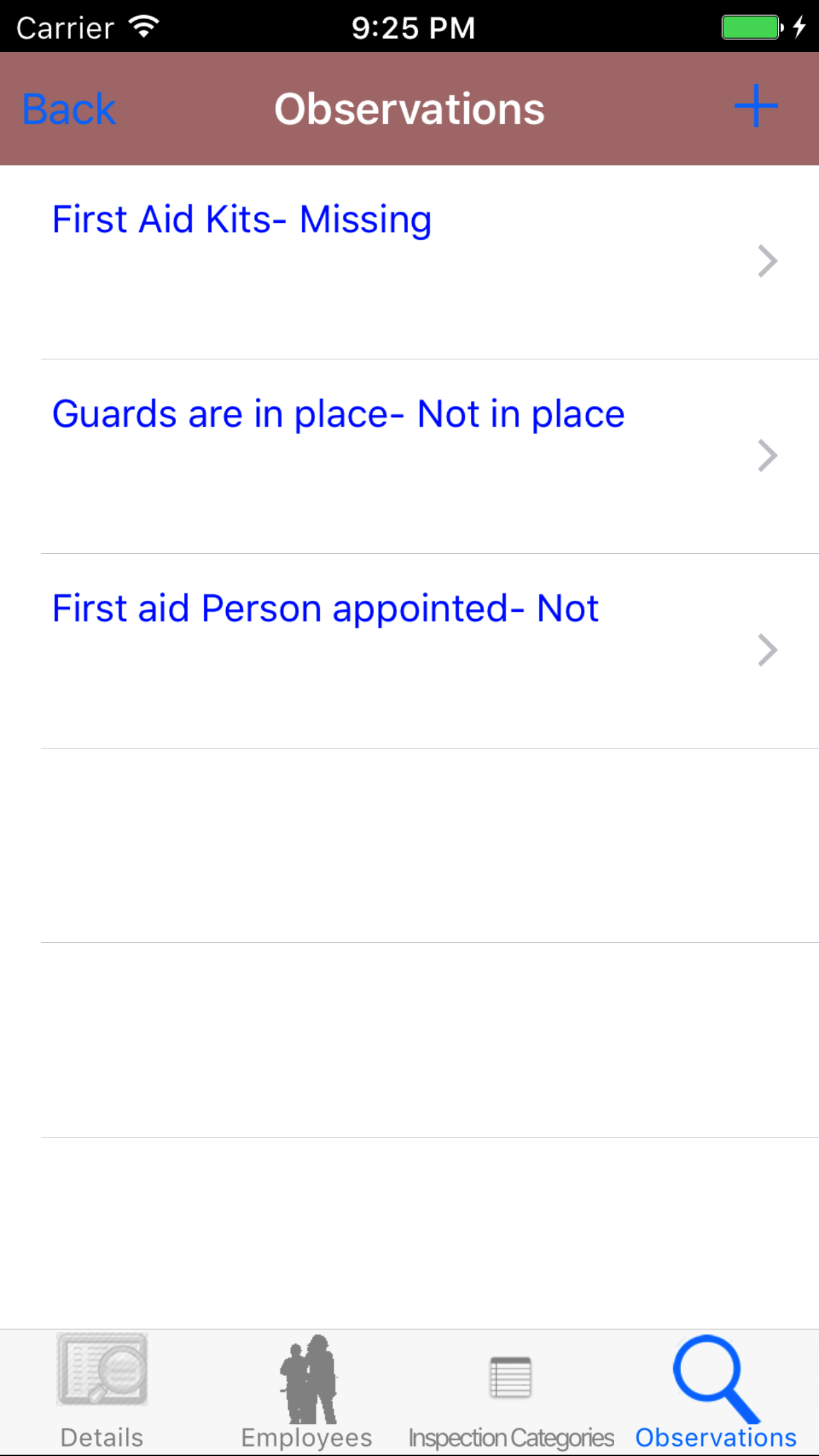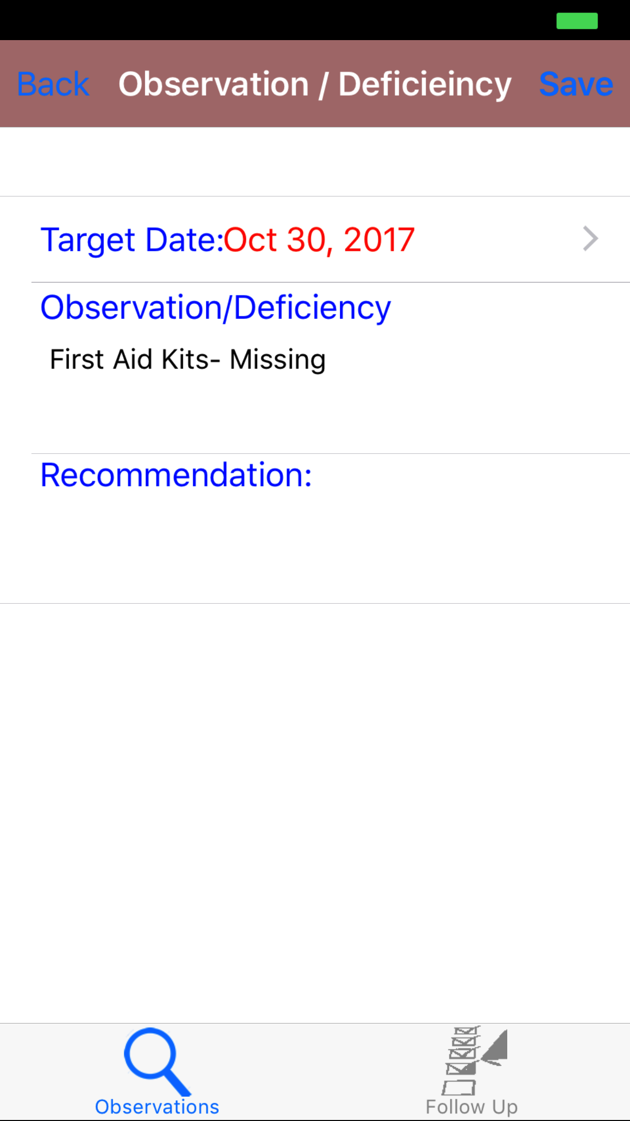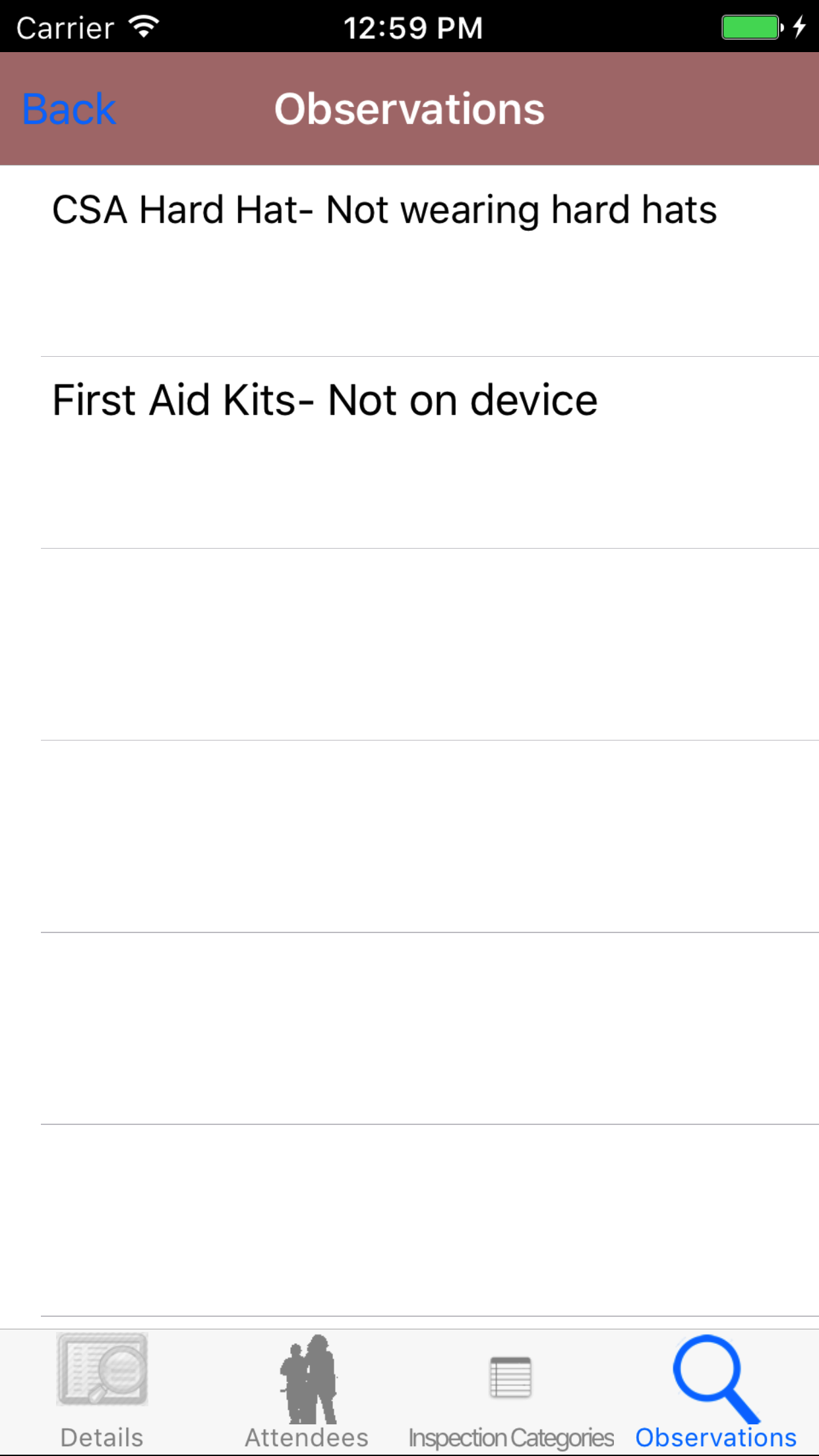 - Tap the Observation icon, the third tab. This opens the list of observations, observation/deficiency and recommendation in black text.