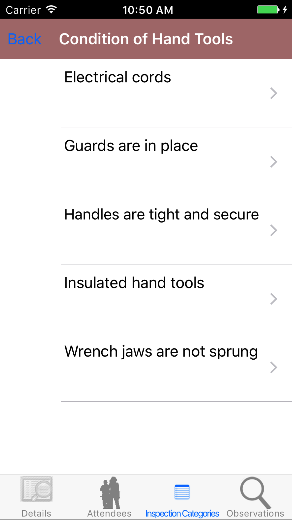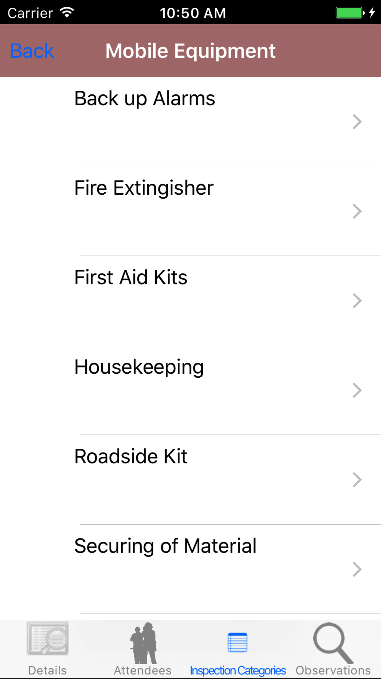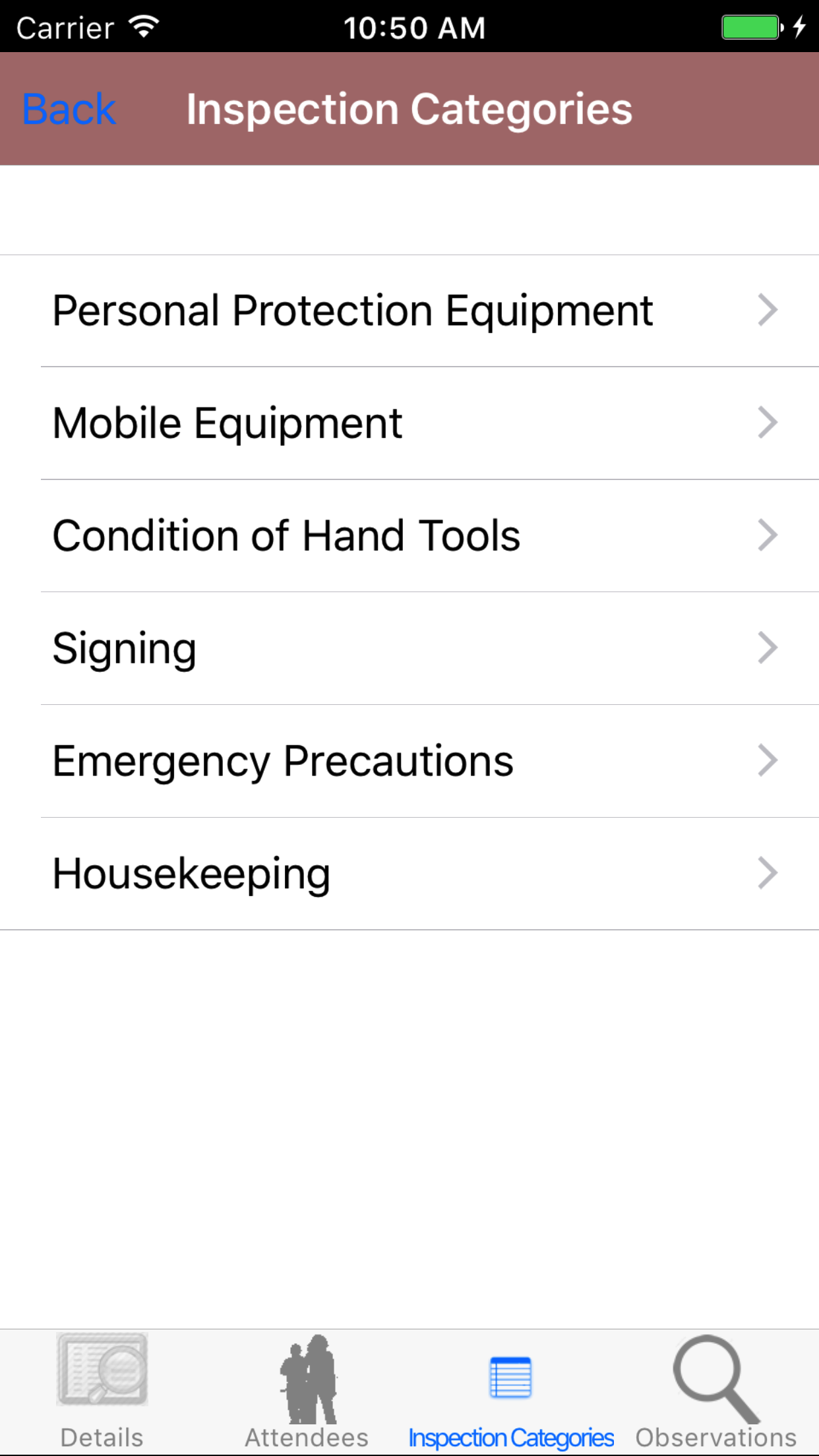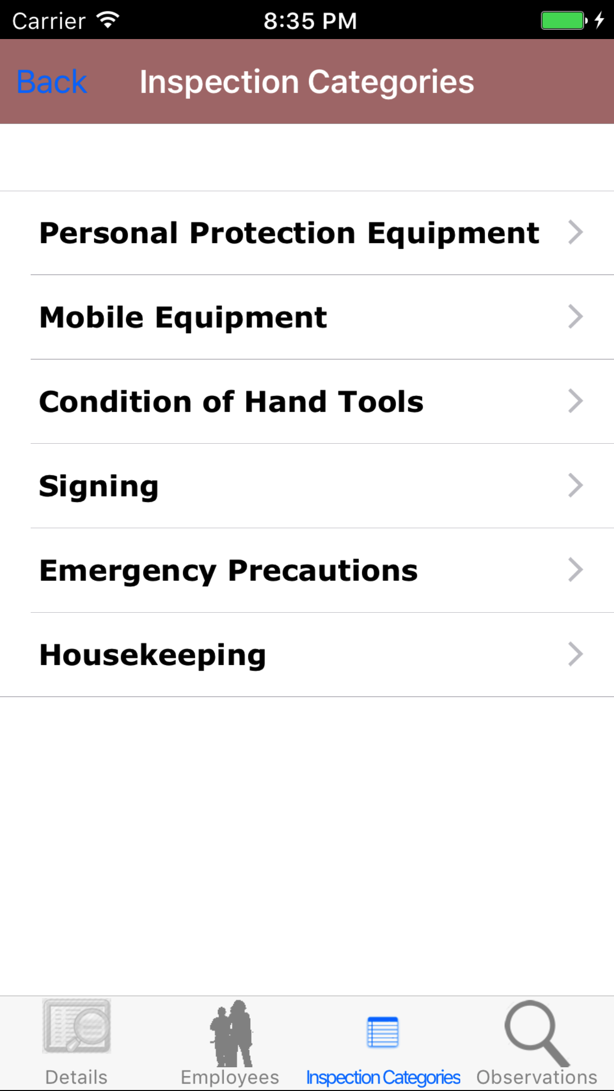 with the list of the 6 checklist categories of the safety inspection. Tap on each category to view the inspection tasks.