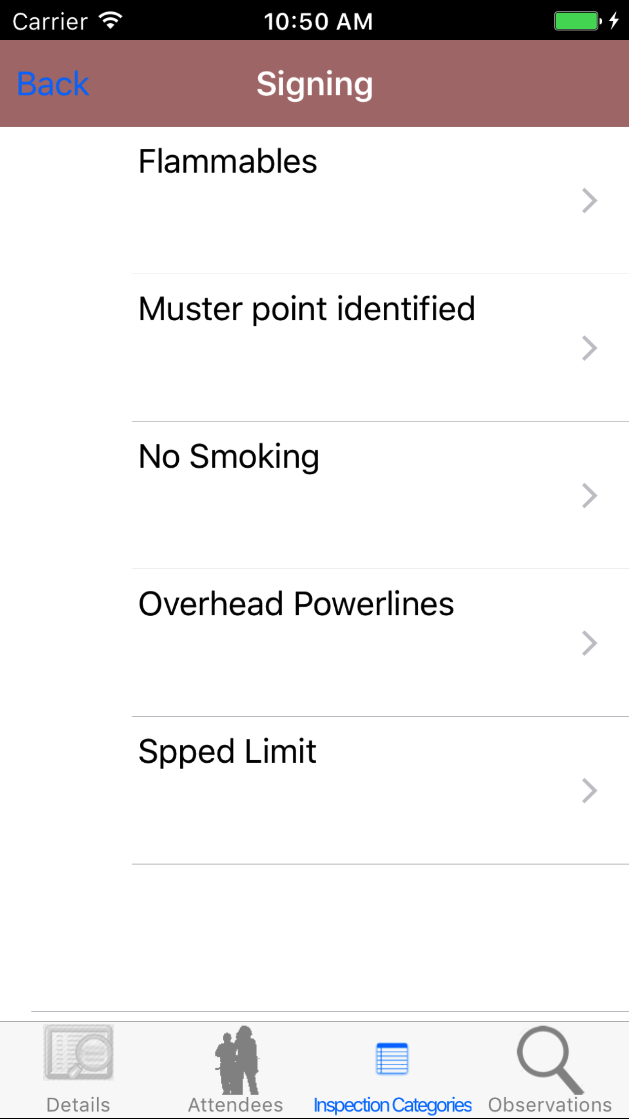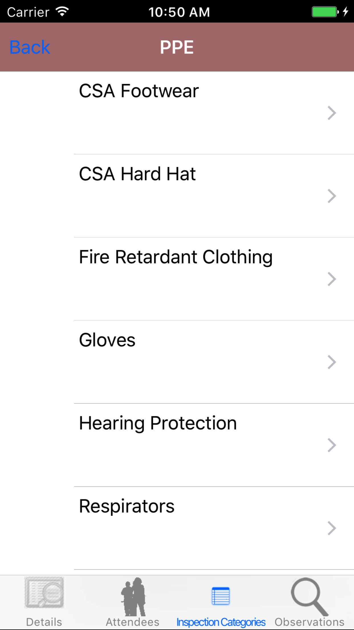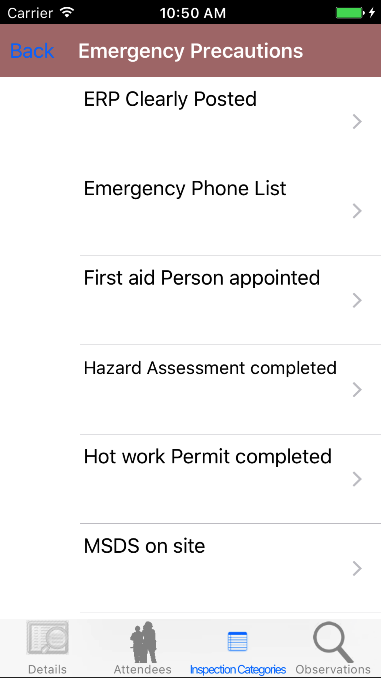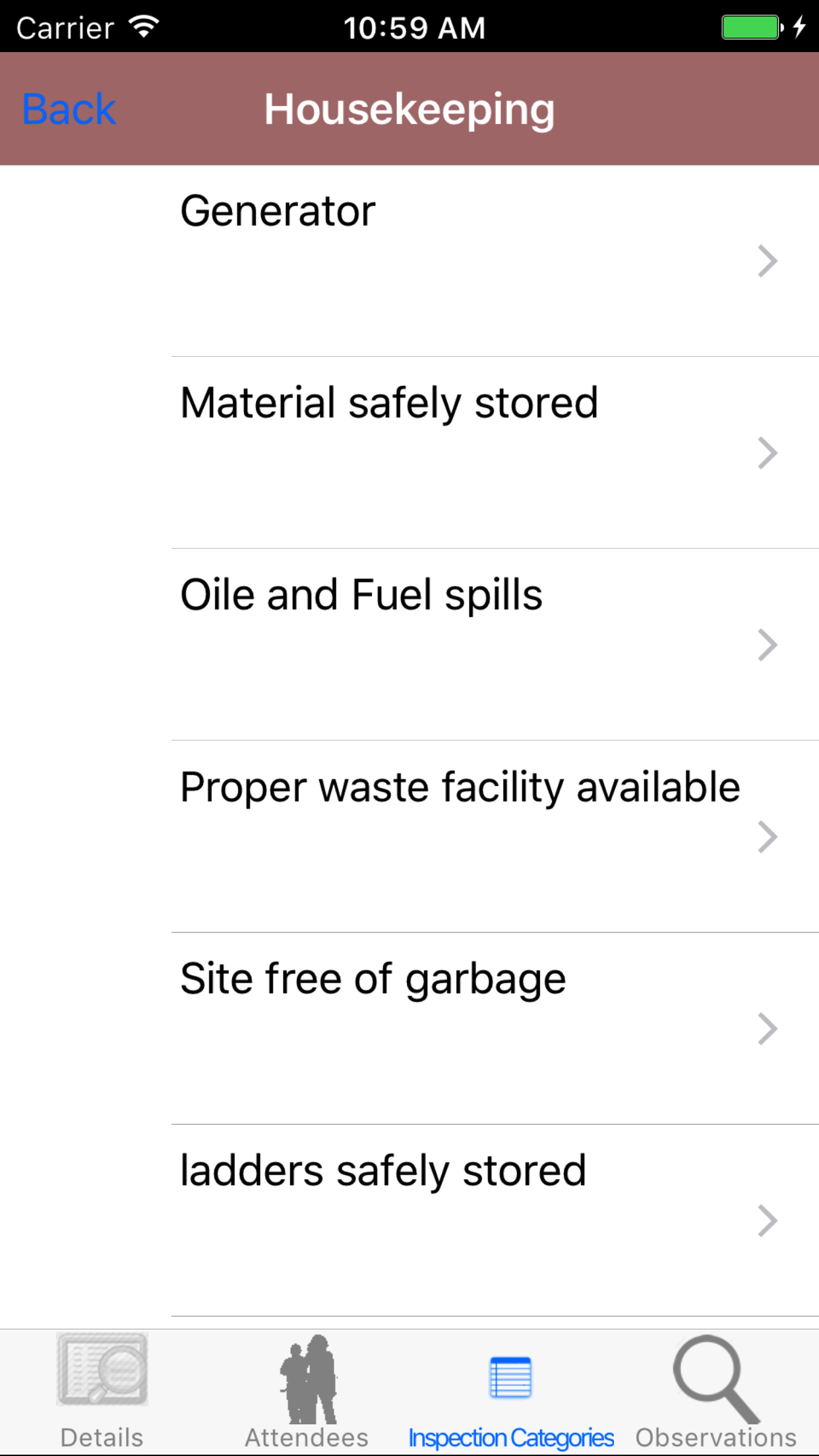 with the list of the 6 checklist categories of the safety inspection. Tap on each category to view the inspection tasks.