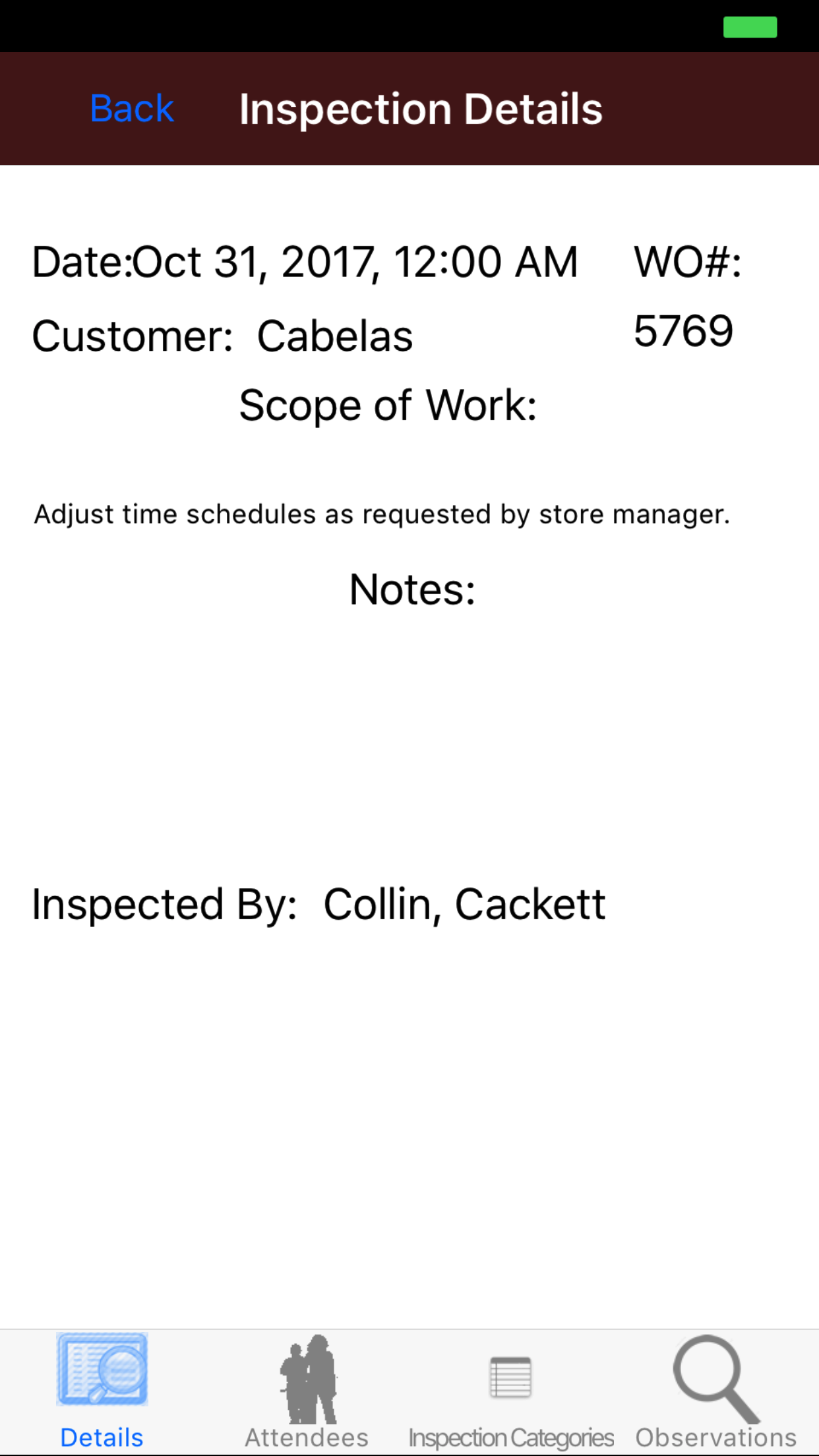 - Tap the third tab, the Inspection Categories tab of the History view.The screen loads