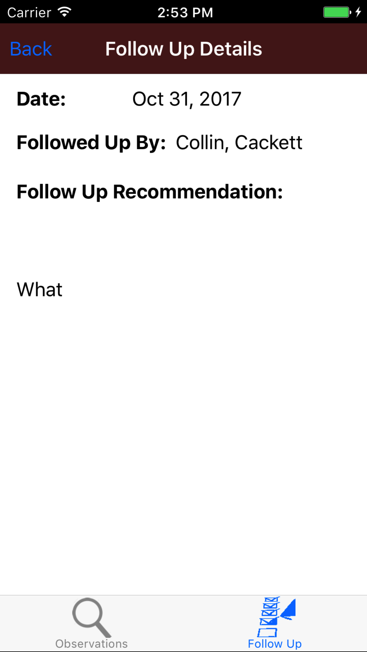 observation details, and the second tab on these details screen loads the follow up for those observations.