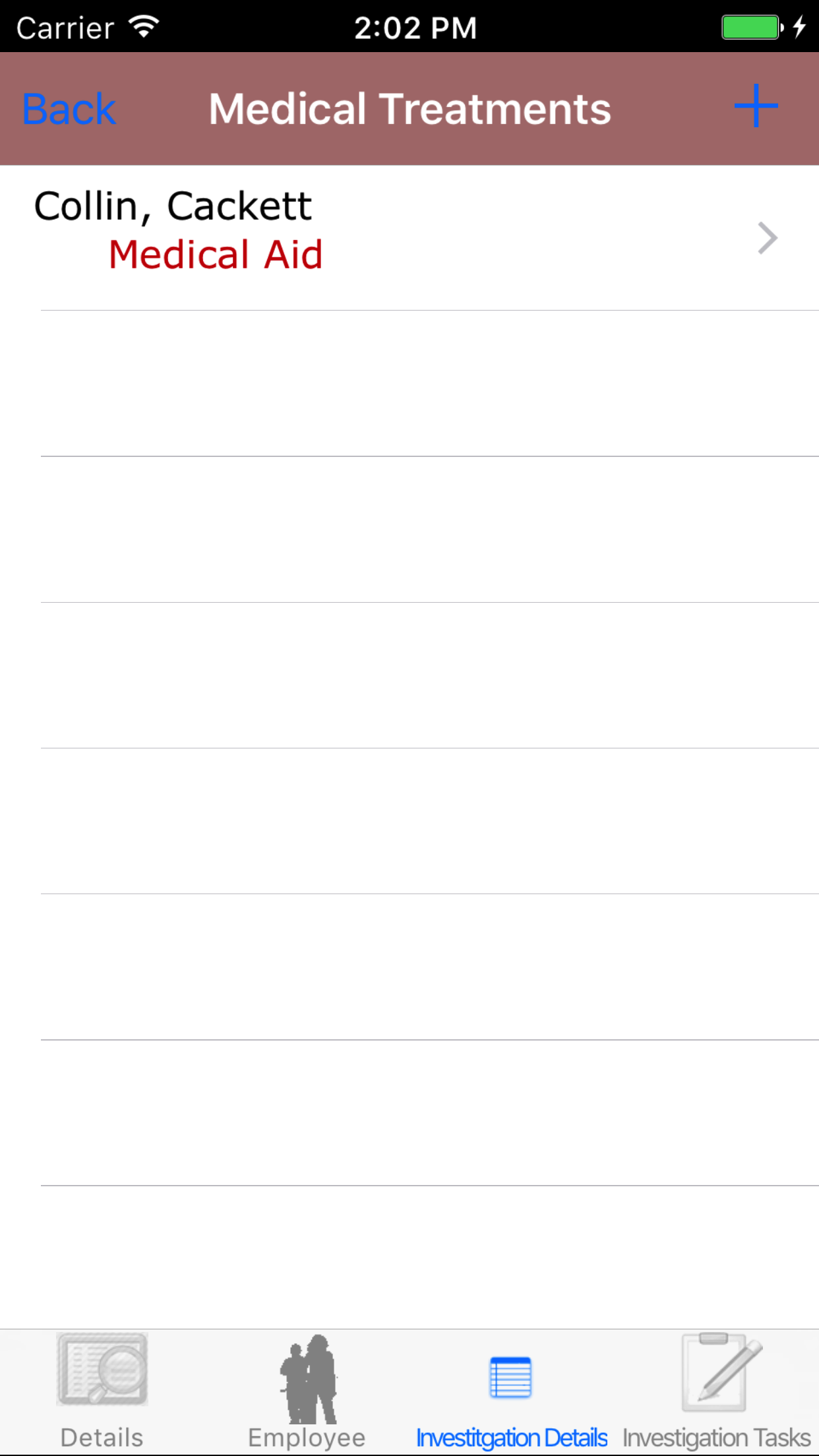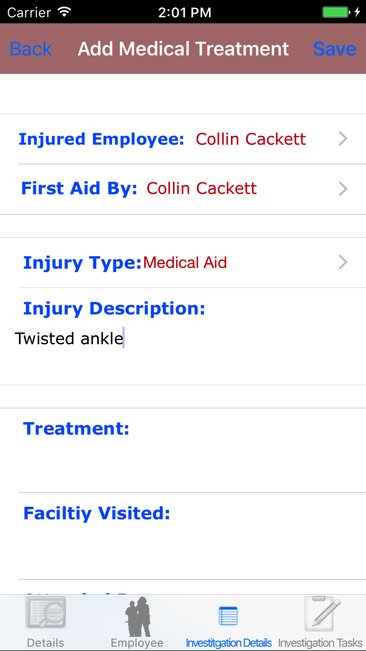 - Return to the Edit Medical Treatment screen by either tapping Save in the top right corner to select the highlighted employee or tapping Cancel in the top left corner to leave the Employee field unchanged.