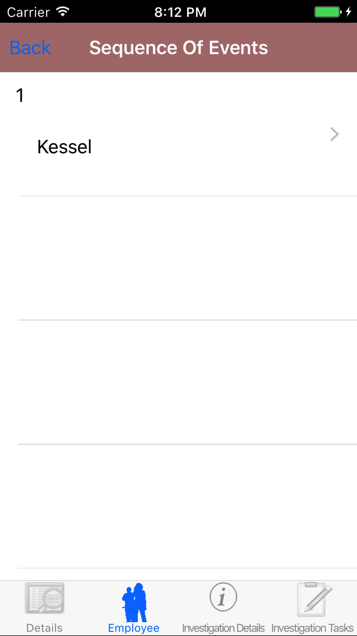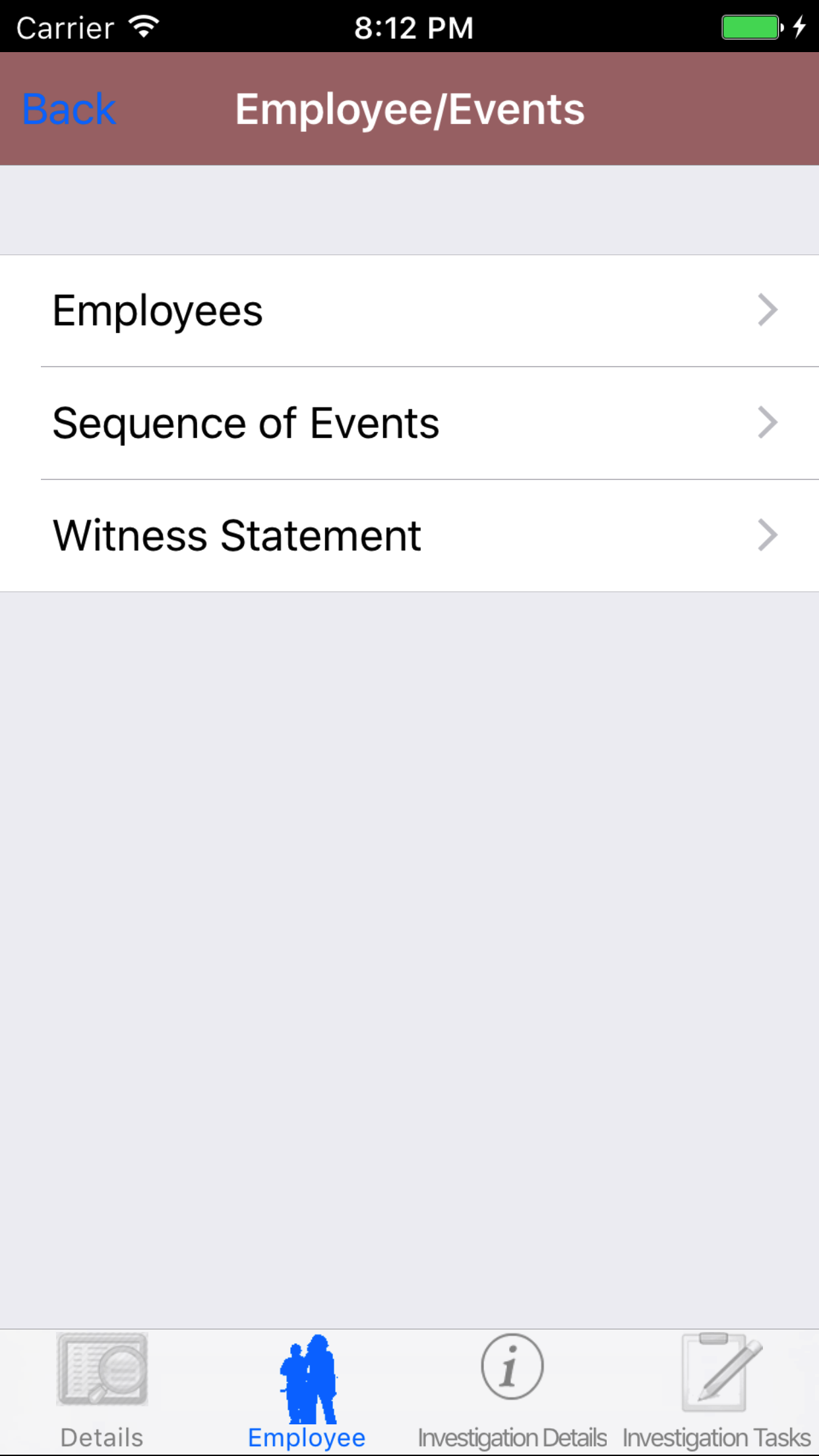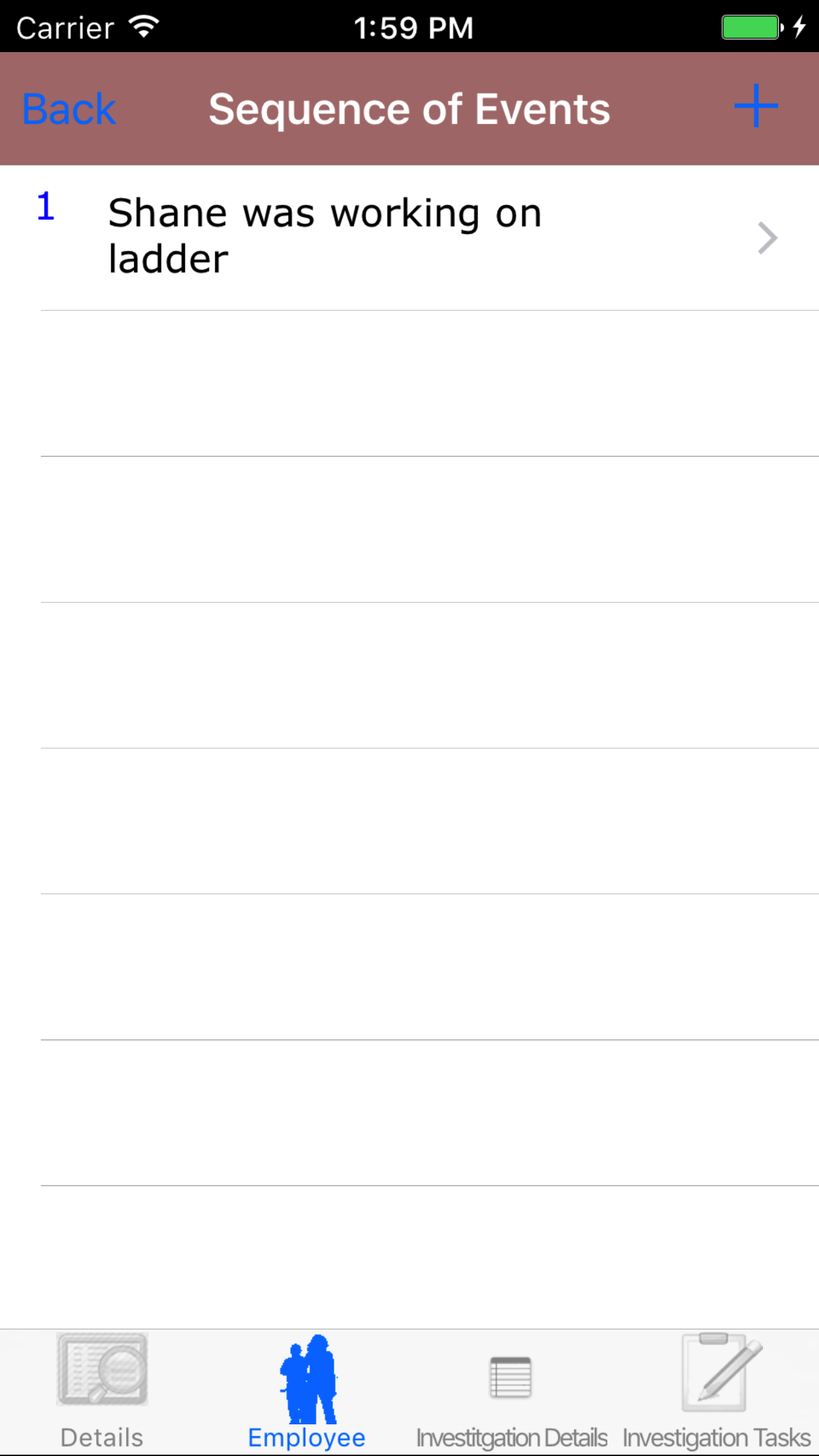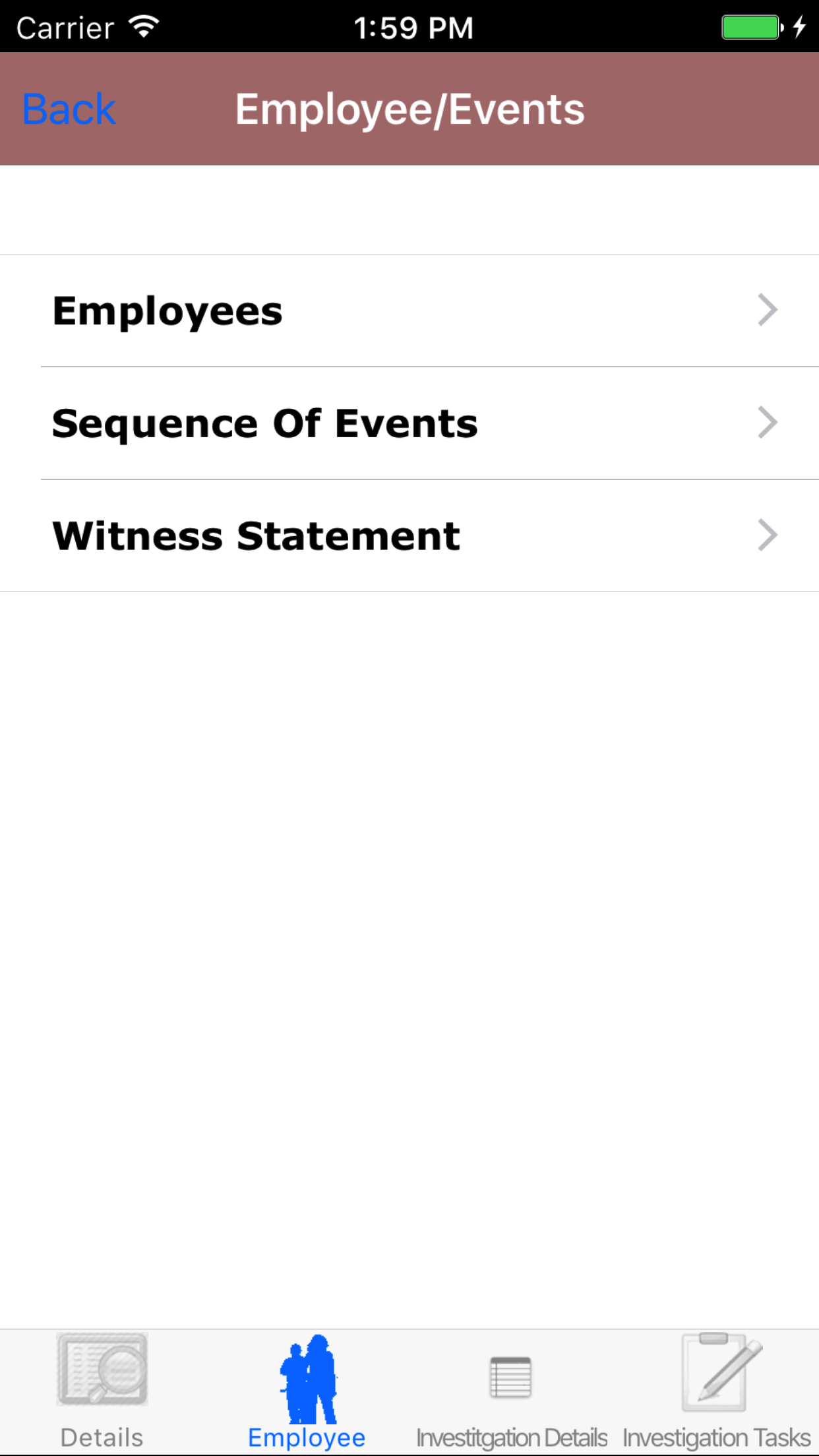 - Tap the Employee icon, the second tab. This opens the list of Employees, Sequence of Events, and Witness Statement.