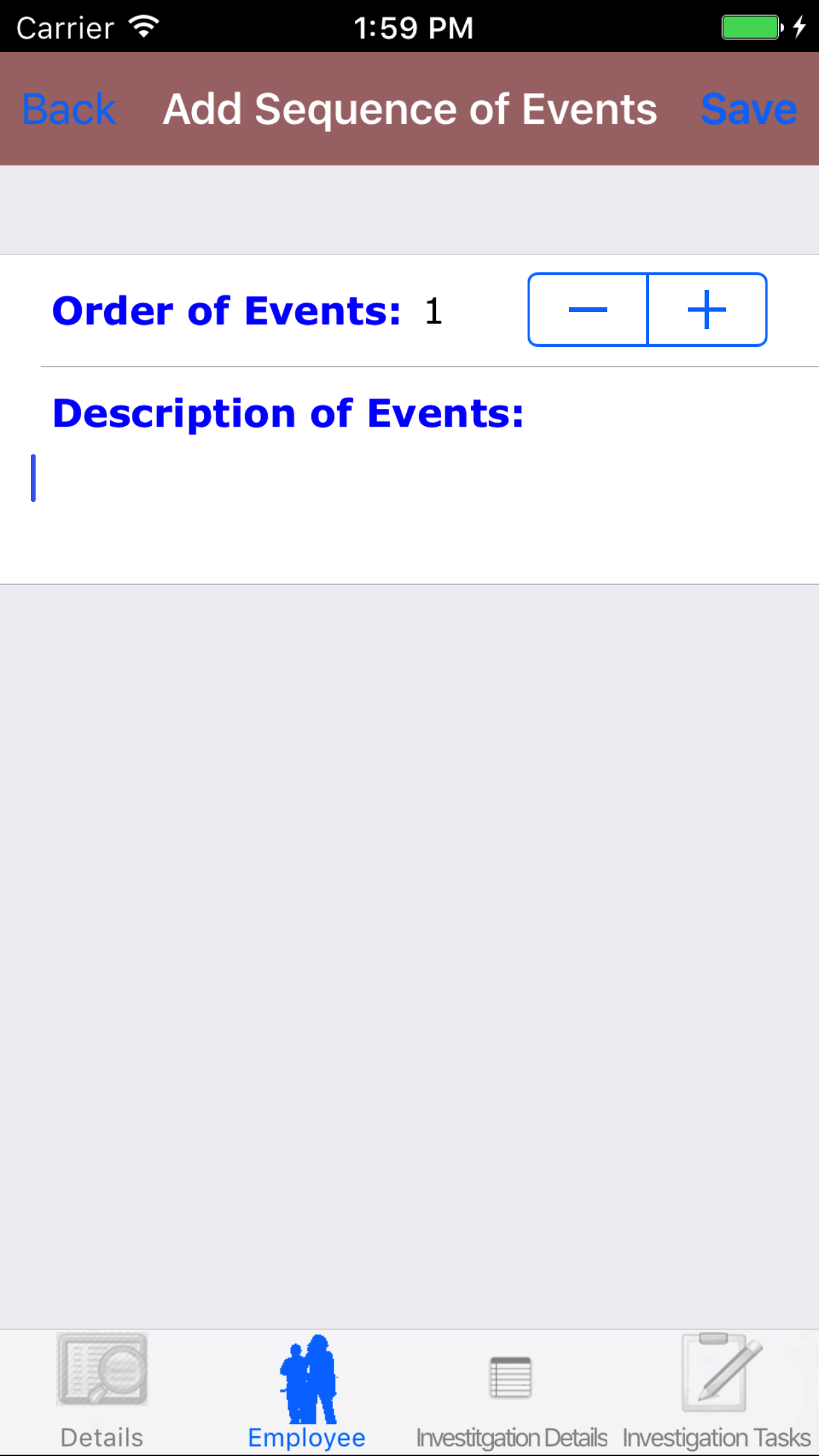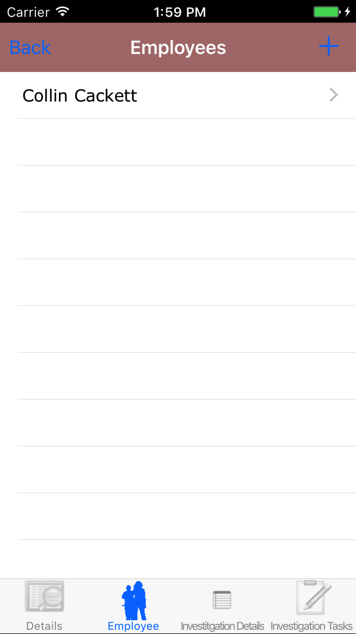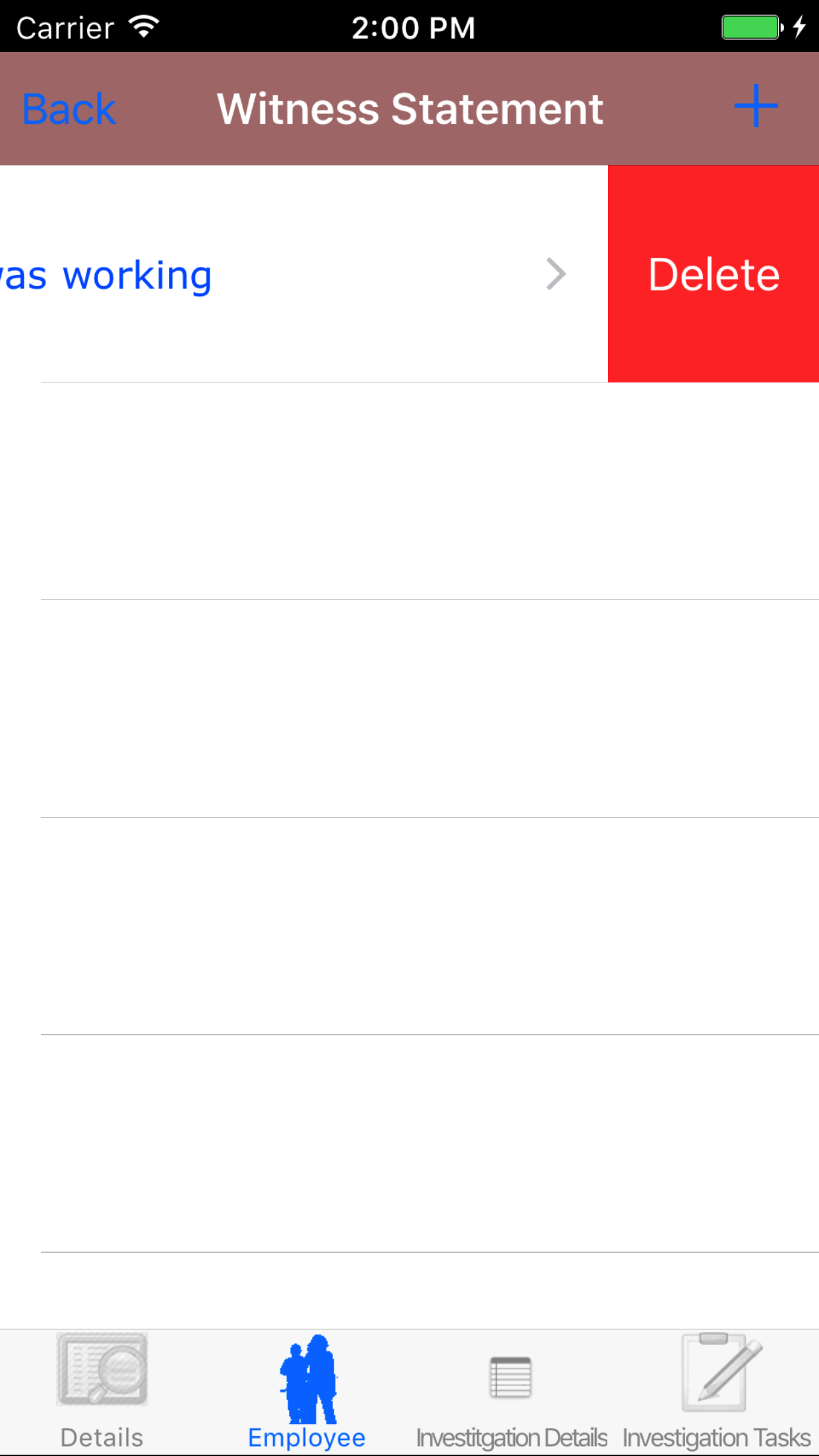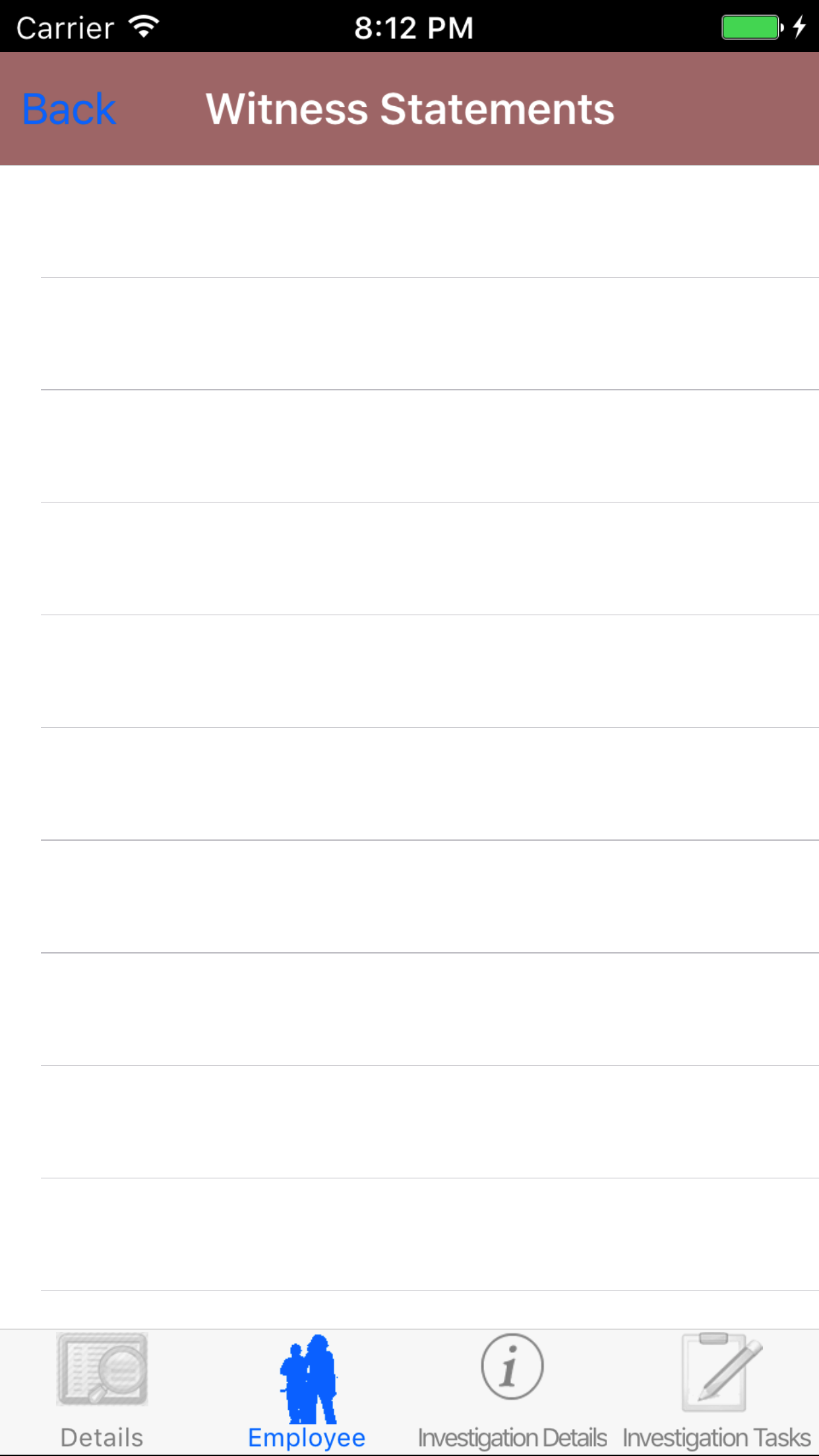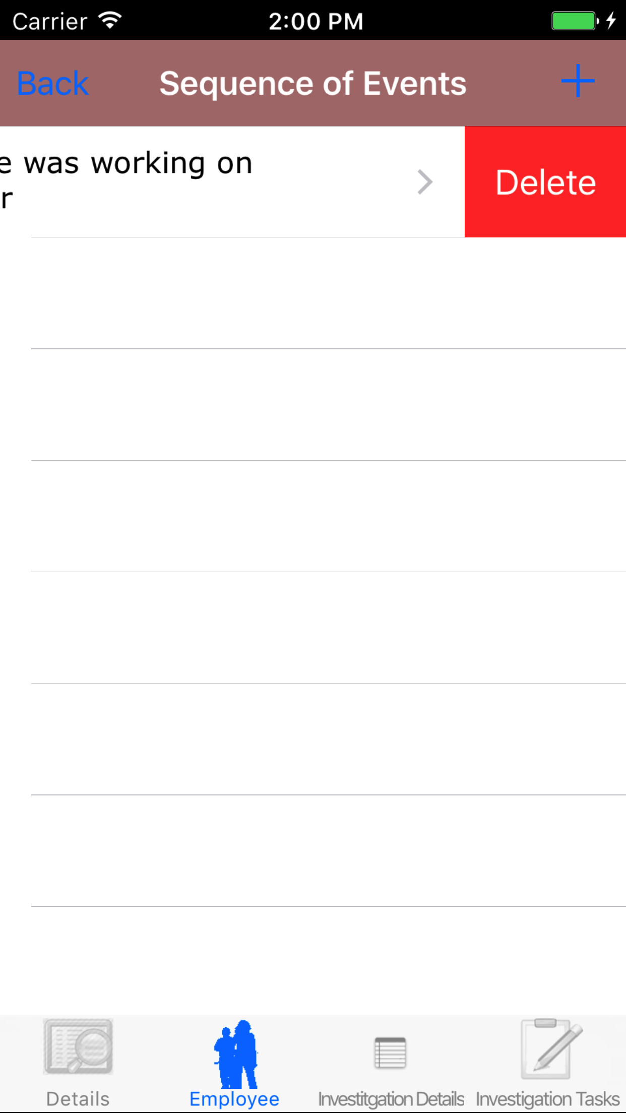 - Tap the Employee icon, the second tab. This opens the list of Employees, Sequence of Events, and Witness Statement.