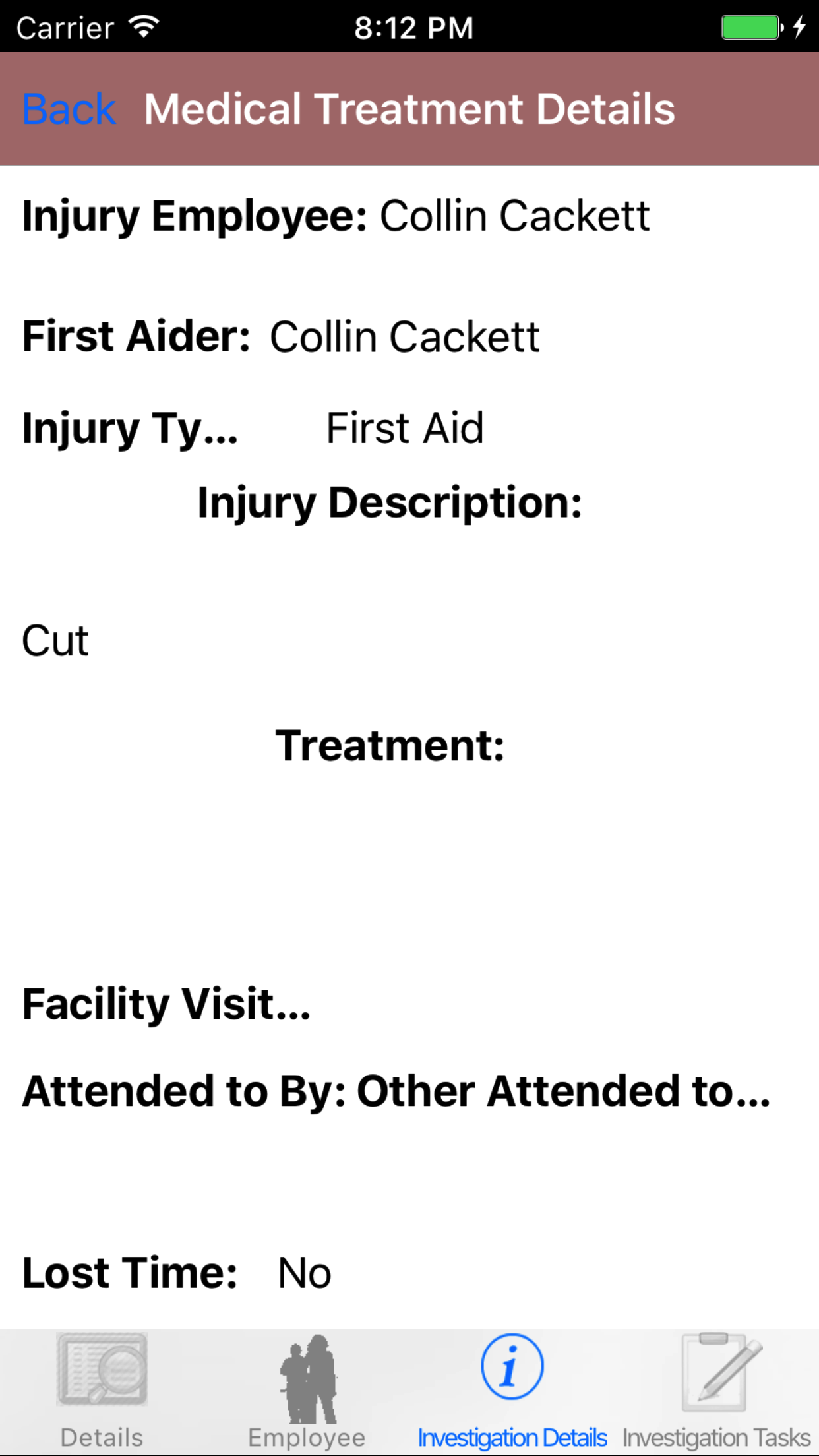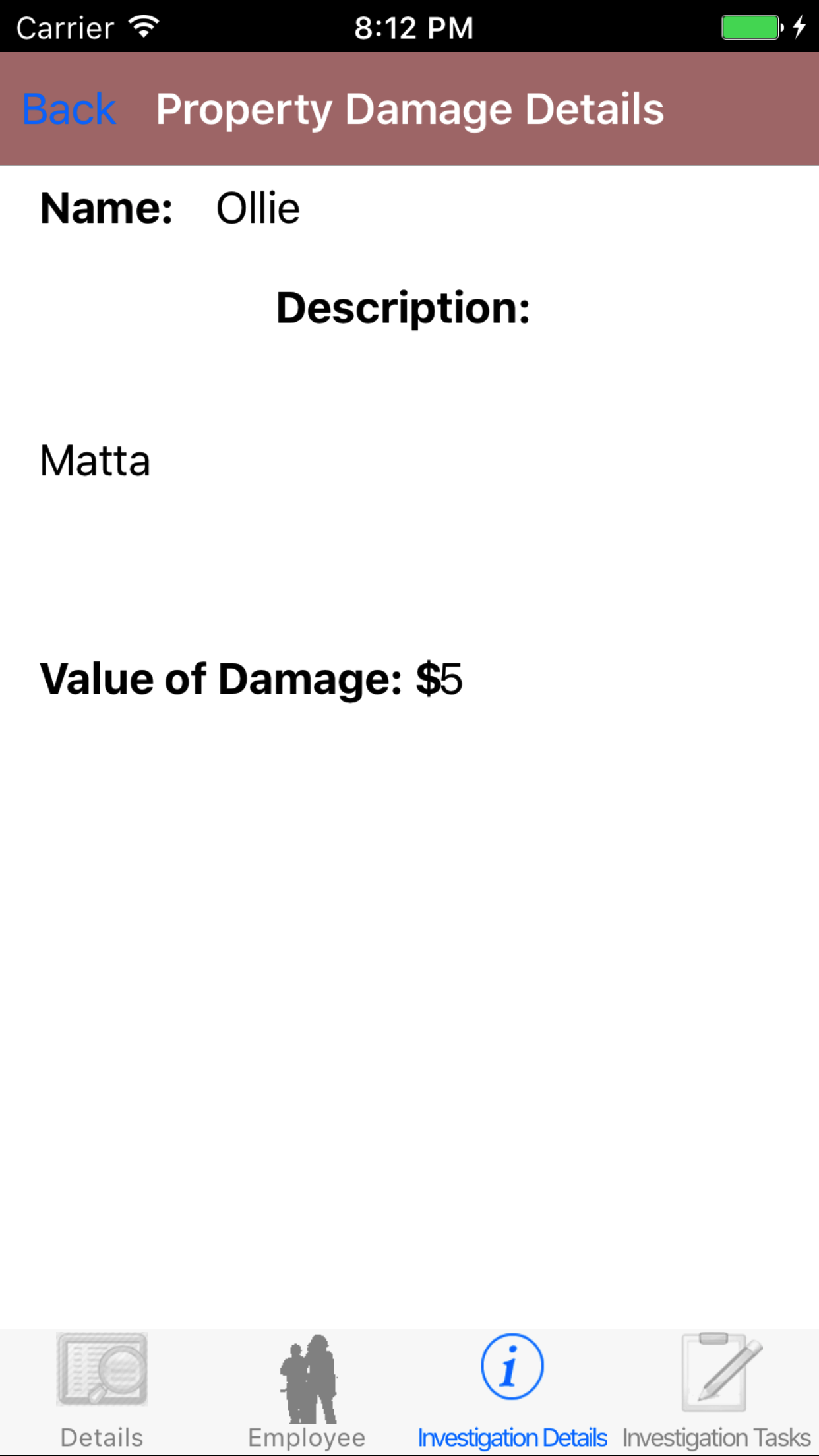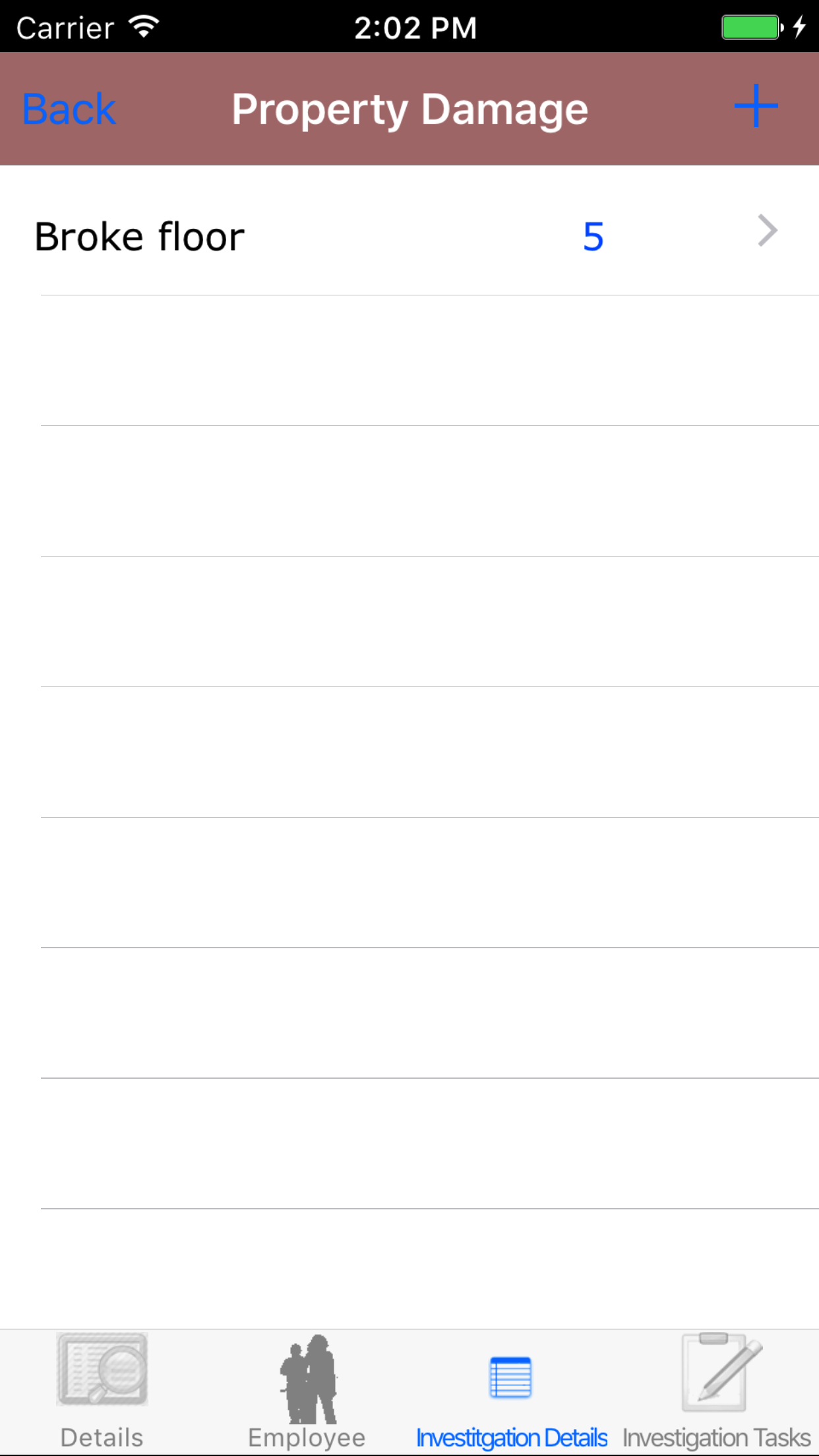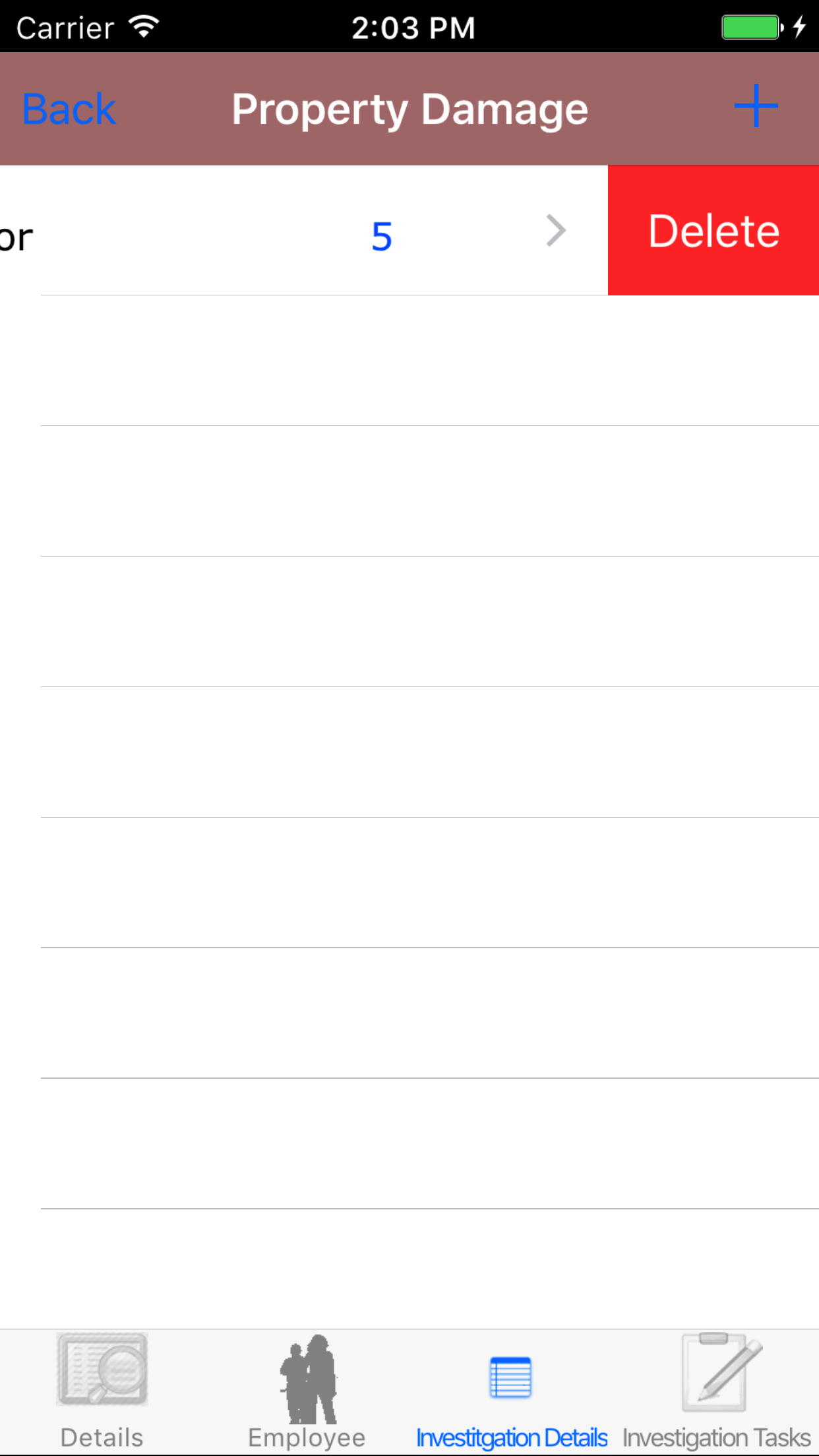- Tap the third tab, the Investigation Details tab of the History view. This loads with the medical treatment and property damage, tapping