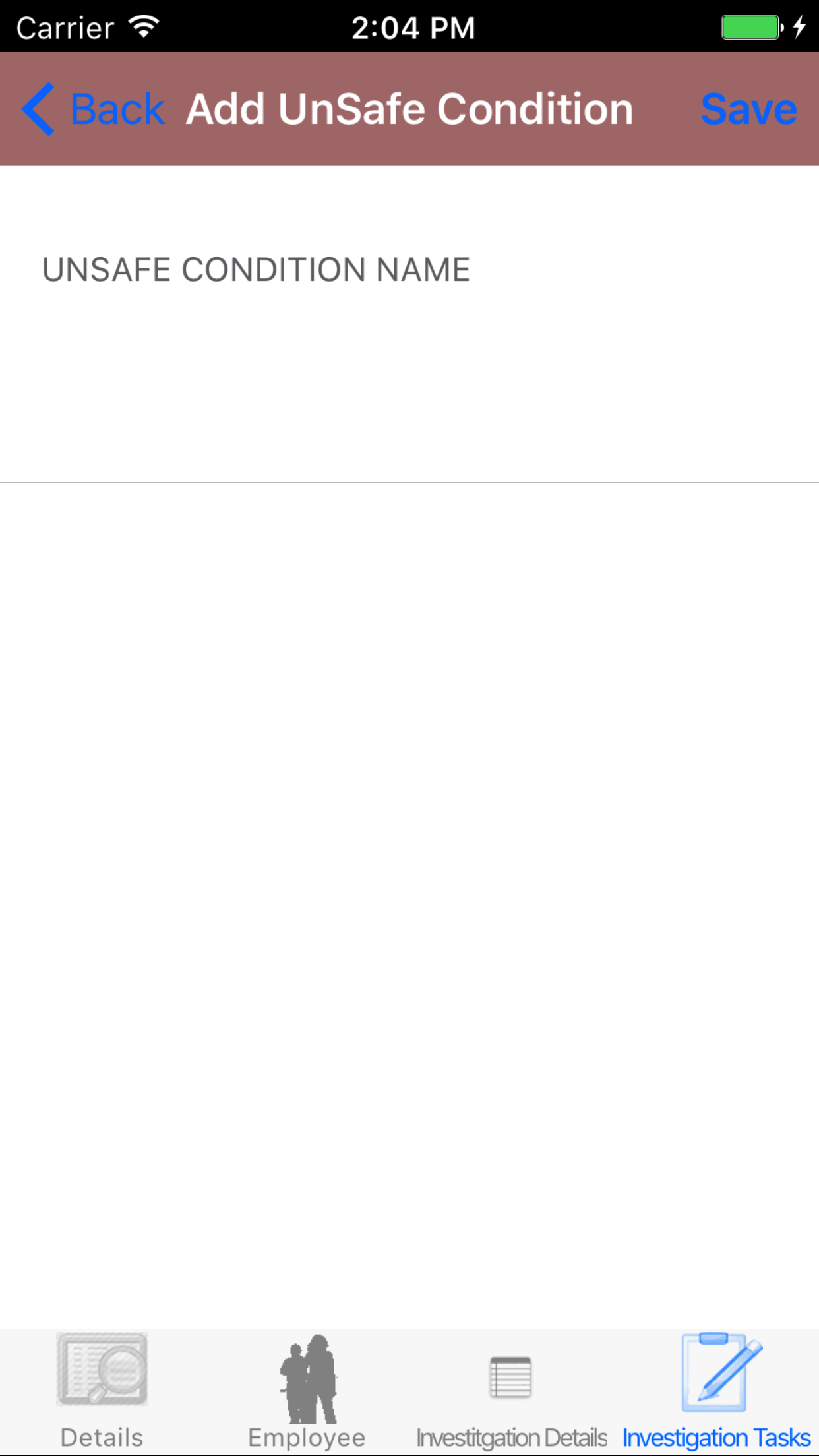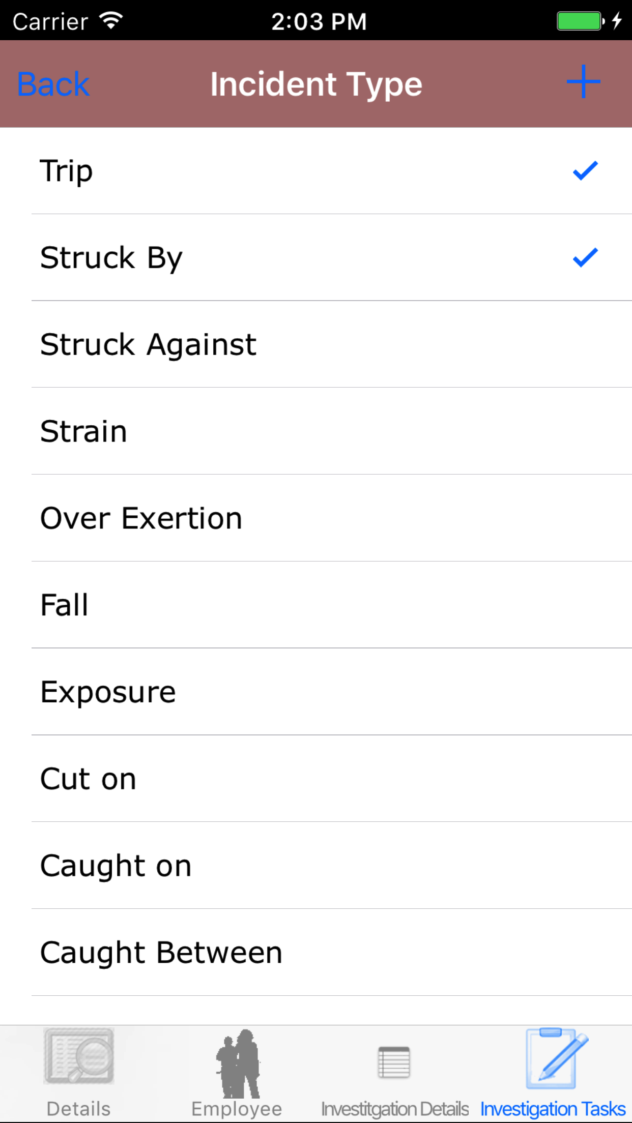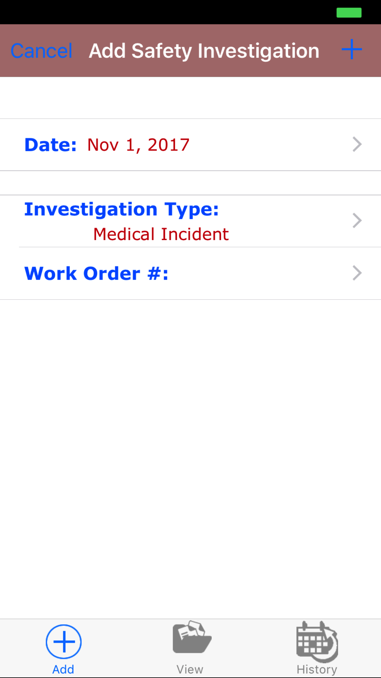 - Tap the + icon in the top right corner to add the Safety Investigation.