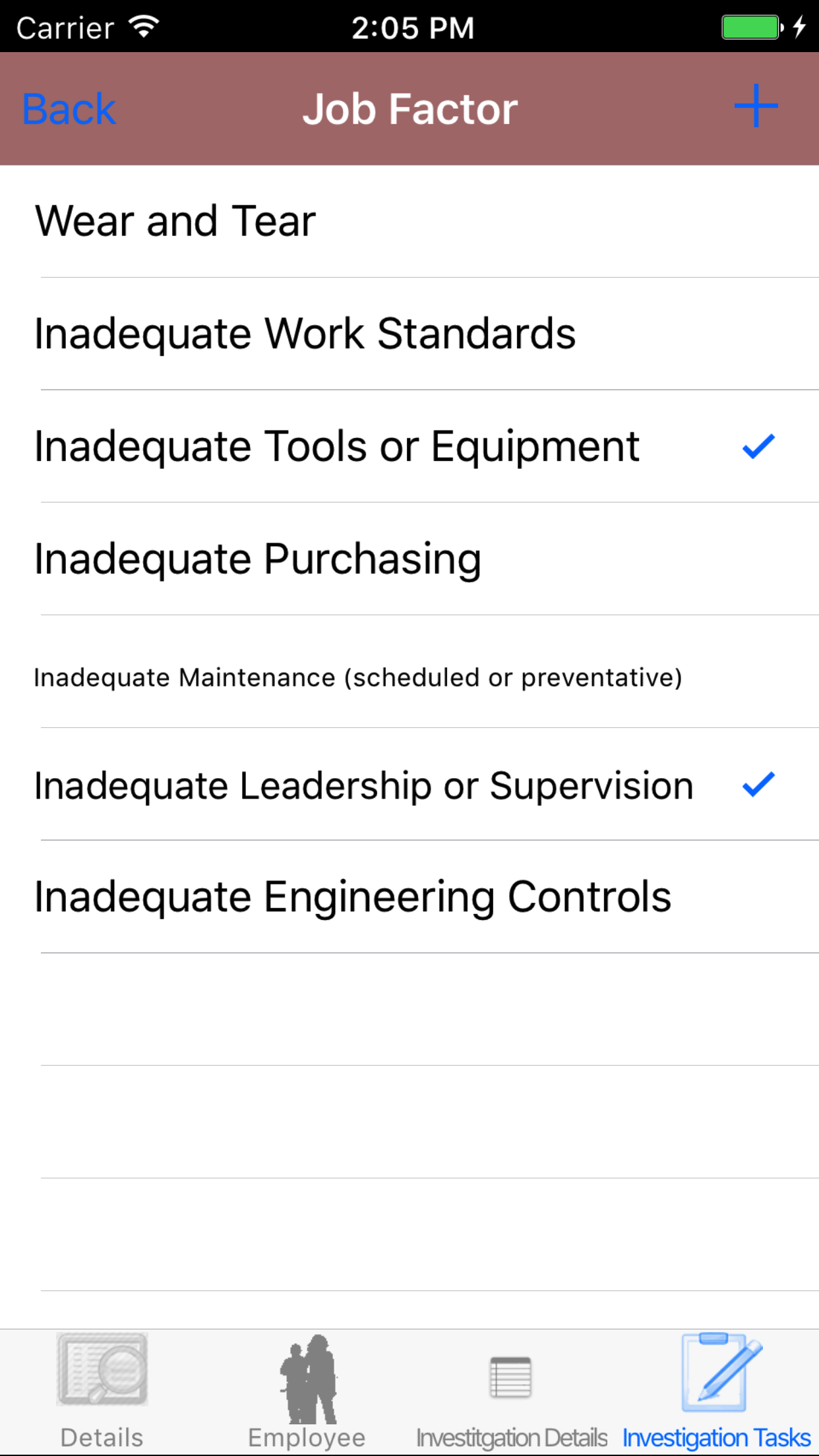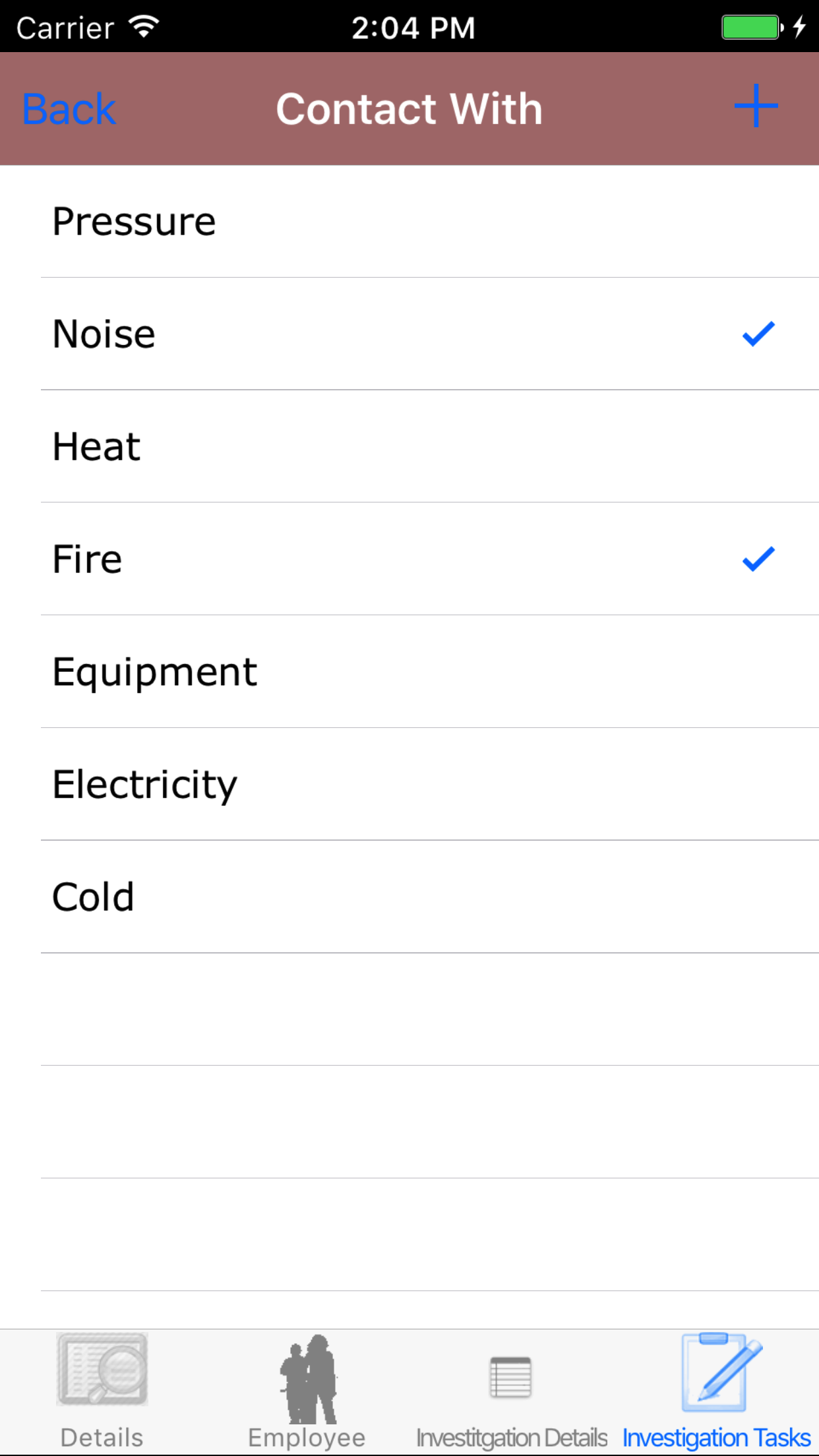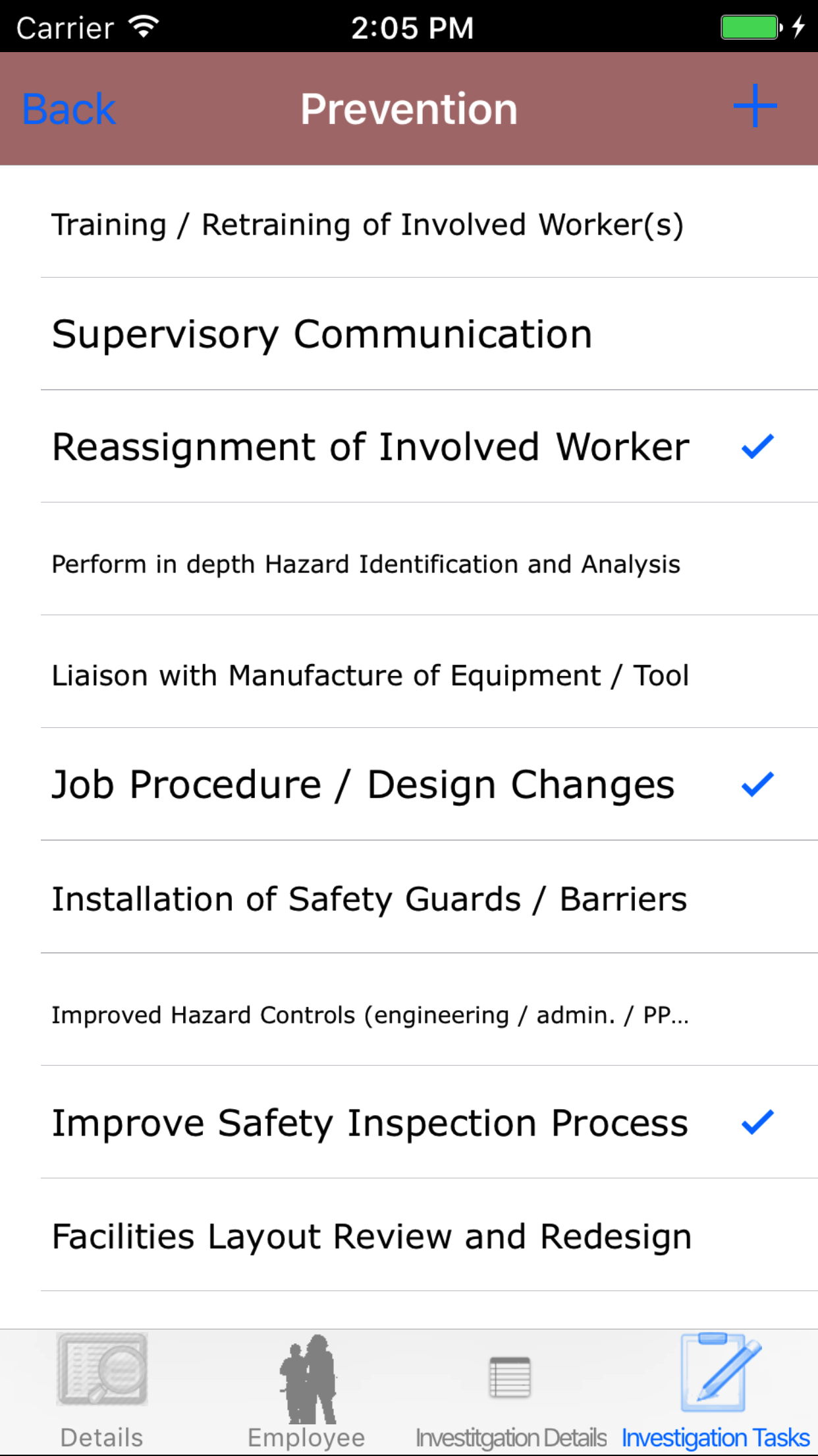 - Tap the + icon in the top right corner to add the Safety Investigation.